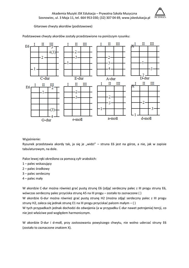 Akademia Muzyki JSK Edukacja – Prywatna Szkoła Muzyczna Sosnowiec, ul. 3 Maja 11, tel. 664 953 030; (32) 307 04 69, www.jskedukacja.pl Gitarowe chwyty akordów (podstawowe) Podstawowe chwyty akordów zostały przedstawione na poniższym rysunku: Wyjaśnienie: Rysunek przedstawia akordy tak, ja się je „widzi” – struna E6 jest na górze, a nie, jak w zapisie tabulaturowym, na dole. Palce lewej ręki określono za pomocą cyfr arabskich: 1 – palec wskazujący 2 – palec środkowy 3 – palec serdeczny 4 – palec mały W akordzie C-dur można również grać pustą strunę E6 (zdjąć serdeczny palec z III progu struny E6, wówczas serdeczny palec przyciska strunę A5 na III progu – zostało to zaznaczone ( ) W akordzie G-dur można również grać pustą strunę H2 (można zdjąć serdeczny palec z III progu struny H2, zaleca się jednak strunę E1 na III progu przyciskać palcem małym – ( ) W tych przypadkach jednak dochodzi do zdwojenia (a w przypadku C-dur nawet potrojenia) tercji, co nie jest właściwe pod względem harmonicznym. W akordzie D-dur i d-moll, przy zastosowaniu powyższego chwytu, nie wolno uderzać struny E6 (zostało to zaznaczone znakiem X). Akademia Muzyki JSK Edukacja – Prywatna Szkoła Muzyczna Sosnowiec, ul. 3 Maja 11, tel. 664 953 030; (32) 307 04 69, www.jskedukacja.pl Te same akordy w zapisie tabulaturowym przedstawiają się następująco: Aby grać akordami, należy przede wszystkim nauczyć się przechodzić z jednego chwytu na drugi. Dobrze jest zacząć od połączeń takich akordów, w których występują te same dźwięki, dzięki czemu lewa ręka zyskuje „punkt oparcia”, jeden lub więcej palców zostaje na tym samym miejscu, a przejście z jednego akordu na drugi ogranicza się do przestawienia jednego lub więcej palców w odpowiednie miejsce lub takich akordów, które są podobne do siebie. a-moll i C-dur Najłatwiejszym połączeniem jest przejście z akordu a-moll na C-dur. Rozpoczynamy od akordu a-moll, układając palce zgodnie z powyższym rysunkiem. Aby przejść z a-moll na C-dur wystarczy pozostawić palce 1 i 2 na tych samych miejscach, natomiast palec 3 - serdeczny przenieść ze struny G3 na III próg struny A5 (lub lepiej na III próg struny E6 i dołożyć palec 4 – mały na III próg struny A5 (zob. rysunek). a-moll i E-dur (e-moll) Chwyty tych akordów są najbardziej podobne do siebie. Rozpoczynamy od akordu a-moll, układając palce zgodnie z powyższym rysunkiem. Aby uzyskać akord E-dur, należy każdy z palców przenieść na strunę „wyżej”, czyli palec 1-wskazujący z I progu struny H2 na I próg struny G3, palec 2 –środkowy z II progu struny D4 na II próg struny A5, a palec 3 z II progu struny G3 na II próg struny D4. Aby uzyskać akord e-moll należy podnieść palec 1-wskazujący i nie przyciskać nim żadnej ze strun, natomiast palce 2-środkowy i 3-serdeczny przenieść analogicznie, jak w przypadku przejścia na akord E-dur. e-moll (E-dur) i A-dur Rozpoczynamy od akordu e-moll, układając palce zgodnie z powyższym rysunkiem. Aby uzyskać akord A-dur, należy każdy z palców przenieść na strunę „niżej” i dodatkowo przycisnąć palcem 4-małym strunę H2 na II progu. W przypadku przejścia z akordu E-dur należy dodatkowo podnieść palec 1wskazujący i nie przyciskać nim żadnej ze strun. d-moll (D-dur) i G-dur Rozpoczynamy od akordu d-moll lub D-dur, układając palce zgodnie z powyższym rysunkiem. Aby uzyskać akord G-dur, należy palcem 4-małym przycisnąć strunę E1 na III progu, natomiast palcem 2środkowym przycisnąć strunę E6 na III progu, a palcem 1-wskazującym strunę A5 na II progu. UWAGA: Powyższe przejścia należy wykonywać „tam i z powrotem”, np. a-moll – C-dur – a-moll – C-dur. Akademia Muzyki JSK Edukacja – Prywatna Szkoła Muzyczna Sosnowiec, ul. 3 Maja 11, tel. 664 953 030; (32) 307 04 69, www.jskedukacja.pl Należy ćwiczyć wszystkie możliwe kombinacje połączeń dwóch akordów. Po względnym opanowaniu połączeń dwóch akordów należy ćwiczyć dane przejście z metronomem w tempie dostosowanym do możliwości ucznia, na zasadzie każdy akord trwa 4 uderzenia metronomu. Czas pomiędzy pierwszym i czwartym uderzeniem metronomu może być użyty do zmiany akordu, a więc uderzamy w struny, wydobywając dany akord i niezwłocznie przystępujemy do zmiany na akord docelowy, czekamy aż upłyną cztery uderzenia metronomu i wydobywamy drugi akord dokładnie na pierwsze uderzenie z kolejnej sekwencji czterech uderzeń metronomu. Następnie należy próbować wykonywać poszczególne połączenia akordowe, zwiększając „w sposób niezauważalny” tempo metronomu (a więc np. 60, 63, 66, 69, 72, 75 itd.). Celem ćwiczenia jest wykształcenie umiejętności natychmiastowej zmiany jednego akordu na drugi, tak aby jeden akord mógł trwać odpowiednio długo (np. pełne 4 uderzenia metronomu), a czas samej zmiany był na tyle krótki, aby nie wpływał na wykonanie muzyki.