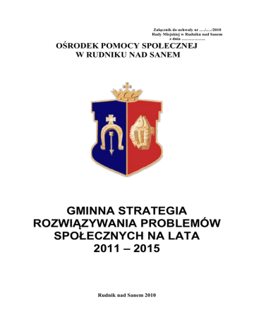 Załącznik do uchwały nr .…/.…/2010 Rady Miejskiej w Rudniku nad Sanem z dnia …………….. OŚRODEK POMOCY SPOŁECZNEJ W RUDNIKU NAD SANEM GMINNA STRATEGIA ROZWIĄZYWANIA PROBLEMÓW SPOŁECZNYCH NA LATA 2011 – 2015 Rudnik nad Sanem 2010 Na dziesięć osób, które przychodzą prosić mnie o pomoc, wolę być oszukany przez dziewięciu, aniżeli – odesłać z pustymi rękami jednego człowieka będącego rzeczywiście w potrzebie. Jan XXIII 2 Spis treści. Wstęp 5 I. Diagnoza 8 1. Charakterystyka gminy 8 2. Organizacja systemu pomocy społecznej 10 2.1. Podstawy prawne funkcjonowania systemu pomocy społecznej 10 2.2. Organizacja Ośrodka Pomocy Społecznej w Rudniku nad Sanem 14 2.3. Zadania w zakresie pomocy społecznej oraz rodzaje świadczeń z pomocy społecznej 15 2.4. Struktura wydatków Ośrodka Pomocy Społecznej w 2009 r. 19 3. Diagnoza problemów społecznych występujących na terenie gminy Rudnik nad Sanem 20 3.1. Ubóstwo 23 3.2. Bezrobocie 25 3.3. Choroba 26 3.4. Bezradność w sprawach opiekuńczo – wychowawczych 27 3. 5. Niepełnosprawność 28 3. 6. Wielodzietność 32 3. 7. Alkoholizm 32 3. 8. Potrzeba ochrony macierzyństwa 34 3. 9. Przemoc w rodzinie 35 3. 10. Bezdomność 36 3.11 Trudności w przystosowaniu się po opuszczeniu zakładu karnego 36 4. Dane o liczbie rodzin i osób korzystających z pomocy Ośrodka Pomocy Społecznej w Rudniku nad Sanem w pierwszym półroczu 2010 r. 38 II. Podsumowanie wdrażania Gminnej Strategii Rozwiązywania Problemów Społecznych na lata 2005 – 2010. 39 3 III. Strategia rozwiązywania problemów społecznych 46 1. Analiza swot 47 2. Cel główny 48 2.1. Pomoc na rzecz rodzin i osób dotkniętych problemem ubóstwa 49 2.2. Pomoc na rzecz rodzin w których występuje zjawisko bezrobocia 50 2.3. Pomoc na rzecz osób niepełnosprawnych 52 2.4. Pomoc na rzecz rodzin w których występuje zjawisko przemocy 54 2.5. Pomoc na rzecz osób starszych 56 2.6. Pomoc na rzecz osób z problemami alkoholowymi 58 2.7. Pomoc na rzecz dzieci przebywających poza ich naturalnym środowiskiem 60 Zakończenie 62 4 Wstęp. Pomoc społeczna działa w sytuacjach, w których zostały zagrożone podstawowe warunki egzystencji osoby lub rodziny, bądź też jakość ich życia obniżyła się poniżej społecznie akceptowanego minimum. Celem pomocy jest zaspokojenie niezbędnych potrzeb życiowych osób i rodzin. Realizacja zadań wynikających z potrzeb ma umożliwić osobom i rodzinom bytowanie w warunkach odpowiadających godności człowieka. Diagnoza problemów społecznych występujących na terenie Gminy i Miasta Rudnik nad Sanem została sporządzona na podstawie danych pochodzących z Ośrodka Pomocy Społecznej w Rudniku nad Sanem, Powiatowego Urzędu Pracy w Nisku, Urzędu Gminy i Miasta w Rudniku nad Sanem i danych opracowanych przez Główny Urząd Statystyczny. W oparciu o diagnozę została opracowana strategia rozwiązywania problemów społecznych na najbliższe lata tj. 2011 – 2015. Ma ona pomóc w rozszerzeniu i pogłębieniu form pracy socjalnej. Misją strategii jest wypracowanie skutecznego modelu wsparcia dla osób tego wymagających poprzez skoordynowanie działań instytucji zajmujących się udzielaniem pomocy społecznej. Oznacza to wypracowanie i poszerzenie współpracy z różnymi instytucjami i organizacjami pozarządowymi zajmującymi się organizowaniem pomocy społecznej oraz instytucjami działającymi w sferze pomocy społecznej takimi jak: jednostki oświatowe, służba zdrowia, sądownictwo, policja. Rozwiązywaniem problemów społecznych w Ośrodku Pomocy Społecznej zajmują się pracownicy socjalni, którzy pracują w sześciu rejonach. Mają oni bezpośredni kontakt ze środowiskiem, w związku z czym diagnozują i podejmują decyzje 5 o przyznaniu właściwej pomocy. Najczęściej występującymi problemami, które były powodem przyznania w ostatnich latach pomocy były: ubóstwo, bezrobocie, bezradność w sprawach opiekuńczo – wychowawczych, choroba, niepełnosprawność, potrzeba ochrony macierzyństwa, alkoholizm, bezdomność, sieroctwo oraz trudności w przystosowaniu się do życia po opuszczeniu zakładu karnego. Podstawą opracowania strategii jest zapis art.17 ust. 1 ustawy z dnia 12 marca 2004 r. o pomocy społecznej (Dz. U. z 2009 r. Nr 175, poz. 1362 z późn. zm.), w którym enumeratywnie wymieniono zadania własne gminy o charakterze obowiązkowym, wśród których w punkcie 1 zapisano: „opracowanie i realizacja gminnej strategii rozwiązywania problemów społecznych ze szczególnym uwzględnieniem programów pomocy społecznej, profilaktyki i rozwiązywania problemów alkoholowych i innych, których celem jest integracja osób i rodzin z grup szczególnego ryzyka;”. Niniejsza strategia wpisuje się w założenia Strategii Rozwoju Województwa Podkarpackiego na lata 2007 – 2020, w której w obszarze Zabezpieczenie społeczne określono główny cel strategiczny – „Integracja działań w zakresie pomocy społecznej”. W ramach celu strategicznego wyodrębniono cztery priorytety: - wspieranie działań na rzecz osób zagrożonych marginalizacją i wykluczeniem społecznym; - tworzenie warunków dla rozwoju rodziny i opieki nad dziećmi; - rozbudowa i modernizacja infrastruktury pomocy społecznej oraz rozwój zawodowy kadr pomocy społecznej; - propagowanie i rozwijanie obywatelskiego uczestnictwa w zaspokajaniu ludzkich potrzeb. Strategia składa się z dwóch części. Pierwsza zawiera diagnozę problemów społecznych, w ramach której scharakteryzowano gminę oraz system organizacji pomocy społecznej. Część druga zawiera podsumowanie realizacji dotychczas obowiązującej Gminnej Strategii Rozwiązywania Problemów Społecznych na lata 2005-2010 oraz założenia na lata 2011-2015. Ramy czasowe niniejszego dokumentu wynikają z logiki konstruowania dokumentów strategicznych. Obecnie brak jest opracowanych dokumentów strategicznych oraz założeń programowy