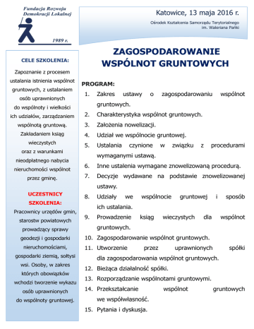 13 maja 2016 r. RozwiązaniaKatowice, informatyczne Ośrodek Kształcenia Samorządu Terytorialnego im. Waleriana Pańki ZAGOSPODAROWANIE WSPÓLNOT GRUNTOWYCH CELE SZKOLENIA: Zapoznanie z procesem ustalania istnienia wspólnot gruntowych, z ustalaniem osób uprawnionych PROGRAM: 1. Zakres ustawy o zagospodarowaniu gruntowych. do wspólnoty i wielkości ich udziałów, zarządzaniem 2. Charakterystyka wspólnot gruntowych. wspólnotą gruntową. 3. Założenia nowelizacji. Zakładaniem ksiąg 4. Udział we wspólnocie gruntowej. wieczystych 5. Ustalania oraz z warunkami nieodpłatnego nabycia nieruchomości wspólnot przez gminę. wspólnot czynione w związku z procedurami wymaganymi ustawą. 6. Inne ustalenia wymagane znowelizowaną procedurą. 7. Decyzje wydawane na podstawie znowelizowanej ustawy. UCZESTNICY SZKOLENIA: Pracownicy urzędów gmin, starostw powiatowych prowadzący sprawy geodezji i gospodarki nieruchomościami, gospodarki ziemią, sołtysi wsi. Osoby, w zakres których obowiązków wchodzi tworzenie wykazu osób uprawnionych do wspólnoty gruntowej. 8. Udziały we wspólnocie gruntowej i sposób ich ustalania. 9. Prowadzenie ksiąg wieczystych dla wspólnot gruntowych. 10. Zagospodarowanie wspólnot gruntowych. 11. Utworzenie przez uprawnionych spółki dla zagospodarowania wspólnot gruntowych. 12. Bieżąca działalność spółki. 13. Rozporządzanie wspólnotami gruntowymi. 14. Przekształcanie we współwłasność. 15. Pytania i dyskusja. wspólnot gruntowych DANE DO KONTAKTU: Ośrodek Kształcenia Samorządu Terytorialnego im. Waleriana Pańki 40-014 Katowice ul. Mariacka 1 NIP: 522-000-18-95 Tel 32 259 86 73, 32 253 84 09 Fax. 32 259 86 73 w. 22, 26 e-mail: [email protected] www.okst.pl OSOBA DO KONTAKTU: Renata Bąk tel. 32 206 80 39, 32 206 98 43 w. 24 [email protected] KOD SZKOLENIA MIEJSCE SZKOLENIA: Katowice, siedziba Ośrodka, ul. Mariacka 1, II piętro. Mapkę dojazdu do miejsca szkolenia znajdą na www.okst.pl/dojazd TERMIN SZKOLENIA: Katowice: 13 maja 2016 r., godz. 10.00 – 15.00 CENA: 329 zł netto/os. Udział w szkoleniu zwolniony z VAT w przypadku finansowania szkolenia ze środków publicznych. Cena zawiera materiały szkoleniowe, zaświadczenie o ukończeniu szkolenia, poczęstunek i serwis kawowy. ZGŁOSZENIA: Wypełnioną kartę zgłoszenia należy przesłać mailem lub faksem lub poprzez formularz na www.okst.pl do 10 maja 2016 r. ☐ Katowice 546/16/B Nazwa nabywcy (dane do faktury) Adres nabywcy (ulica, nr domu, kod pocztowy, miejscowość) NIP Telefon Email 1. Imię i nazwisko uczestnika, stanowisko 2. Imię i nazwisko uczestnika, stanowisko 3. Imię i nazwisko uczestnika, stanowisko Państwo Oświadczam, że szkolenie dla ww. pracowników jest kształceniem zawodowym finansowanym w całości lub co najmniej 70% ze środków publicznych (proszę zaznaczyć właściwe) Członek FORUM (proszę zaznaczyć właściwe) UWAGA Ilość miejsc ograniczona. O udziale w szkoleniu decyduje kolejność zgłoszeń. Zgłoszenie na szkolenie musi zostać potwierdzone przesłaniem do Ośrodka karty zgłoszenia (mail, fax lub formularz na www.okst.pl). Brak pisemnej rezygnacji ze szkolenia najpóźniej na trzy dni robocze przed terminem szkolenia będzie równoznaczny z obciążeniem Państwa należnością za to szkolenie niezależnie od przyczyn rezygnacji. Płatność należy uregulować przelewem przed lub po szkoleniu (na przelewie prosimy podać nazwę szkolenia lub jego kod). NR RACHUNKU: BPH: 68-10600076-0000321000197618 TAK ☐ NIE ☐ TAK ☐ NIE ☐ PODPIS