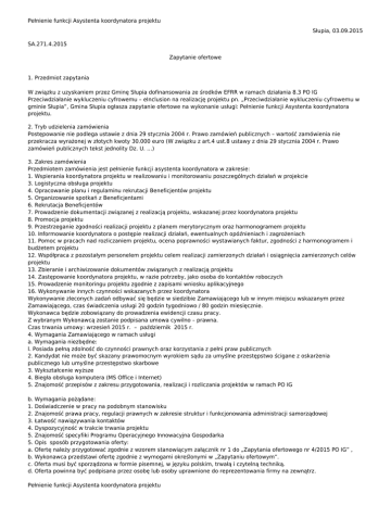 Pełnienie funkcji Asystenta koordynatora projektu Słupia, 03.09.2015 SA.271.4.2015 Zapytanie ofertowe 1. Przedmiot zapytania W związku z uzyskaniem przez Gminę Słupia dofinansowania ze środków EFRR w ramach działania 8.3 PO IG Przeciwdziałanie wykluczeniu cyfrowemu – eInclusion na realizację projektu pn. „Przeciwdziałanie wykluczeniu cyfrowemu w gminie Słupia”, Gmina Słupia ogłasza zapytanie ofertowe na wykonanie usługi: Pełnienie funkcji Asystenta koordynatora projektu. 2. Tryb udzielenia zamówienia Postępowanie nie podlega ustawie z dnia 29 stycznia 2004 r. Prawo zamówień publicznych – wartość zamówienia nie przekracza wyrażonej w złotych kwoty 30.000 euro (W związku z art.4 ust.8 ustawy z dnia 29 stycznia 2004 r. Prawo zamówień publicznych tekst jednolity Dz. U. …) 3. Zakres zamówienia Przedmiotem zamówienia jest pełnienie funkcji asystenta koordynatora w zakresie: 1. Wspierania koordynatora projektu w realizowaniu i monitorowaniu poszczególnych działań w projekcie 3. Logistyczna obsługa projektu 4. Opracowanie planu i regulaminu rekrutacji Beneficjentów projektu 5. Organizowanie spotkań z Beneficjentami 6. Rekrutacja Beneficjentów 7. Prowadzenie dokumentacji związanej z realizacją projektu, wskazanej przez koordynatora projektu 8. Promocja projektu 9. Przestrzeganie zgodności realizacji projektu z planem merytorycznym oraz harmonogramem projektu 10. Informowanie koordynatora o postępie realizacji działań, ewentualnych opóźnieniach i zagrożeniach 11. Pomoc w pracach nad rozliczaniem projektu, ocena poprawności wystawianych faktur, zgodności z harmonogramem i budżetem projektu 12. Współpraca z pozostałym personelem projektu celem realizacji zamierzonych działań i osiągnięcia zamierzonych celów projektu 13. Zbieranie i archiwizowanie dokumentów związanych z realizacją projektu 14. Zastępowanie koordynatora projektu, w razie potrzeby, jako osoba do kontaktów roboczych 15. Prowadzenie monitoringu projektu zgodnie z zapisami wniosku aplikacyjnego 16. Wykonywanie innych czynności wskazanych przez koordynatora Wykonywanie zleconych zadań odbywać się będzie w siedzibie Zamawiającego lub w innym miejscu wskazanym przez Zamawiającego, czas świadczenia usługi 20 godzin tygodniowo / 80 godzin miesięcznie. Wykonawca będzie zobowiązany do prowadzenia ewidencji czasu pracy. Z wybranym Wykonawcą zostanie podpisana umowa cywilno – prawna. Czas trwania umowy: wrzesień 2015 r. – październik 2015 r. 4. Wymagania Zamawiającego w ramach usługi a. Wymagania niezbędne: l. Posiada pełną zdolność do czynności prawnych oraz korzystania z pełni praw publicznych 2. Kandydat nie może być skazany prawomocnym wyrokiem sądu za umyślne przestępstwo ścigane z oskarżenia publicznego lub umyślne przestępstwo skarbowe 3. Wykształcenie wyższe 4. Biegła obsługa komputera (MS Office i Internet) 5. Znajomość przepisów z zakresu przygotowania, realizacji i rozliczania projektów w ramach PO IG b. Wymagania pożądane: 1. Doświadczenie w pracy na podobnym stanowisku 2. Znajomość prawa pracy, regulacji prawnych w zakresie struktur i funkcjonowania administracji samorządowej 3. Łatwość nawiązywania kontaktów 4. Dyspozycyjność w trakcie trwania projektu 5. Znajomość specyfiki Programu Operacyjnego Innowacyjna Gospodarka 5. Opis sposób przygotowania oferty: a. Ofertę należy przygotować zgodnie z wzorem stanowiącym załącznik nr 1 do „Zapytania ofertowego nr 4/2015 PO IG” , b. Wykonawca przedstawi ofertę zgodnie z wymogami określonymi w „Zapytaniu ofertowym”. c. Oferta musi być sporządzona w formie pisemnej, w języku polskim, trwałą i czytelną techniką. d. Oferta powinna być podpisana przez osobę lub osoby uprawnione do reprezentowania firmy na zewnątrz. Pełnienie funkcji Asystenta koordynatora projektu Pełnienie funkcji Asystenta koordynatora projektu e. Do oferty należy dołączyć CV oraz stosowne dokumenty potwierdzające wykształcenie, kwalifikacje i doświadczenie w pracy na podobnym stanowisku Przed podpisaniem umowy konieczne będzie przedłożenie w/w dokumentów do wglądu. 6 Miejsce, terminy i sposób składania ofert: a. Ofertę należy złożyć w siedzibie Zamawiającego – Urząd Gminy Słupia, Słupia 257, osobiście, pocztą pod w/w adres lub pocztą elektroniczną na adres: Urząd Gminy Słupia, Słupia 257, 28-350 Słupia Termin złożenia oferty: ofertę należy złożyć do dnia 08.09.2015 roku do godz. 12:00, za datę wpływu uznaje się datę wpływu do urzędu (nie datę nadania) b. W przypadku ofert składanych osobiście lub pocztą, ofertę należy złożyć w zamkniętym i nieprzezroczystym opakowaniu zaadresowanym do Zamawiającego z dopiskiem: „Asystent koordynatora 8.3 PO IG” c. Oferty złożone po terminie, niekompletne lub nie spełniające stawianych wymagań, nie będą rozpatrywane 8. Opis kryteriów wyboru oferty Kryterium oceny ofert – cena 100% Maksymalnie zdobyć można 100 punktów, wykonanie usługi pełnienia funkcji Asystenta koordynatora projektu zostanie zlecone Wykonawcy, który uzyska najwyższą ilość punktów. 1. Cena ofertowa powinna obejmować kompletne wykonanie przedmiotu zamówienia określonego w niniejszym zapytaniu ofertowym. 2. Oferta musi zawierać ostateczną cenę brutto/brutto za miesiąc za wykonanie przedmiotu zamówienia 3. Ostateczna cena oferty winna być zaokrąglona do dwóch miejsc po przecinku. 4. Rozliczenia pomiędzy Zamawiającym a Wykonawcą odbywać się będą w złotych polskich, na podstawie wystawionej przez Wykonawcę faktury (lub rachunku) 5. Wprowadzenie przez Wykonawcę jakichkolwiek zmian w druku „FORMULARZ OFERTY” spowoduje odrzucenie oferty. Zamawiający zastrzega sobie prawo do unieważnienia niniejszego postępowania bez podania przyczyny. 9. Informacja o wyborze najkorzystniejszej oferty: Informacja o wyborze najkorzystniejszej oferty zawierająca: nazwę (firmę), siedzib