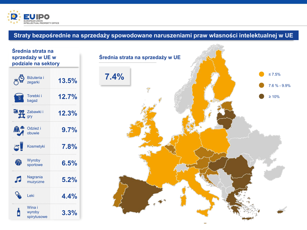 Straty bezpośrednie na sprzedaży spowodowane naruszeniami praw własności intelektualnej w UE Średnia strata na sprzedaży w UE w podziale na sektory Średnia strata na sprzedaży w UE Biżuteria i zegarki 13.5% Torebki i bagaż 12.7% Zabawki i gry 12.3% Odzież i obuwie 9.7% Kosmetyki 7.8% Wyroby sportowe 6.5% Nagrania muzyczne 5.2% Leki 4.4% Wina i wyroby spirytusowe 3.3% 7.4% ≤ 7.5% 7.6 % - 9.9% ≥ 10% Bezpośrednia utrata stanowisk pracy spowodowana naruszeniami praw własności intelektualnej w UE Średnia utrata miejsc pracy w UE w podziale na sektory Biżuteria i zegarki 13.0% Torebki i bagaż 12.7% Zabawki i gry 12.4% Odzież i obuwie 8.9% Kosmetyki 8.1% Wyroby sportowe 6.5% Nagrania muzyczne 5.2% Leki 3.4% Wina i wyroby spirytusowe 3.1% Średnia utrata miejsc pracy w UE 7.9% < 7% 7% - 8.4% > 8.4% Strata na sprzedaży i utrata stanowisk pracy spowodowane naruszeniami praw własności intelektualnej Polska Kosmetyki Wina i wyroby spirytusowe Biżuteria i zegarki Torebki i bagaż Zabawki i gry Wyroby sportowe 546 zł 288 zł 191 zł 169 zł 136 zł 45 zł 11 zł Miliony Miliony Miliony Miliony Miliony Miliony Miliony Miliony 22 709 1 967 2 378 133 540 1 070 505 Stanowisk a pracy Stanowisk a pracy Stanowisk a pracy Stanowisk a pracy Stanowisk a pracy Stanowisk a pracy Stanowisk a pracy Not available Not available bezpośrednia utrata miejsc pracy straty bezpośrednie na sprzedaży Odzież i obuwie Leki 2 307 zł 1 522 zł Miliony Straty bezpośrednie na sprzedaży we wszystkich sektorach Bezpośrednia utrata miejsc pracy we wszystkich sektorach 5 215 zł Miliony 29 301 Stanowiska pracy Nagrania muzyczne Strata na sprzedaży i utrata stanowisk pracy spowodowane naruszeniami praw własności intelektualnej Unia Europejska Biżuteria i zegarki Torebki i bagaż Zabawki i gry Wina i wyroby spirytusowe Wyroby sportowe 110 575 zł 42 766 zł 19 763 zł 7 943 zł 6 638 zł 5 990 zł 5 334 zł 2 067 zł 713 zł bezpośrednia utrata miejsc pracy straty bezpośrednie na sprzedaży Odzież i obuwie Leki Kosmetyki Nagrania muzyczne Miliony Miliony Miliony Miliony Miliony Miliony Miliony Miliony Miliony 362 625 37 695 51 561 14 925 6 150 4 815 12 097 2 796 829 Stanowiska pracy Stanowiska pracy Stanowiska pracy Stanowiska pracy Stanowiska pracy Stanowiska pracy Stanowiska Stanowiska Stanowiska pracy pracy pracy Straty bezpośrednie na sprzedaży we wszystkich sektorach Bezpośrednia utrata miejsc pracy we wszystkich sektorach 201 788 zł Miliony 493 493 Stanowiska pracy + 147 824 zł Miliony 293 223 Stanowiska pracy straty pośrednie na sprzedaży w gospodarce UE pośrednia utrata miejsc pracy w gospodarce UE