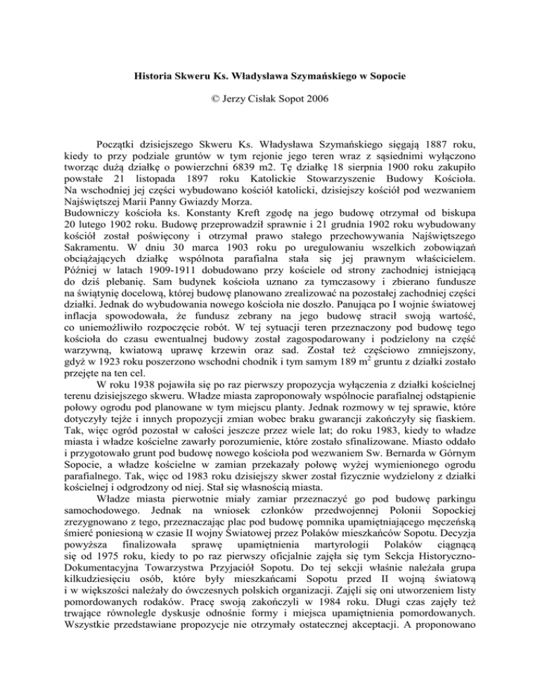 Historia Skweru Ks. Władysława Szymańskiego w Sopocie © Jerzy Cisłak Sopot 2006 Początki dzisiejszego Skweru Ks. Władysława Szymańskiego sięgają 1887 roku, kiedy to przy podziale gruntów w tym rejonie jego teren wraz z sąsiednimi wyłączono tworząc dużą działkę o powierzchni 6839 m2. Tę działkę 18 sierpnia 1900 roku zakupiło powstałe 21 listopada 1897 roku Katolickie Stowarzyszenie Budowy Kościoła. Na wschodniej jej części wybudowano kościół katolicki, dzisiejszy kościół pod wezwaniem Najświętszej Marii Panny Gwiazdy Morza. Budowniczy kościoła ks. Konstanty Kreft zgodę na jego budowę otrzymał od biskupa 20 lutego 1902 roku. Budowę przeprowadził sprawnie i 21 grudnia 1902 roku wybudowany kościół został poświęcony i otrzymał prawo stałego przechowywania Najświętszego Sakramentu. W dniu 30 marca 1903 roku po uregulowaniu wszelkich zobowiązań obciążających działkę wspólnota parafialna stała się jej prawnym właścicielem. Później w latach 1909-1911 dobudowano przy kościele od strony zachodniej istniejącą do dziś plebanię. Sam budynek kościoła uznano za tymczasowy i zbierano fundusze na świątynię docelową, której budowę planowano zrealizować na pozostałej zachodniej części działki. Jednak do wybudowania nowego kościoła nie doszło. Panująca po I wojnie światowej inflacja spowodowała, że fundusz zebrany na jego budowę stracił swoją wartość, co uniemożliwiło rozpoczęcie robót. W tej sytuacji teren przeznaczony pod budowę tego kościoła do czasu ewentualnej budowy został zagospodarowany i podzielony na część warzywną, kwiatową uprawę krzewin oraz sad. Został też częściowo zmniejszony, gdyż w 1923 roku poszerzono wschodni chodnik i tym samym 189 m2 gruntu z działki zostało przejęte na ten cel. W roku 1938 pojawiła się po raz pierwszy propozycja wyłączenia z działki kościelnej terenu dzisiejszego skweru. Władze miasta zaproponowały wspólnocie parafialnej odstąpienie połowy ogrodu pod planowane w tym miejscu planty. Jednak rozmowy w tej sprawie, które dotyczyły tejże i innych propozycji zmian wobec braku gwarancji zakończyły się fiaskiem. Tak, więc ogród pozostał w całości jeszcze przez wiele lat; do roku 1983, kiedy to władze miasta i władze kościelne zawarły porozumienie, które zostało sfinalizowane. Miasto oddało i przygotowało grunt pod budowę nowego kościoła pod wezwaniem Sw. Bernarda w Górnym Sopocie, a władze kościelne w zamian przekazały połowę wyżej wymienionego ogrodu parafialnego. Tak, więc od 1983 roku dzisiejszy skwer został fizycznie wydzielony z działki kościelnej i odgrodzony od niej. Stał się własnością miasta. Władze miasta pierwotnie miały zamiar przeznaczyć go pod budowę parkingu samochodowego. Jednak na wniosek członków przedwojennej Polonii Sopockiej zrezygnowano z tego, przeznaczając plac pod budowę pomnika upamiętniającego męczeńską śmierć poniesioną w czasie II wojny Światowej przez Polaków mieszkańców Sopotu. Decyzja powyższa finalizowała sprawę upamiętnienia martyrologii Polaków ciągnącą się od 1975 roku, kiedy to po raz pierwszy oficjalnie zajęła się tym Sekcja HistorycznoDokumentacyjna Towarzystwa Przyjaciół Sopotu. Do tej sekcji właśnie należała grupa kilkudziesięciu osób, które były mieszkańcami Sopotu przed II wojną światową i w większości należały do ówczesnych polskich organizacji. Zajęli się oni utworzeniem listy pomordowanych rodaków. Pracę swoją zakończyli w 1984 roku. Długi czas zajęły też trwające równolegle dyskusje odnośnie formy i miejsca upamiętnienia pomordowanych. Wszystkie przedstawiane propozycje nie otrzymały ostatecznej akceptacji. A proponowano wykonanie dwóch tablic, jedną wyłącznie z nazwiskami kolejarzy, ustawioną na placu przed dworcem kolejowym, drugą z resztą nazwisk wmurowaną w ścianę ratusza. Była to propozycja Północnej DOKP. Inną propozycją było ustawienie pomnika na skwerze w Parku Północnym, potem w Parku Południowym u zbiegu ulic Grunwaldzkiej i Kordeckiego. Był też projekt umieszczenia dużej tablicy na kamiennej ścianie będącej murem podfundamentowym kościoła św. Jerzego, od strony ul. Bohaterów Monte Cassino oraz ustawienia pomnika na terenie parku po północnej stronie ratusza vis a vis ulicy Marynarzy. Dopiero utworzony plac z podziału działki kościelnej okazał się najbardziej odpowiedni. Postanowiono, więc teren ten zamienić w skwer, którego centralnym punktem będzie pomnik. Wykonanie pomnika zlecono sopockiemu artyście Adamowi Smolanie. Zrezygnowano z przeprowadzenia konkursu, gdyż uszczupliłoby to fundusze na ten cel, które i tak nie były zbyt wysokie. Fachowość profesora i tak gwarantowała wywiązanie się ze zlecenia w sposób profesjonalny. Urbanistyczne ukształtowanie placu z przystosowaniem do funkcji centralnego miejsca pamięci narodowej Sopotu zlecono Gdańskiej Pracowni Sztuk Plastycznych. Wykonali je projektanci tej pracowni Izabela Berwetz-Smolana i Włodzimierz Stopa. Plany realizacyjne wykonali w porozumieniu z autorem pomnika. Prace koncepcyjnoprzygotowawcze trwały do wiosny 1984 roku, kiedy to przystąpiono do realizacji. W dniu 24 marca 1984 roku o godz. 11.30 odbyła się uroczystość wmurowania w przygotowany fundament pomnika aktu erekcyjnego. Do specjalnego pojemnika oprócz aktu erekcyjnego podpisanego przez prezydenta i wiceprezydenta Sopotu oraz sekretarzy komitetów miejskich PZPR, ZSL, SD, RM PRON włożono protokół weryfikacji nazwisk pomordowanych polskich mieszkańców Sopotu, medal 700-lecia Sopotu oraz egzemplarz „Głosu Wybrzeża" z artykułem poświęconym sprawom związanym z pomnikiem. Wmurowanie aktu rozpoczęło realizację zadania. Trwała ona 12 miesięcy. Koordynatorem całości prac organizacyjnych został Zenon Dorniak. Stały nadzór nad realizacją sprawowała mgr Ewa Gilas-Czerwińska z odpowiedzialnego za r