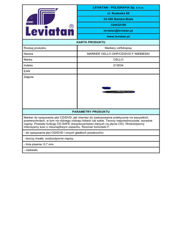 LEVIATAN - POLIGRAFIA Sp. z o.o. ul. Rudawka 88 43-300 Bielsko-Biała 334432100 [email protected] www.leviatan.pl KARTA PRODUKTU Rodzaj produktu Markery cd/foliopisy Nazwa MARKER CELLO OHP/CD/DVD F NIEBIESKI Marka CELLO Indeks 213034 EAN Zdjęcie PARAMETRY PRODUKTU Marker do opisywania płyt CD/DVD, jak również do zastosowania praktycznie na wszystkich powierzchniach, w tym na różnego rodzaju foliach lub szkle. Tworzy nieprzeźroczyste, wyraźne napisy. Posiada funkcję CD-SAFE (bezpieczeństwo danych na płycie CD). Wodoodporny intensywny tusz o nieuciążliwym zapachu. Rozmiar końcówki F. - do opisywania płyt CD/DVD i innych gładkich powierzchni - tworzy trwałe, wodoodporne napisy - linia pisania: 0,7 mm - niebieski