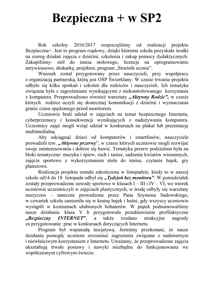 Bezpieczna + w SP2 Rok szkolny 2016/2017 rozpoczęliśmy od realizacji projektu Bezpieczna+. Jest to program rządowy, dzięki któremu szkoła pozyskała środki na szereg działań zajęcia z dziećmi, szkolenia i zakup pomocy dydaktycznych. Zakupiliśmy: stół do tenisa stołowego, licencje na oprogramowanie antywirusowe, drukarkę, projektor, program „Strażnik ucznia”. Wniosek został przygotowany przez nauczycieli, przy współpracy z organizacją partnerską, którą jest OSP Świerklany. W czasie trwania projektu odbyło się kilka spotkań i szkoleń dla rodziców i nauczycieli. Ich tematyka związana była z zagrożeniami wynikającymi z niekontrolowanego korzystania z komputera. Przeprowadzono również warsztaty „Aktywny Rodzic”, w czasie których rodzice uczyli się skutecznej komunikacji z dziećmi i wyznaczania granic czasu spędzanego przed monitorem. Uczniowie brali udział w zajęciach na temat bezpiecznego Internetu, cyberprzemocy i konsekwencji wynikających z nadużywania komputera. Uczestnicy zajęć mogli wziąć udział w konkursach na plakat lub prezentację multimedialną. Aby odciągnąć dzieci od komputerów i smartfonów, nauczyciele prowadzili tzw. „Aktywne przerwy”, w czasie których uczniowie mogli rozwijać swoje zainteresowania i dobrze się bawić. Tematyka przerw podzielona była na bloki tematyczne: muzyka i śpiew, ruch i taniec, sadzenie kwiatów wiosennych, zajęcia sportowe z wykorzystaniem stołu do tenisa, czytanie bajek, gry planszowe. Realizacja projektu została zakończona w listopadzie, kiedy to w naszej szkole od14 do 18 listopada odbył się „Tydzień bez monitora”. W poniedziałek zostały przeprowadzone zawody sportowe w klasach I – III i IV – VI, we wtorek uczniowie uczestniczyli w zajęciach plastycznych, w środę odbyły się warsztaty muzyczno – taneczne prowadzone przez Pana Szymona Sadowskiego, w czwartek szkoła zamieniła się w krainę bajek i baśni, gdy wszyscy uczniowie wystąpili w kostiumach ulubionych bohaterów. W piątek podsumowaliśmy nasze działania: klasa V b przygotowała przedstawienie profilaktyczne „Bezpieczny INTERNET”, a także rozdano atrakcyjne nagrody za przygotowanie prac w konkursach dotyczących Internetu. Program był wspaniałą inicjatywą. Jesteśmy przekonani, że nasze działania pomogły uczniom zrozumieć zagrożenia związane z nadmiernym i niewłaściwym korzystaniem z Internetu. Uważamy, że przeprowadzone zajęcia ukształtują trwałe postawy i nawyki niezbędne do funkcjonowania we współczesnym cyfrowym świecie.