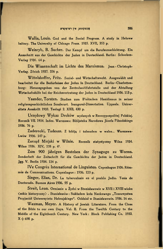 586 אנגעקומע; אין רצדאקציע WalHs, Louis. G o d and the Social Progress. A study in Hebrew hsitory. The University of Chicago Press. 1935. XVII, 353 p. Weinryb, B. Sucher. Ausschnitt aus der Geschichte Der Kampf um die Berufsumschichtung. E i n der Juden in Deutschland. Berlin: Schocken- Verlag 1936. 64 p. Die Wissenschaft im Lichte des Marxismus. Jean - Christoph- Verlag. Zttrich 1937. 326 p. Wittelshoffer, Fritz. Sozial- und Wirtschaftsrecht. Ausgewahlt und bearbeitet fur die Bedurfnisse der Juden in Deutschland. Berlin—Charlottenburg: Herausgegeben von der Zentralwohlfahrtstelle und der Abteilung Wirtschaf tshilfe bei der Reichsvertretung der Juden in Deutschland 1936.113 p. Ysander, Torsten. religionsgeschichtlichen Studien Sonderart. zum B'estschen Hasidismus in Inaugural-Dissertation. seiner Uppsala. Univer- sitets Arsskrift 1933. Teologi 2. XXII, 430 p. Urz^dowy Wykaz Drukow wydanych w Rzeczypospolitej Polskiej. Rocznik VII. 1934. Index. Warszawa: Bibljoteka Narodowa Jozefa Pilsudskiego 1936. 76 p. Zaderecki, Tadeusz. Z biblj3 i talmudem w walce... Warszawa- Lwow 1936. 147 p. Zarzqd Miejski Wilnie. W Rocznik statystyczny Wilna 1934. Wilno 1936. X I V , 238 p. 4°. Zum 900 jahrigen Bestehen Sonderheft der Synagoge der Zeitschrift fur die Geschichte zu Worms. der Juden in Deutschland. Jgg. V . Berlin 1934. 124 p. IVe Congres International de Linguistes. Copenhague 1936. Re'su- mes de Communications. Copenhague : 1936. 123 p. Singer, Elias, Dr. L a tuberculosis en el pueblo Judio. Tesis de Doctorado. Buenos Aires 1936. 55 p. Streit, Leon. Ormianie a Zydzi w StanisJawowie w XVII i XVIII wieku <szkic historyczny) . Stanislawow : Naktadem kola Naukowego ,,Towarzystwa Przyjaciol Uniwersytetu Hebrajskiego". Oddzia} w Stanislawowie. 1936. 16 str. Waxman, Meyer. A History of Jewish of the Bible to our own Days. V o l . II. From Middle of the Eighthenth Century. New Y o r k : X + 698 p. Literature. From the Close the Twelfth Century to the Bloch Publishing C o . 1933.