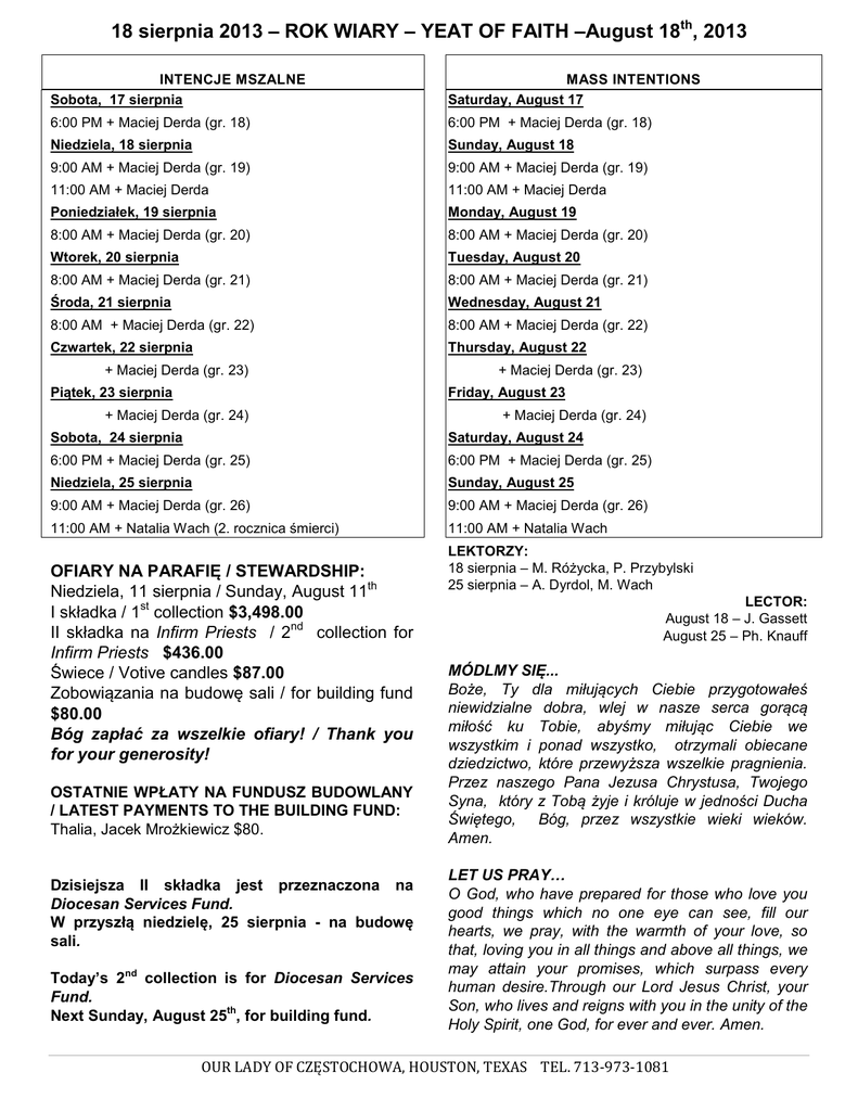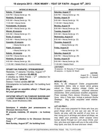 18 sierpnia 2013 – ROK WIARY – YEAT OF FAITH –August 18th, 2013 INTENCJE MSZALNE Sobota, 17 sierpnia MASS INTENTIONS Saturday, August 17 6:00 PM + Maciej Derda (gr. 18) 6:00 PM + Maciej Derda (gr. 18) Niedziela, 18 sierpnia Sunday, August 18 9:00 AM + Maciej Derda (gr. 19) 9:00 AM + Maciej Derda (gr. 19) 11:00 AM + Maciej Derda 11:00 AM + Maciej Derda Poniedziałek, 19 sierpnia Monday, August 19 8:00 AM + Maciej Derda (gr. 20) 8:00 AM + Maciej Derda (gr. 20) Wtorek, 20 sierpnia Tuesday, August 20 8:00 AM + Maciej Derda (gr. 21) 8:00 AM + Maciej Derda (gr. 21) Środa, 21 sierpnia Wednesday, August 21 8:00 AM + Maciej Derda (gr. 22) 8:00 AM + Maciej Derda (gr. 22) Czwartek, 22 sierpnia Thursday, August 22 + Maciej Derda (gr. 23) Piątek, 23 sierpnia + Maciej Derda (gr. 23) Friday, August 23 + Maciej Derda (gr. 24) + Maciej Derda (gr. 24) Sobota, 24 sierpnia Saturday, August 24 6:00 PM + Maciej Derda (gr. 25) 6:00 PM + Maciej Derda (gr. 25) Niedziela, 25 sierpnia Sunday, August 25 9:00 AM + Maciej Derda (gr. 26) 9:00 AM + Maciej Derda (gr. 26) 11:00 AM + Natalia Wach (2. rocznica śmierci) 11:00 AM + Natalia Wach OFIARY NA PARAFIĘ / STEWARDSHIP: Niedziela, 11 sierpnia / Sunday, August 11th I składka / 1st collection $3,498.00 II składka na Infirm Priests / 2nd collection for Infirm Priests $436.00 Świece / Votive candles $87.00 Zobowiązania na budowę sali / for building fund $80.00 Bóg zapłać za wszelkie ofiary! / Thank you for your generosity! OSTATNIE WPŁATY NA FUNDUSZ BUDOWLANY / LATEST PAYMENTS TO THE BUILDING FUND: Thalia, Jacek Mrożkiewicz $80. Dzisiejsza II składka jest przeznaczona na Diocesan Services Fund. W przyszłą niedzielę, 25 sierpnia - na budowę sali. Today’s 2nd collection is for Diocesan Services Fund. Next Sunday, August 25th, for building fund. LEKTORZY: 18 sierpnia – M. Różycka, P. Przybylski 25 sierpnia – A. Dyrdol, M. Wach LECTOR: August 18 – J. Gassett August 25 – Ph. Knauff MÓDLMY SIĘ... Boże, Ty dla miłujących Ciebie przygotowałeś niewidzialne dobra, wlej w nasze serca gorącą miłość ku Tobie, abyśmy miłując Ciebie we wszystkim i ponad wszystko, otrzymali obiecane dziedzictwo, które przewyższa wszelkie pragnienia. Przez naszego Pana Jezusa Chrystusa, Twojego Syna, który z Tobą żyje i króluje w jedności Ducha Świętego, Bóg, przez wszystkie wieki wieków. Amen. LET US PRAY… O God, who have prepared for those who love you good things which no one eye can see, fill our hearts, we pray, with the warmth of your love, so that, loving you in all things and above all things, we may attain your promises, which surpass every human desire.Through our Lord Jesus Christ, your Son, who lives and reigns with you in the unity of the Holy Spirit, one God, for ever and ever. Amen. OUR LADY OF CZĘSTOCHOWA, HOUSTON, TEXAS TEL. 713-973-1081 18 sierpnia 2013 – ROK WIARY – YEAT OF FAITH –August 18th, 2013 ZMIANY W PROGRAMIE MSZY ŚW. W tym i następnym tygodniu nastąpią drobne zmiany w programie Mszy św. Nie będzie Mszy św. 22 i 26 sierpnia rano (czwartek i poniedziałek). Msza św. w piątki powróci na stałe 6 września. CHANGE IN MASS SCHEDULE This and next week there will be small changes to the Holy Mass schedule. There will be no morning Holy Mass August 22nd and 26th (Thursday and Monday). Holy Mass on Fridays will return September 6th. UROCZYSTOŚĆ MATKI BOSKIEJ CZĘSTOCHOWSKIEJ Msza św. uroczystości Matki Boskiej Częstochowskiej zostanie odprawiona 26 sierpnia, o godz. 7:00 wieczorem. OUR LADY OF CZESTOCHOWA CELEBRATION Holy Mass to celebrate the feast of Our Lady of Częstochowa will take place August 26th, at 7:00 p.m. BAL NA ZAKOŃCZENIE WAKACJI Zapraszamy na bal na zakończenie wakacji, który odbędzie się w sali parafialnej, w sobotę, 7 września, o godz. 7:00 wieczorem. Bilety w cenie $80, młodzież (w wieku do 21 lat) $40 rozprowadza Ewa Dumana (832) 630.2858 i Róża Ekimov (281) 440.7995. Całkowity dochód z balu zostanie przeznaczony na budowę zadaszenia nad sceną. END OF SUMMER VACATION BALL We would like to invite everyone to a ball to celebrate the end of summer vacation. It will take place on Saturday, September 7th, at 7:00 p.m. Tickets cost $80, (youth up to 21 years old - $40), and can be purchased from Ewa Dumana (832) 630-2858 and Róża Ekimov (281) 440-7995. The income from the ball will be used for the construction of the roof above the stage. DOŻYNKI Rozpoczęły się już przygotowania do naszego jesiennego festiwalu „Dożynki”. W tym roku jego organizacji podjęli się Krzysztof Króżel i Bobby Giles. Dziękujemy! DOŻYNKI – POLISH HARVEST FESTIVAL Preparations have began for our fall festival „Dożynki”. This year Krzysztof Króżel and Bobby Giles have agreed to be the main organizers. Thank You! DZIĘKUJEMY! Raz jeszcze dziękujemy Dawidowi i Ewelinie Drewnianym oraz Marii i Kindze Czajkom za przygotowanie wyśmienitego lunchu w niedzielę, 4 sierpnia. THANK YOU! Once again, thank you to Dawid and Ewelina Drewniany as well as Maria and Kinga Czajka for preparing a delicious lunch on Sunday, August 4th. + ANASTAZJA (NANCY) SHORT Msze św. w intencji najstarszej naszej parafianki, która odeszła do Pana w niedzielę 28 lipca, zostaną odprawione w następujących dniach: 20 października, 17 listopada i 22 grudnia. R. I. P. PRACA Parafia poszukuje osoby chętnej do podjęcia obowiązków menadżera sali parafialnej. Chodzi o zorganizowanie systemu wynajmowania jej i troski o jej funkcjonowanie w czasie imprez. Wynagrodzenie na zasadzie prowizji. Pisemne oferty należy przesyłać na adres proboszcza. PRZYGOTOWANIE DO PIERWSZEJ KOMUNII ŚW. Zgodnie z obowiązującym w archidiecezji curriculum katechetycznym przygotowanie do sakramentów wtajemniczenia chrześcijańskiego musi obejmować dwa lata nauki. Stąd nowy kurs przygotowania do pierwszej komunii św. rozpocznie się w tym roku szkolnym a zakończy w roku 2015. W pierwszym roku zajęcia katechezy będą 
