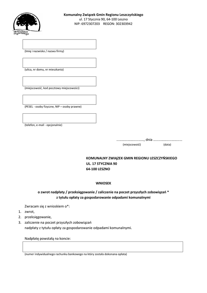 Komunalny Związek Gmin Regionu Leszczyńskiego ul. 17 Stycznia 90, 64-100 Leszno NIP: 6972307203 REGON: 302303942 (Imię i nazwisko / nazwa firmy) (ulica, nr domu, nr mieszkania) (miejscowość, kod pocztowy miejscowości) (PESEL - osoby fizyczne, NIP – osoby prawne) (telefon, e-mail - opcjonalnie) ………….………………, dnia …………………………… (miejscowość) (data) KOMUNALNY ZWIĄZEK GMIN REGIONU LESZCZYŃSKIEGO UL. 17 STYCZNIA 90 64-100 LESZNO WNIOSEK o zwrot nadpłaty / przeksięgowanie / zaliczenie na poczet przyszłych zobowiązań * z tytułu opłaty za gospodarowanie odpadami komunalnymi Zwracam się z wnioskiem o*: 1. zwrot, 2. przeksięgowanie, 3. zaliczenie na poczet przyszłych zobowiązań nadpłaty z tytułu opłaty za gospodarowanie odpadami komunalnymi. Nadpłatę powstałą na koncie: (numer indywidualnego rachunku bankowego na który została dokonana opłata) Komunalny Związek Gmin Regionu Leszczyńskiego ul. 17 Stycznia 90, 64-100 Leszno NIP: 6972307203 REGON: 302303942 w wysokości: Kwota: Słownie: ……………………………………………………………………………………………………………………………………………… ……………………………………………………………………………………………………………………………………………… Proszę *: a. przelać na następujący rachunek bankowy: b. przeksięgować na konto: c. zaliczyć na okres: Uzasadnienie wniosku: …………………………………………………………………………………………………………………………………………………………… …………………………………………………………………………………………………………………………………………………………… ………………………………………………………………………………………………………………………………………………………… …………………………………………… (podpis wnioskodawcy) * - właściwe podkreślić POUCZENIE 1. Wniosek winien być wypełniony przez osobę faktycznie dokonującą wpłaty wskazaną na dowodzie wpłaty. 2. Brak podpisu wnioskodawcy będzie skutkował pozostawieniem wniosku bez rozpatrzenia. 3. Wniosek należy wypełnić w formie papierowej i dostarczyć osobiście lub wysłać pocztą na adres Związku (wniosek w formie elektronicznej nie będzie podlegał realizacji).