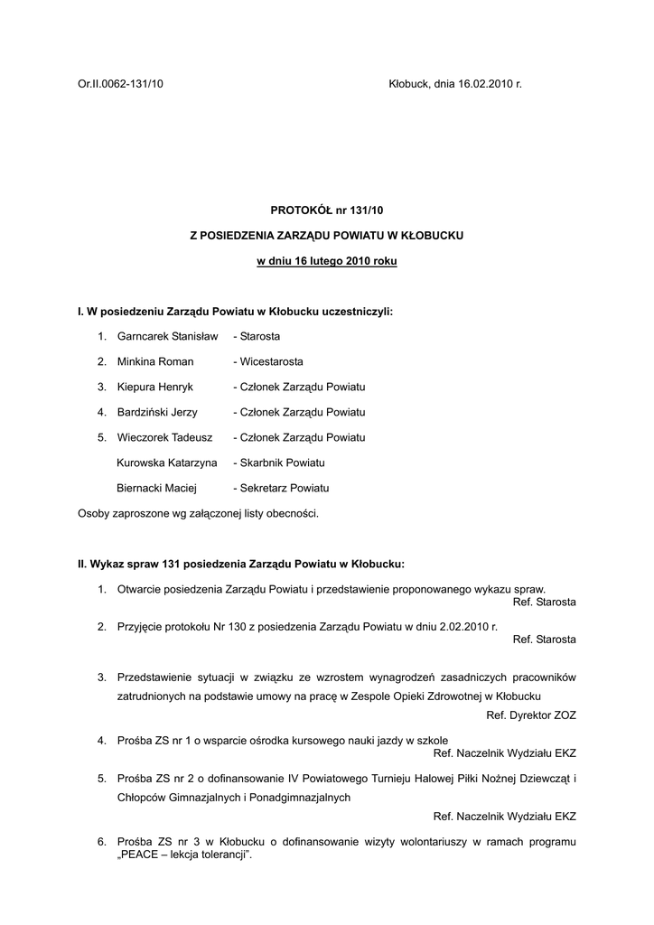 Or.II.0062-131/10 Kłobuck, dnia 16.02.2010 r. PROTOKÓŁ nr 131/10 Z POSIEDZENIA ZARZĄDU POWIATU W KŁOBUCKU w dniu 16 lutego 2010 roku I. W posiedzeniu Zarządu Powiatu w Kłobucku uczestniczyli: 1. Garncarek Stanisław - Starosta 2. Minkina Roman - Wicestarosta 3. Kiepura Henryk - Członek Zarządu Powiatu 4. Bardziński Jerzy - Członek Zarządu Powiatu 5. Wieczorek Tadeusz - Członek Zarządu Powiatu Kurowska Katarzyna - Skarbnik Powiatu Biernacki Maciej - Sekretarz Powiatu Osoby zaproszone wg załączonej listy obecności. II. Wykaz spraw 131 posiedzenia Zarządu Powiatu w Kłobucku: 1. Otwarcie posiedzenia Zarządu Powiatu i przedstawienie proponowanego wykazu spraw. Ref. Starosta 2. Przyjęcie protokołu Nr 130 z posiedzenia Zarządu Powiatu w dniu 2.02.2010 r. Ref. Starosta 3. Przedstawienie sytuacji w związku ze wzrostem wynagrodzeń zasadniczych pracowników zatrudnionych na podstawie umowy na pracę w Zespole Opieki Zdrowotnej w Kłobucku Ref. Dyrektor ZOZ 4. Prośba ZS nr 1 o wsparcie ośrodka kursowego nauki jazdy w szkole Ref. Naczelnik Wydziału EKZ 5. Prośba ZS nr 2 o dofinansowanie IV Powiatowego Turnieju Halowej Piłki Nożnej Dziewcząt i Chłopców Gimnazjalnych i Ponadgimnazjalnych Ref. Naczelnik Wydziału EKZ 6. Prośba ZS nr 3 w Kłobucku o dofinansowanie wizyty wolontariuszy w ramach programu „PEACE – lekcja tolerancji”. Ref. Naczelnik Wydziału EKZ 7. Podwyżki płac dla pracowników zatrudnionych w oparciu o Kodeks pracy w Domu Dziecka Ref. Skarbnik Powiatu 8. Nagrody dla dzielnicowych z terenu Powiatu Kłobuckiego Ref. Skarbnik Powiatu 9. Zakup sprzętu dla OSP najczęściej wyjeżdżających do akcji w związku z ostrym atakiem zimy Ref. Naczelnik Wydziału EKZ 10. Sprawy różne. III. Ustalenia 131 posiedzenia Zarządu Powiatu w Kłobucku z dnia 16 lutego 2010r. Ad.1. Przyjęto wykaz spraw 131 posiedzenia Zarządu Powiatu. Ad.2. Przyjęto protokół nr 130 z posiedzenia Zarządu Powiatu w dniu 2.02.2010r. Ad.3. Dyrektor Zespołu Opieki Zdrowotnej w Kłobucku przedstawił porozumienie w sprawie wzrostu wynagrodzeń zasadniczych pracowników zatrudnionych na podstawie umowy na pracę w Zespole Opieki Zdrowotnej w Kłobucku kończące spór zbiorowy zawarte w dniu 18 stycznia 2010r. pomiędzy Związkiem Zawodowym Pracowników Ochrony Zdrowia Województwa Śląskiego a Zespołem Opieki Zdrowotnej w Kłobucku. Przedstawił treść wydanego przez siebie zarządzenia nr 7/2010 z dnia 22.01.2010r. w sprawie podwyższenia wynagrodzeń zasadniczych pracowników zatrudnionych w Zespole Opieki Zdrowotnej w Kłobucku na podstawie umowy o pracę. Ponadto Dyrektor Zespołu Opieki Zdrowotnej w Kłobucku zapoznał Zarząd Powiatu z: - porozumieniem w sprawie wzrostu wynagrodzeń zasadniczych pielęgniarek i położnych zatrudnionych na podstawie umowy o pracę w Zespole Opieki Zdrowotnej w Kłobucku zawartym w dniu 28.12.2009r. pomiędzy ZOZ Kłobuck a Ogólnopolskim Związkiem Zawodowym Pielęgniarek i Położnych Zakładową Organizacją Związkową przy ZOZ Kłobuck; - porozumieniem w sprawie wzrostu wynagrodzeń zasadniczych lekarzy zatrudnionych na podstawie umowy o pracę w Zespole Opieki Zdrowotnej w Kłobucku zawartym w dniu 5.01.2010r. pomiędzy ZOZ Kłobuck a Ogólnopolskim Związkiem Zawodowym Lekarzy Oddziałem Terenowym w Kłobucku. Dyrektor ZOZ oświadczył, że stan zatrudnienia jest optymalny. Ustalenie: Zarząd Powiatu przyjął przedstawioną informację. Zarząd Powiatu uznał, iż ze strony Dyrektora ZOZ, będącego stroną porozumienia w sprawie wzrostu wynagrodzeń zasadniczych lekarzy zatrudnionych na podstawie umowy o pracę w Zespole Opieki Zdrowotnej w Kłobucku, zawartego w dniu 5 stycznia 2010r. - zapis §5 i 2 §6 tego porozumienia jest nieuprawniony i zobowiązał Dyrektora ZOZ do wyjaśnienia tej kwestii. Zarząd Powiatu zobowiązał Dyrektora ZOZ Kłobuck do przedstawienia informacji dotyczącej zadań inwestycyjnych planowanych w 2010 roku. Ad.4. Informację Dyrektora ZS nr 1 w Kłobucku dotyczącą kosztów realizacji nauki jazdy w klasach TP i MPS - przedstawił Naczelnik Wydziału EKZ. Informację przedstawiono ze względu na planowane wprowadzenie w roku szkolnym 2010/2011 nauki jazdy w klasach samochodowych, których nowy program nauczania nakłada na szkołę taki obowiązek. Ustalenie: Zarząd Powiatu zapoznał się z przedstawioną informacją. Zobowiązał Naczelnika Wydziału EKZ do przygotowania zagadnienia pod kątem uwarunkowań prawnych. Ad.5. Prośbę Dyrektora ZS nr 2 w Kłobucku o dofinansowanie IV Powiatowego Turnieju Halowej Piłki Nożnej Dziewcząt i Chłopców Gimnazjalnych i Ponadgimnazjalnych rozgrywanego w ramach akcji „Ferie na sportowo” w kwocie 450zł. – przedstawił Naczelnik Wydziału EKZ. Celem imprezy jest propagowanie zdrowego stylu życia, aktywnego spędzania czasu wolnego, popularyzowanie idei sportowej rywalizacji wśród dzieci i młodzieży. Ustalenie: Zarząd Powiatu poparł prośbę i przeznaczył, zgodnie z prośbą, kwotę 450 złotych na IV Powiatowego Turnieju Halowej Piłki Nożnej Dziewcząt i Chłopców Gimnazjalnych i Ponadgimnazjalnych. Ad.6. Prośbę Dyrektora ZS nr 3 w Kłobucku o dofinansowanie wizyty wolontariuszy w ramach programu „PEACE – lekcja tolerancji” – przedstawił Naczelnik Wydziału EKZ. Potrzeba organizacji przedsięwzięcia wynika z rosnącego zainteresowania młodzieży doskonaleniem umiejętności językowych. Wizyta wolontariuszy w ramach programu „PEACE – lekcja tolerancji” organizowana jest po raz siódmy. Ustalenie: Zarząd Powiatu wyraził Dyrektorowi ZS Nr 3 zgodę na sfinansowanie z budżetu szkoły tego przedsięwzięcia. Uwzględnienie elementów promocji Powiatu Kłobuckiego Dyrektor uzgodni z Naczelnikiem Wydziału EKZ. Ad.7. Prośbę Dyrektora Domu Dziecka o zajęcie stanowiska w sprawie podwyżki płac dla pracowników zatrudnionych w oparciu o Kodeks pracy - przedstawiła Skarbnik Powiatu. Skarbnik przedstawiła 3 średnie wynagrodz