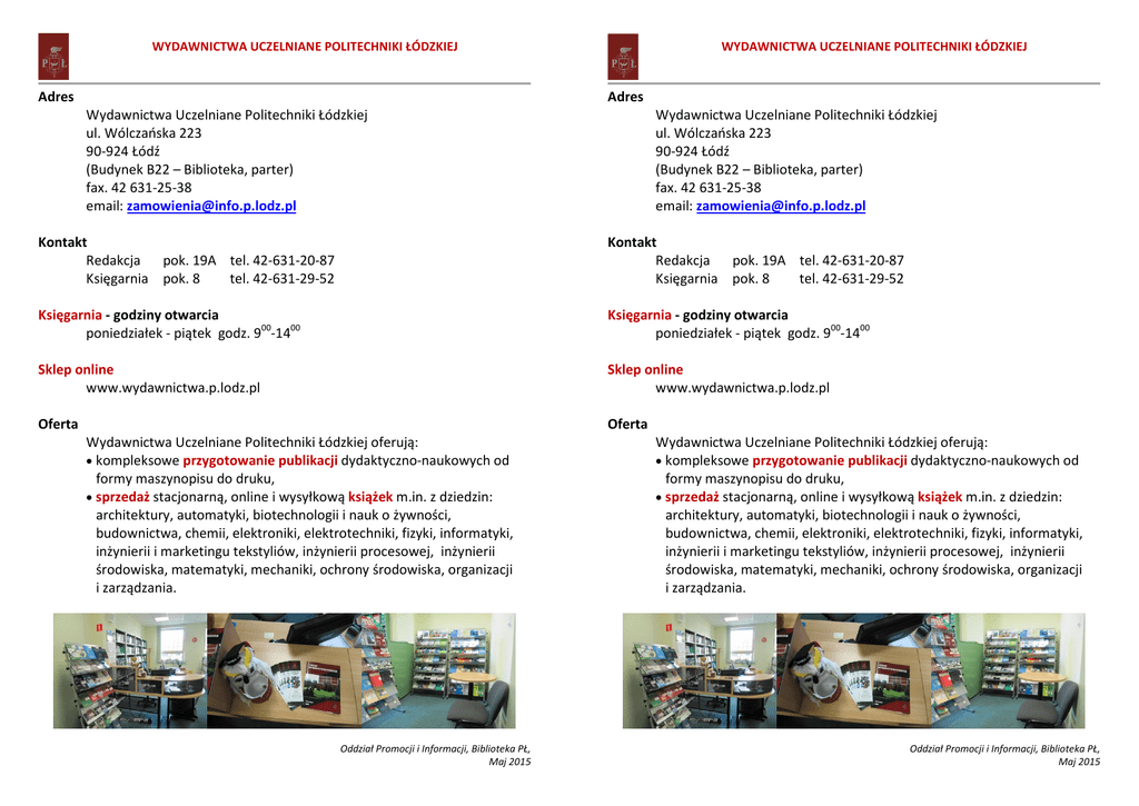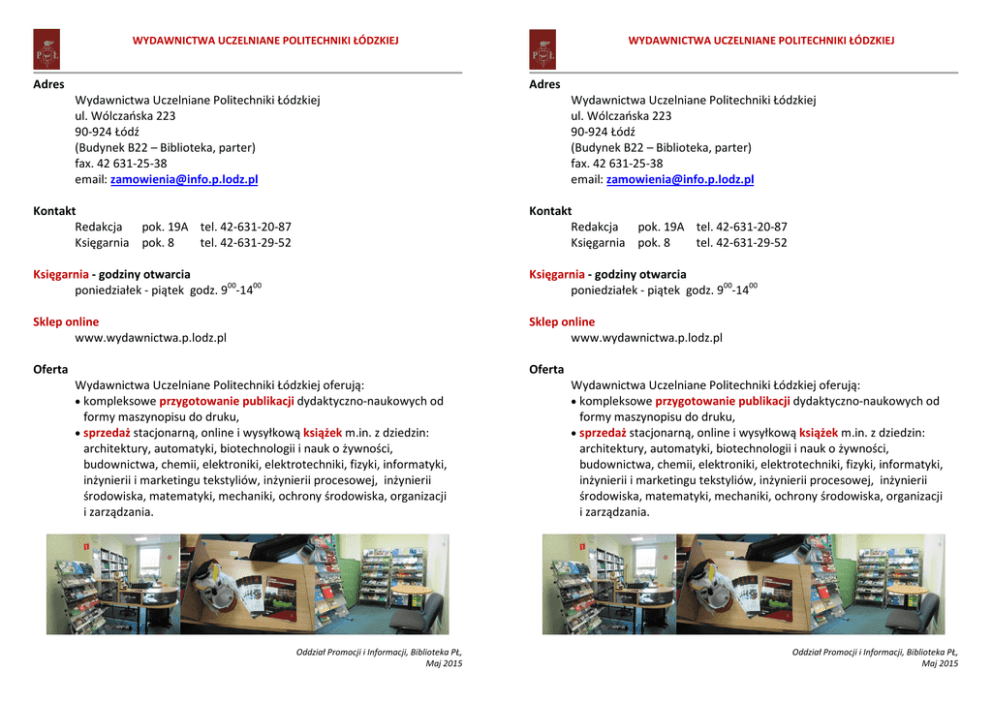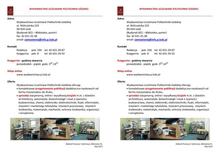 WYDAWNICTWA UCZELNIANE POLITECHNIKI ŁÓDZKIEJ Adres WYDAWNICTWA UCZELNIANE POLITECHNIKI ŁÓDZKIEJ Adres Wydawnictwa Uczelniane Politechniki Łódzkiej ul. Wólczańska 223 90-924 Łódź (Budynek B22 – Biblioteka, parter) fax. 42 631-25-38 email: [email protected] Wydawnictwa Uczelniane Politechniki Łódzkiej ul. Wólczańska 223 90-924 Łódź (Budynek B22 – Biblioteka, parter) fax. 42 631-25-38 email: [email protected] Kontakt Redakcja pok. 19A tel. 42-631-20-87 Księgarnia pok. 8 tel. 42-631-29-52 Kontakt Redakcja pok. 19A tel. 42-631-20-87 Księgarnia pok. 8 tel. 42-631-29-52 Księgarnia - godziny otwarcia poniedziałek - piątek godz. 900-1400 Księgarnia - godziny otwarcia poniedziałek - piątek godz. 900-1400 Sklep online www.wydawnictwa.p.lodz.pl Sklep online www.wydawnictwa.p.lodz.pl Oferta Oferta Wydawnictwa Uczelniane Politechniki Łódzkiej oferują: • kompleksowe przygotowanie publikacji dydaktyczno-naukowych od formy maszynopisu do druku, • sprzedaż stacjonarną, online i wysyłkową książek m.in. z dziedzin: architektury, automatyki, biotechnologii i nauk o żywności, budownictwa, chemii, elektroniki, elektrotechniki, fizyki, informatyki, inżynierii i marketingu tekstyliów, inżynierii procesowej, inżynierii środowiska, matematyki, mechaniki, ochrony środowiska, organizacji i zarządzania. Oddział Promocji i Informacji, Biblioteka PŁ, Maj 2015 Wydawnictwa Uczelniane Politechniki Łódzkiej oferują: • kompleksowe przygotowanie publikacji dydaktyczno-naukowych od formy maszynopisu do druku, • sprzedaż stacjonarną, online i wysyłkową książek m.in. z dziedzin: architektury, automatyki, biotechnologii i nauk o żywności, budownictwa, chemii, elektroniki, elektrotechniki, fizyki, informatyki, inżynierii i marketingu tekstyliów, inżynierii procesowej, inżynierii środowiska, matematyki, mechaniki, ochrony środowiska, organizacji i zarządzania. Oddział Promocji i Informacji, Biblioteka PŁ, Maj 2015