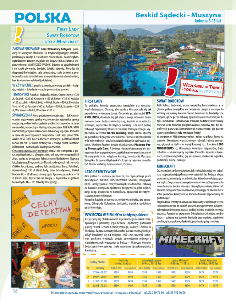 POLSKA ! Beskid Sądecki - Muszyna kolonia 6-13 lat FIRST LADY ŚWIAT ROBOTÓW LATO Z MINECRAFT ZAKWATEROWANIE Dom Wczasowy Kolejarz położony w Muszynie-Złockiem. To trzykondygnacyjny ośrodek, posiadający pokoje 3-4 osobowe z łazienkami. Na rozległym, ogrodzonym terenie znajduje się bogata infrastruktura wypoczynkowa: MIASTECZKO WODNE, baseny ze zjeżdżalniami i do nauki pływania, brodzik, ścieżka zdrowia. Ponadto do dyspozycji kolonistów: sala telewizyjna, stoły do tenisa, profesjonalna sala dyskotekowa z nagłośnieniem i oświetleniem, bar, kawiarnia oraz bilard (odpłatnie) ! WYŻYWIENIE 3 posiłki dziennie, pierwszy posiłek – kolacja, ostatni – śniadanie + suchy prowiant na powrót. TRANSPORT Autokar. Wyjazdy z miast: Częstochowa +120 zł, Gdańsk +220 zł, Katowice +120 zł, Kielce +130 zł, Kraków +120 zł, Lublin +160 zł, Łódź +140 zł, Opole +130 zł, Piotrków Tryb. +140 zł, Poznań +160 zł, Radom +130 zł, Szczecin +220 zł, Warszawa +140 zł, Wrocław +130 zł. ŚWIADCZENIA Cena podstawowa obejmuje: : Zakwaterowanie i wyżywienie, opiekę wychowawców, ratownika, opiekę medyczną, codzienne korzystanie z odkrytych basenów na terenie ośrodka, wycieczkę w Pieniny, ubezpieczenie TUiR AXA: NNW (do 5000 zł), program rekreacyjno-zabawowy wg opisu. Ponadto w cenie dla poszczególnych programów First Lady: pakiet SPA&WELLNESS FIRST LADY i dziecięce kosmetyki „LABORATORIUM KOSMETYCZNE” (2 różne zestawy na 2 osoby). Świat Robotów: Mikrorobot - pamiątka dla każdego uczestnika. Cena podstawowa nie obejmuje: dopłat do transportu z poszczególnych miast, ubezpieczenia od kosztów rezygnacji 52 zł/os, opłat za programy fakultatywne/dodatkowe. Dopłaty fakultatywne: Program Activ Max dla odważnych i aktywnych (Trikke, łucznictwo, zorbing lub zjeżdżalnia, Euro, Paintball, Aquazorbing) 130 zł (First Lady, Lato detektywów), Pakiet Modele RC – 59 zł (wszystkie grupy), Tęczowe paznokcie – 15 zł (First Lady), Wycieczka na Węgry – Kąpielisko w grotach termalnych, 4h – 125 zł (wszystkie grupy) IEJ ŚWIAT ROBOTÓW FIRST LADY To unikalna kolonia stworzona specjalnie dla wyjątkowych dziewczyn. Chcemy, aby każda z Was poczuła się jak prawdziwa, wytworna dama. Docenicie przyjemności SPA&WELLNESS, dowiecie się, jak dbać o swoje zdrowie i dobre samopoczucie. Będą szalone fryzury, kąpiele w miasteczku wodnym, wycieczka do Krynicy Górskiej i duuużo dobrej zabawy! Zapoznamy Was też z modną formą rekreacji i wypoczynku w terenie Nordic Walking, dzięki czemu spacery po górach nie będą straszne nikomu. Poznacie różnorodność wód mineralnych i atrakcje najpiękniejszych uzdrowisk polskich. Wielkim finałem będzie ekskluzywna Pidżama Party Pierwszych Dam. A do tego niespotykany program animacyjny, który przeniesie wszystkich na towarzyskie salony! W programie m.in.: wizyta w Krynicy, zwiedzanie Muszyny, Bulgotka, Zatajone i Dychawka? - Czym są tajemnicze mofety?, Nordic walking, Laboratorium, Piżama ... Jeśli lubisz budować, masz smykałkę konstruktora, a w głowie pełno pomysłów na tworzenie czegoś z niczego, to witamy na naszej kolonii! Świat Robotów to fantastyczne miejsce, gdzie przez zabawę zgłębisz tajniki matematyki, fizyki, mechaniki i informatyki. Poznasz podstawy konstrukcji maszyn oraz techniki programowania robotów tak, by potrafiły się poruszać, komunikować z otoczeniem, ale przede wszystkim dostarczały mnóstwo frajdy! W programie: Mój pierwszy robot , robot na pilota, Sumo na wesoło, Skonstruuj wymarzonego robota!, roboty terenowe, giganci ze stali – w wersji kinowej i z... klocków LEGO MINDSTORMS :-), Olimpiada Kolonijna Inżynierów, bajki robotów – biesiada przy ognisku. Ponadto: kąpiele w basenach, wędrówki górskie, gry zespołowe, dyskoteki, ogniska, podchody, quizy i turnieje. LATO DETEKTYWÓW Gra znana jest zarówno dzieciom, jak i młodzieży, gdyż jest to jedna z najpopularniejszych rozrywek ostatnich lat. Podczas obozu uczestnicy zamienią się w architektów, których nie dotyczą prawa fizyki. Z ogromnym zaangażowaniem tworzyć będą coraz to nowe formy w swoim własnym niezwykłym świecie. Minecraft stwarza nieograniczone możliwości pozwalając na obudzenie w sobie pokładów kreatywności. Podczas turnusu zapewniamy 10 godzin zajęć. Przykładowe tematy: Budowa osiedla i osady, eksploracja terenu i dostosowanie go do swoich potrzeb, przygotowanie pułapek i zabezpieczeń swojego miasta, podbój lochów wspólnie ze swoją drużyną, Ponadto w programie: Olimpiada Architektów, wodny świat – zabawy na basenie, biesiada przy ognisku, wędrówki górskie, gry zespołowe, dyskoteki, podchody, quizy i turnieje. Kim jestem? – zabawa poznawcza, Na czym polega praca detektywa?, WIELKIE POSZUKIWANIA SKARBU, Rozgrywki NERF, Odczytywanie zaszyfrowanych wiadomości, zabawy na basenie, olimpiada sportowa, rozgrywki w piłce nożnej, ping-pong, dyskoteka w kamuflażu, opowieści detektywistyczne, seanse filmowe. Ponadto: kąpiele w basenach, wędrówki górskie, gry zespołowe, Olimpiada Kolonijna, dyskoteki, ogniska, podchody, quizy i turnieje. WYCIECZKA W PIENINY w każdym pakiecie Przyjrzymy się z bliska ruinom legendarnego Zamku Czorsztyńskiego i poznamy jego historię. Będziemy podziwiać piękny widok Jeziora Czorsztyńskiego, zapory i Zamku w Niedzicy. Zapora czorsztyńska pełni bardzo ważną funkcję. Jaką? Dowiemy się na miejscu. Jeśli czas pozwoli ostatnim punktem wycieczki będzie odwiedzenie jednego z najpiękniejszych wąwozów w Polsce – Wąwozu Homole. Zobaczymy tworzące go skały wapienne i przełom potoku Kamionka. Rodzaj obozu Nr 1 2 3 4 14 WCZEŚNIEJ = TAN -100 PLN Terminy 27.06 - 08.07 09.07 - 20.07 21.07 - 01.08 02.08 - 13.08 First Lady 6-9 lat, 10-12 lat MINECRAFT Lato detektywów 6-9 lat, 10-12 lat Lato z Mincraft 8-10 lat, 11-13 lat Świat Robotów 8-10 lat, 11-13 lat do 25.03.2016 Cena regularna do 25.03.2016 Cena regularna do 2