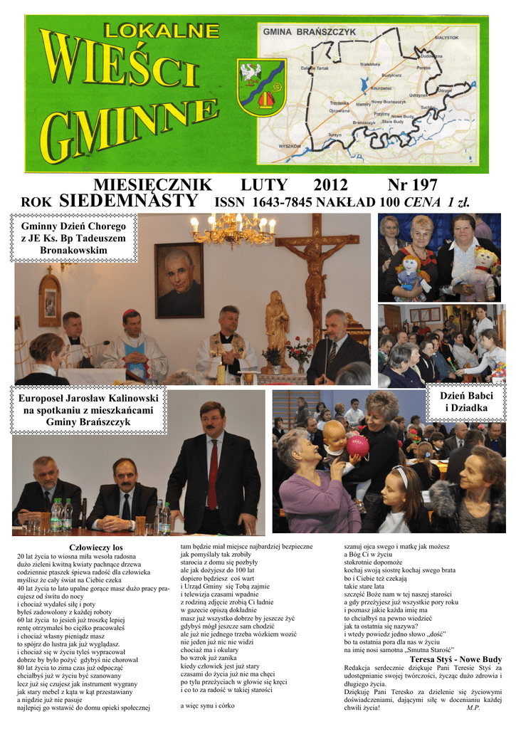 MIESIĘCZNIK ROK SIEDEMNASTY LUTY 2012 Nr 197 ISSN 1643-7845 NAKŁAD 100 CENA 1 zł. Gminny Dzień Chorego z JE Ks. Bp Tadeuszem Bronakowskim Dzień Babci i Dziadka Europoseł Jarosław Kalinowski na spotkaniu z mieszkańcami Gminy Brańszczyk Człowieczy los 20 lat życia to wiosna miła wesoła radosna dużo zieleni kwitną kwiaty pachnące drzewa codziennie ptaszek śpiewa radość dla człowieka myślisz że cały świat na Ciebie czeka 40 lat życia to lato upalne gorące masz dużo pracy pracujesz od świtu do nocy i chociaż wydałeś siłę i poty byłeś zadowolony z każdej roboty 60 lat życia to jesień już troszkę lepiej rentę otrzymałeś bo ciężko pracowałeś i chociaż własny pieniądz masz to spójrz do lustra jak już wyglądasz. i chociaż się w życiu tyleś wypracował dobrze by było pożyć gdybyś nie chorował 80 lat życia to zima czas już odpocząć chciałbyś już w życiu być szanowany lecz już się czujesz jak instrument wygrany jak stary mebel z kąta w kąt przestawiany a nigdzie już nie pasuje najlepiej go wstawić do domu opieki społecznej tam będzie miał miejsce najbardziej bezpieczne jak pomyślały tak zrobiły starocia z domu się pozbyły ale jak dożyjesz do 100 lat dopiero będziesz coś wart i Urząd Gminy się Tobą zajmie i telewizja czasami wpadnie z rodziną zdjęcie zrobią Ci ładnie w gazecie opiszą dokładnie masz już wszystko dobrze by jeszcze żyć gdybyś mógł jeszcze sam chodzić ale już nie jednego trzeba wózkiem wozić nie jeden już nic nie widzi chociaż ma i okulary bo wzrok już zanika kiedy człowiek jest już stary czasami do życia już nie ma chęci po tylu przeżyciach w głowie się kręci i co to za radość w takiej starości a więc synu i córko szanuj ojca swego i matkę jak możesz a Bóg Ci w życiu stokrotnie dopomoże kochaj swoją siostrę kochaj swego brata bo i Ciebie też czekają takie stare lata szczęść Boże nam w tej naszej starości a gdy przeżyjesz już wszystkie pory roku i poznasz jakie każda imię ma to chciałbyś na pewno wiedzieć jak ta ostatnia się nazywa? i wtedy powiedz jedno słowo „dość” bo ta ostatnia pora dla nas w życiu na imię nosi samotna „Smutna Starość” Teresa Styś - Nowe Budy Redakcja serdecznie dziękuje Pani Teresie Styś za udostępnianie swojej twórczości, życząc dużo zdrowia i długiego życia. Dziękuję Pani Teresko za dzielenie się życiowymi doświadczeniami, dającymi siłę w docenianiu każdej chwili życia! M.P. 92 rocznica zaślubin Polski z morzem - Puck 2012 W 1920 roku, 10 lutego, w miejscowości Puck położonej nad Morzem Bałtyckim, generał Józef Haller, poprzez wrzucenie platynowego pierścienia do morza, dokonał symbolicznego aktu zaślubin Polski z morzem. Od tego momentu, Polska objęła odcinek wybrzeża morskiego, który wraz z Mierzeją Helską liczył 140 km długości. 10 lutego bieżącego roku odbyły się obchody 92 rocznicy tego pamiętnego wydarzenia. W uroczystościach uczestniczyli: Sekretarz Stanu w Kancelarii Prezydenta RP Sławomir Rybicki, dowódca Marynarki Wojennej admirał floty Tomasz Mathea, prezes Ligi Morskiej i Rzecznej Andrzej Królikowski oraz Metropolita Gdański, Arcybiskup Sławoj Leszek Głódź. Część oficjalna rozpoczęła się o 9:30 na miejskim rynku, gdzie miało miejsce uroczyste wciągnięcie flagi na maszt oraz odegranie hymnu Rzeczpospolitej Polskiej. Następnie wręczono Pierścienie Hallera. Są to najwyższe odznaczenia przyznawane przez Ligę W uroczystościach brała również udział Morską i Rzeczną. O godz. 10:00 w delegacja uczniów z Gimnazjum nr 2 Kościele Farnym w Pucku rozpoczęła się im. Obrońców Westerplatte w Wyszkowie oraz Msza Święta koncelebrowana przez członkowie Ligi Morskiej i Rzecznej w ks. arcybiskupa Sławoja Głódzia. Około Wyszkowie, z komandorem Julianem godz. 11:45 uroczystości przeniosły się do Bielawskim na czele. Dla nas uczniów wyjazd portu, gdzie uroczyście wygłoszono ten był bardzo udany. Oprócz reprezentowania przemówienia oraz wręczono odznaczenia szkoły w poczcie sztandarowym, mieliśmy czas Krzyże Pro Mari Nostro. W południe z na zwiedzanie miasta i portu oraz zrobienie pokładu śmigłowca Marynarki Wojennej na pamiątkowych zdjęć nad zamarzniętym morzem. wody Zatoki Puckiej złożono wieniec. Warto zobaczyć nasze polskie morze, nawet zimą. Na obchodach tejże rocznicy uczestniczyła delegacja uczniów naszej szkoły w składzie: Damian Kowalczyk, Szymon Kurowski, Szymon Kurowski uczeń PG w Brańszczyku Karol Uchal. Opiekunem grupy był pan Paweł Różański, członek Ligi Morskiej i Rzecznej, odznaczony11 lutego 2012 r. odznaką pamiątkową Marynarki Wojennej Rzeczypospolitej Polskiej. „Lokalne Wieści Gminne” Nr 197/2012 s. 2 /rok siedemnasty/ Nowoczesność Pamiętam czas, kiedy na wsi był jeden telefon w wyznaczonym miejscu u sołtysa. Czas nie tak odległy, bo sytuacja miała miejsce jeszcze na początku lat dziewięćdziesiątych ubiegłego wieku. Chcąc zadzwonić trzeba było pofatygować się do sołtysa i jeżeli telefon był sprawny dzwoniliśmy do znajomych lub rodziny w mieście. Musieli mieszkać w mieście, bo w innej wsi też był jeden telefon - oczywiście u sołtysa i kontakt telefoniczny ze zrozumiałych przyczyn był bardzo utrudniony. Wówczas w takim przypadku, aby przekazać wiadomość z pomocą przychodziła nam Poczta Polska. Wysyłaliśmy wtedy z jej pomocą list bądź telegram i po pewnym czasie u naszych krewnych bądź znajomych z dobrą wiadomością pojawiał się pan zwany listonoszem. Tak było od niepamiętnych czasów. Nie zmieniał się sposób komunikowania się ludzi, nie zmieniała się również Poczta Polska. Może z jednym wyjątkiem. W pewnym momencie naszych polskich dziejów poczciwego pana zwanego listonoszem zastąpił pan zwany doręczycielem. Był to oczywiście ten sam pan. Od tamtej pory to doręczyciel przynosił listy, paczki, telegramy 