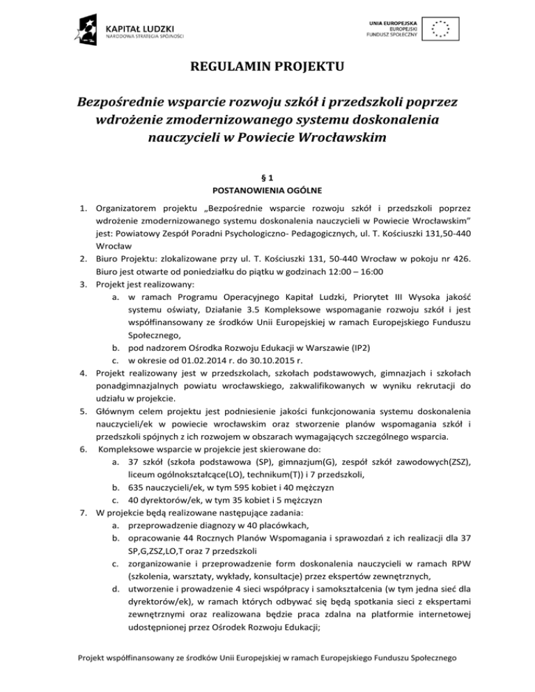 REGULAMIN PROJEKTU Bezpośrednie wsparcie rozwoju szkół i przedszkoli poprzez wdrożenie zmodernizowanego systemu doskonalenia nauczycieli w Powiecie Wrocławskim §1 POSTANOWIENIA OGÓLNE 1. Organizatorem projektu „Bezpośrednie wsparcie rozwoju szkół i przedszkoli poprzez wdrożenie zmodernizowanego systemu doskonalenia nauczycieli w Powiecie Wrocławskim” jest: Powiatowy Zespół Poradni Psychologiczno- Pedagogicznych, ul. T. Kościuszki 131,50-440 Wrocław 2. Biuro Projektu: zlokalizowane przy ul. T. Kościuszki 131, 50-440 Wrocław w pokoju nr 426. Biuro jest otwarte od poniedziałku do piątku w godzinach 12:00 – 16:00 3. Projekt jest realizowany: a. w ramach Programu Operacyjnego Kapitał Ludzki, Priorytet III Wysoka jakość systemu oświaty, Działanie 3.5 Kompleksowe wspomaganie rozwoju szkół i jest współfinansowany ze środków Unii Europejskiej w ramach Europejskiego Funduszu Społecznego, b. pod nadzorem Ośrodka Rozwoju Edukacji w Warszawie (IP2) c. w okresie od 01.02.2014 r. do 30.10.2015 r. 4. Projekt realizowany jest w przedszkolach, szkołach podstawowych, gimnazjach i szkołach ponadgimnazjalnych powiatu wrocławskiego, zakwalifikowanych w wyniku rekrutacji do udziału w projekcie. 5. Głównym celem projektu jest podniesienie jakości funkcjonowania systemu doskonalenia nauczycieli/ek w powiecie wrocławskim oraz stworzenie planów wspomagania szkół i przedszkoli spójnych z ich rozwojem w obszarach wymagających szczególnego wsparcia. 6. Kompleksowe wsparcie w projekcie jest skierowane do: a. 37 szkół (szkoła podstawowa (SP), gimnazjum(G), zespół szkół zawodowych(ZSZ), liceum ogólnokształcące(LO), technikum(T)) i 7 przedszkoli, b. 635 nauczycieli/ek, w tym 595 kobiet i 40 mężczyzn c. 40 dyrektorów/ek, w tym 35 kobiet i 5 mężczyzn 7. W projekcie będą realizowane następujące zadania: a. przeprowadzenie diagnozy w 40 placówkach, b. opracowanie 44 Rocznych Planów Wspomagania i sprawozdań z ich realizacji dla 37 SP,G,ZSZ,LO,T oraz 7 przedszkoli c. zorganizowanie i przeprowadzenie form doskonalenia nauczycieli w ramach RPW (szkolenia, warsztaty, wykłady, konsultacje) przez ekspertów zewnętrznych, d. utworzenie i prowadzenie 4 sieci współpracy i samokształcenia (w tym jedna sieć dla dyrektorów/ek), w ramach których odbywać się będą spotkania sieci z ekspertami zewnętrznymi oraz realizowana będzie praca zdalna na platformie internetowej udostępnionej przez Ośrodek Rozwoju Edukacji; Projekt współfinansowany ze środków Unii Europejskiej w ramach Europejskiego Funduszu Społecznego 8. Udział w projekcie jest bezpłatny, dofinansowany ze środków Unii Europejskiej w ramach Europejskiego Funduszu Społecznego zarówno dla placówek oświatowych jak i dyrektorów i nauczycieli. 9. Kontakt z biurem projektu odbywa się przez telefon: 717222002, e-mail: [email protected] (zarządzający projektem) lub [email protected] (koordynator projektu), fax 71 722002, pocztę tradycyjną na adres podany w p. 1 regulaminu oraz bezpośrednio w godzinach pracy biura. §2 DEFINICJE Ilekroć w niniejszym dokumencie jest mowa o: 1. Projekcie – należy przez to rozumieć Projekt „Bezpośrednie wsparcie rozwoju szkół i przedszkoli poprzez wdrożenie zmodernizowanego systemu doskonalenia nauczycieli w Powiecie Wrocławskim” realizowany w ramach Programu Operacyjnego Kapitał Ludzki 2007 – 2013, Priorytet III Wysoka jakość systemu oświaty, Działanie 3.5 Kompleksowe wspomaganie rozwoju szkół; 2. Uczestniku – należy przez to rozumieć: a. w przypadku uczestnika instytucjonalnego: szkołę / przedszkole, której dyrektor złożył deklarację uczestnictwa w projekcie, została/o zakwalifikowana/e do udziału w Projekcie oraz której dyrektor podpisał/a Deklarację uczestnictwa w projekcie. b. w przypadku uczestnika indywidualnego: nauczyciela / nauczycielkę, który/a został/a zakwalifikowany/a do udziału w Projekcie oraz podpisał/a Deklarację uczestnictwa w projekcie 3. Komisji Rekrutacyjnej – należy przez to rozumieć zespół składający się z Koordynatora Projektu, Specjalisty ds. Monitorigu weryfikujących dokumenty i zatwierdzających listy Uczestników poszczególnych rodzajów wsparcia; 4. Szkolnym organizatorze rozwoju edukacji (SORE) – należy przez to rozumieć specjalistę zewnętrznego (spoza szkoły/przedszkola) bezpośrednio współpracującego z placówką w realizacji rocznego planu wspomagania. Do jego zadań należą: pomoc w diagnozie potrzeb szkoły/przedszkola oraz dostosowaniu oferty doskonalenia do zdiagnozowanych potrzeb, a następnie pomoc w zbudowaniu RPW. W ramach realizacji RPW Szkolny organizator rozwoju edukacji organizuje szkolenia (warsztaty, konsultacje, wykłady), pomaga nauczycielom wdrażać nowe umiejętności do praktyki szkolnej, przygotowuje sprawozdanie z realizacji działań. SORE ma pod opieką kilkanaście szkół/przedszkoli, z którymi utrzymuje ścisły kontakt podczas realizacji rocznego planu wspomagania (rok szkolny). Każdy SORE współpracuje z Komisją Rekrutacyjną w zakresie rekrutacji uczestników do projektu. 5. Roczny plan wspomagania (RPW) – należy przez to rozumieć plan zbudowany na bazie jednej z ofert doskonalenia realizowany w danej szkole lub w danym przedszkolu. RPW obejmuje cały proces: od diagnozy potrzeb, poprzez planowanie i realizację konkretnych działań (np. warsztaty, szkolenia, konsultacje), pomoc nauczycielom we wprowadzaniu zmiany, aż po ewaluację podjętych działań. Współpracujący ze szkołą SORE pomaga w dostosowaniu schematycznie opisanej oferty doskonalenia do potrzeb konkretnej szkoły/ konkretnego przedszkola i wspiera placówkę w realizacji RPW. 6. Sieci współpracy i samokształcenia – należy przez to rozumieć zespół ok. 25 nauczycieli/lek, dyrektorów/ek z różnych szkół/przedszkoli, którzy w zorganizowany sposób współpracują ze Projekt współfinansowany ze środków Unii Europejskiej w ramach Europ