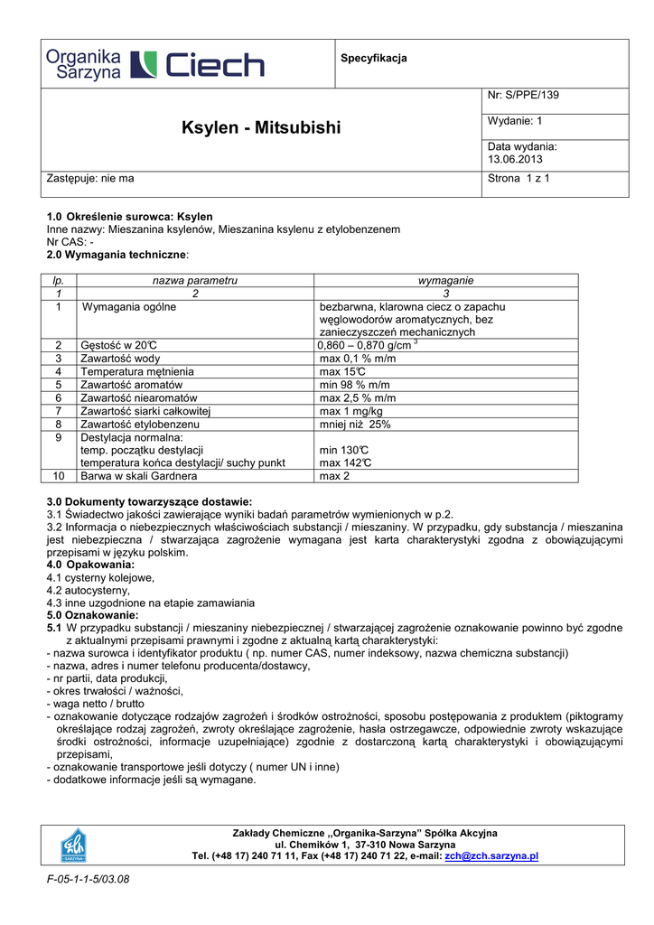 Specyfikacja Nr: S/PPE/139 Ksylen - Mitsubishi Wydanie: 1 Data wydania: 13.06.2013 Zastępuje: nie ma Strona 1 z 1 1.0 Określenie surowca: Ksylen Inne nazwy: Mieszanina ksylenów, Mieszanina ksylenu z etylobenzenem Nr CAS: 2.0 Wymagania techniczne: lp. 1 1 nazwa parametru 2 Wymagania ogólne 2 3 4 5 6 7 8 9 Gęstość w 20°C Zawartość wody Temperatura mętnienia Zawartość aromatów Zawartość niearomatów Zawartość siarki całkowitej Zawartość etylobenzenu Destylacja normalna: temp. początku destylacji temperatura końca destylacji/ suchy punkt Barwa w skali Gardnera 10 wymaganie 3 bezbarwna, klarowna ciecz o zapachu węglowodorów aromatycznych, bez zanieczyszczeń mechanicznych 3 0,860 – 0,870 g/cm max 0,1 % m/m max 15°C min 98 % m/m max 2,5 % m/m max 1 mg/kg mniej niż 25% min 130°C max 142°C max 2 3.0 Dokumenty towarzyszące dostawie: 3.1 Świadectwo jakości zawierające wyniki badań parametrów wymienionych w p.2. 3.2 Informacja o niebezpiecznych właściwościach substancji / mieszaniny. W przypadku, gdy substancja / mieszanina jest niebezpieczna / stwarzająca zagrożenie wymagana jest karta charakterystyki zgodna z obowiązującymi przepisami w języku polskim. 4.0 Opakowania: 4.1 cysterny kolejowe, 4.2 autocysterny, 4.3 inne uzgodnione na etapie zamawiania 5.0 Oznakowanie: 5.1 W przypadku substancji / mieszaniny niebezpiecznej / stwarzającej zagrożenie oznakowanie powinno być zgodne z aktualnymi przepisami prawnymi i zgodne z aktualną kartą charakterystyki: - nazwa surowca i identyfikator produktu ( np. numer CAS, numer indeksowy, nazwa chemiczna substancji) - nazwa, adres i numer telefonu producenta/dostawcy, - nr partii, data produkcji, - okres trwałości / ważności, - waga netto / brutto - oznakowanie dotyczące rodzajów zagrożeń i środków ostrożności, sposobu postępowania z produktem (piktogramy określające rodzaj zagrożeń, zwroty określające zagrożenie, hasła ostrzegawcze, odpowiednie zwroty wskazujące środki ostrożności, informacje uzupełniające) zgodnie z dostarczoną kartą charakterystyki i obowiązującymi przepisami, - oznakowanie transportowe jeśli dotyczy ( numer UN i inne) - dodatkowe informacje jeśli są wymagane. Zakłady Chemiczne ,,Organika-Sarzyna” Spółka Akcyjna ul. Chemików 1, 37-310 Nowa Sarzyna Tel. (+48 17) 240 71 11, Fax (+48 17) 240 71 22, e-mail: [email protected] F-05-1-1-5/03.08