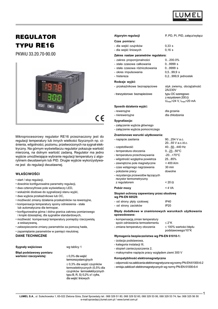 REGULATOR TYPU RE16 Algorytm regulacji P, PD, PI, PID, za³¹cz/wy³¹cz Czas pomiaru: - dla wejæ czujników - dla wejæ liniowych PKWiU 33.20.70-90.00 0,33 s 0,16 s Zakres nastaw parametrów regulatora: - zakres proporcjonalnoci sta³a czasowa ca³kowania sta³a czasowa ró¿niczkowania okres impulsowania histereza 0...200.0% 0...9999 s 0...9999 s 0,5...99,9 s 0,2...999,9 jednostek Rodzaje wyjæ: - przekanikowe beznapiêciowe - tranzystorowe beznapieciowe styk zwierny, obci¹¿alnoæ 2A/230V typu OC szeregowo z rezystorem 200 W Umax=24 V, Imax=20 mA Sposób dzia³ania wyjæ: - rewersyjne - nierewersyjne dla grzania dla ch³odzenia Sygnalizacja: - za³¹czenie wyjcia g³ównego - za³¹czenie wyjcia pomocniczego Mikroprocesorowy regulator RE16 przeznaczony jest do regulacji temperatury lub innych wielkoci fizycznych np. cinienia, wilgotnoci, poziomu, przetworzonych na sygna³ elektryczny. Na górnym wywietlaczu regulator pokazuje wartoæ mierzon¹, na dolnym wartoæ zadan¹. Regulator ma jedno wyjcie umo¿liwiaj¹ce wybranie regulacji temperatury z algorytmem dwustawnym lub PID. Drugie wyjcie wykorzystywane jest do regulacji dwustawnej. W£ACIWOCI start / stop regulacji, dowolnie konfigurowalne parametry regulacji, dwa czterocyfrowe pole wywietlaczy LED, wskaniki diodowe do sygnalizacji stanu wyjæ, dwa wyjcia przekanikowe lub OC, mo¿liwoæ zmiany dzia³ania przekaników na rewersyjne, kompensacja temperatury spoiny odniesienia - sta³a lub automatyczna dla termopar, konfigurowalna górna i dolna granica zakresu pomiarowego i kropki dziesiêtnej, dla sygna³ów standardowych, mo¿liwoæ kompensacji temperatury pomiêdzy rzeczywist¹ a wskazywan¹, zabezpieczenie zmiany parametrów za pomoc¹ has³a, zapamiêtanie parametrów w pamiêci nieulotnej. Znamionowe warunki u¿ytkowania: - napiêcie zasilania - czêstotliwoæ - temperatura otoczenia - temperatura przechowywania - wilgotnoæ wzglêdna powietrza - zewnêtrzne pole magnetyczne - czas wstêpnego nagrzewania - po³o¿enie pracy - rezystancja przewodów ³¹cz¹cych rezystor termometryczny z regulatorem Pobór mocy 90...254 V a.c. 20...55 V a.c./d.c. 40...50...440 Hz 0...23...50°C -20...+70°C 25...85% < 400 A/m 30 min dowolne < 20 W < 4 VA Stopieñ ochrony zapewniany przez obudowê wg PN-EN 60529: - od strony p³yty czo³owej - od strony zacisków IP40 IP20 B³êdy dodatkowe w znamionowych warunkach u¿ytkowania spowodowane: - kompensacj¹ zmian temperatury spoin odniesienia termoelementu - zmiana temperatury otoczenia £ 2°K £ 100% wartoci b³êdu podstawowego/10°K DANE TECHNICZNE Wymagania bezpieczeñstwa wg PN-EN 61010-1: Sygna³y wejciowe - izolacja podstawowa, - kategoria instalacji III, - stopieñ zanieczyszczenia 2, - maksymalne napiêcie pracy wzglêdem ziemi 300 V B³¹d podstawowy pomiaru wartoci rzeczywistej: wg tablicy 1 £ 0,3% dla wejæ termorezystancyjnych £ 0,3% dla wejæ czujników termoelektrycznych (0,5%-dla czujników termoelektrycznych typu B, R, S) 0,2% ±1 cyfra, dla wejæ liniowych Kompatybilnoæ elektromagnetyczna - odpornoæ na zak³ócenia elektromagnetyczne wg normy PN-EN 61000-6-2 - emisja zak³óceñ elektromagnetycznych wg normy PN-EN 61000-6-4 LUMEL S.A., ul. Sulechowska 1, 65-022 Zielona Góra, Dzia³ Sprzeda¿y tel.: 068 329 51 80, 068 329 52 60, 068 329 53 06, 068 329 53 74; fax: 068 325 56 50 e-mail:[email protected] / www.lumel.com.pl 1 Sygna³y wejciowe, zakresy pomiarowe Typ czujnika Oznaczenie Pt100 wg PN-EN 60751+A2:1997 Pt1000 wg PN-EN 60751+A2:1997 Fe-CuNi Cu-CuNi NiCr-NiAl PtRh10-Pt PtRh13-Pt PtRh30-PtRh6 NiCr-CuNiE NiCrSi-NiSi Liniowe pr¹dowe Liniowe napiêciowe Tablica 1 WYMIARY ZEWNÊTRZNE REGULATORA Zakres Pt100 -199...850°C PT1000 -199...850°C J -100...1200°C T -100...400°C K -100...1372°C S 200...1767°C R 200...1767°C B 600...1820°C -100...999°C N -100...1300°C I 0...20 mA,4...20 mA U 0...5 V, 0...10 V SCHEMAT POD£¥CZEÑ REGULATORA KOD WYKONAÑ REGULATORA REGULATOR RE16 a) wejcia czujników Wejcie Uniwersalne dla czujników termoelektrycznych i rezystancyjnych ........ 1 Uniwersalne liniowe: pr¹dowe 0/4...20 mA ............................... napiêciowe 0...5/10 V ................................. 2 na zamówienie ............................................ 9 Wyjcie g³ówne wyjcie przekanikowe ..................................... 1 wyjcie tranzystorowe OC ................................ 2 Wyjcie pomocnicze bez wyjcia .............................................................. 0 wyjcie przekanikowe ............................................ 1 wyjcie tranzystorowe OC ....................................... 2 Zasilanie 90...254V a.c. .................................................................. 1 20...55V a.c./d.c. ............................................................. 2 b) wejcia liniowe Wykonanie wykonanie katalogowe .......................................................... 00 wykonanie specjalne ............................................................. 99 Dodatkowe wymagania bez dodatkowych wymagañ ........................................................... 0 z atestem Kontroli Technicznej ....................................................... 1 wg uzgodnieñ z odbiorc¹* .............................................................. X * numeracjê wykonania ustali producent PRZYK£AD ZAMÓWIENIA kod RE16 1 1 0 1 0 1 oznacza regulator z wejciem uniwersalnym dla czujników termoelektrycznych i termorezystancyjnych, wyjciem g³ównym przekanikowym, bez wyjcia pomocniczego, z zasilaniem 90...254 V a.c., wg wykonania katalogowego, z atestem kontroli Technicznej. styczeñ 2006 2 LUMEL S.A., ul. Sulechowska 1, 65-022 Zielona Góra, Dzia³ Sprzeda¿y tel.: 068 329 51 80, 068 329 52 60, 068 329 53 06, 068 329 53 74; fax: 068 325 56 50 e-mail:[email protected] / www.lumel.com.pl
