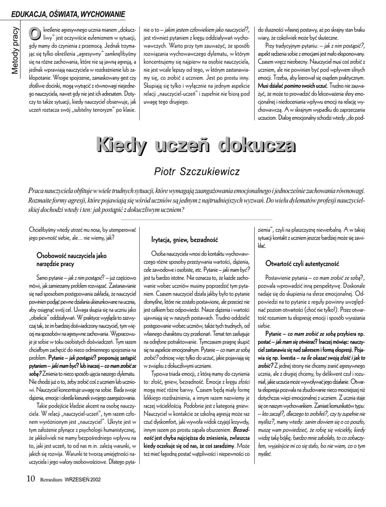 Metody pracy EDUKACJA, OWIATA, WYCHOWANIE O kreślenie agresywnego ucznia mianem „dokuczliwy” jest oczywiście eufemizmem w sytuacji, gdy mamy do czynienia z przemocą. Jednak trzymając się tylko określenia „agresywny” zamknęlibyśmy się na różne zachowania, które nie są jawną agresją, a jednak wprawiają nauczyciela w rozdrażnienie lub zakłopotanie. Wrogie spojrzenie, zamaskowany gest czy złośliwe docinki, mogą wytrącić z równowagi niejednego nauczyciela, nawet gdy nie jest ich adresatem. Dotyczy to także sytuacji, kiedy nauczyciel obserwuje, jak uczeń roztacza swój „subtelny terroryzm” po klasie. nie o to – jakim jestem człowiekiem jako nauczyciel?, jest również pytaniem z kręgu oddziaływań wychowawczych. Warto przy tym zauważyć, że sposób rozwiązania wychowawczego dylematu, w którym koncentrujemy się najpierw na osobie nauczyciela, nie jest wcale lepszy od tego, w którym zastanawiamy się, co zrobić z uczniem. Jest po prostu inny. Skupiają się tylko i wyłącznie na jednym aspekcie relacji „nauczyciel-uczeń” i zupełnie nie biorą pod uwagę tego drugiego. do słuszności własnej postawy, aż po skrajny stan braku wiary, że cokolwiek może być skuteczne. Przy tradycyjnym pytaniu: – jak z nim postąpić?, aspekt radzenia sobie z emocjami jest mało eksponowany. Czasem wręcz nieobecny. Nauczyciel musi coś zrobić z uczniem, ale nie powinien być pod wpływem silnych emocji. Trzeba, aby kierował się osądem praktycznym. Musi działać pomimo swoich uczuć. Trudno nie zauważyć, że może to prowadzić do lekceważenia sfery emocjonalnej i niedoceniania wpływu emocji na relację wychowawczą. A w skrajnym wypadku do zaprzeczania uczuciom. Dialog emocjonalny schodzi wtedy „do pod- Kiedy uczeñ dokucza Piotr Szczukiewicz Praca nauczyciela obfituje w wiele trudnych sytuacji, które wymagaj¹ zaanga¿owania emocjonalnego i jednoczenie zachowania równowagi. Rozmaite formy agresji, które pojawiaj¹ siê wród uczniów s¹ jednym z najtrudniejszych wyzwañ. Do wielu dylematów profesji nauczycielskiej dochodzi wtedy i ten: jak post¹piæ z dokuczliwym uczniem? Chcielibyśmy wtedy utrzeć mu nosa, by utemperować jego pewność siebie, ale... nie wiemy, jak? Osobowość nauczyciela jako narzędzie pracy Samo pytanie – jak z nim postąpić? – już częściowo mówi, jak zamierzamy problem rozwiązać. Zastanawianie się nad sposobem postępowania zakłada, że nauczyciel powinien podjąć pewne działania ukierunkowane na ucznia, aby osiągnąć swój cel. Uwaga skupia się na uczniu jako „obiekcie” oddziaływań. W praktyce wygląda to zazwyczaj tak, że im bardziej doświadczony nauczyciel, tym więcej ma sposobów na agresywne zachowania. Wypracowuje je sobie w toku osobistych doświadczeń. Tym razem chciałbym zachęcić do nieco odmiennego spojrzenia na problem. Pytanie – jak postąpić? proponuję zastąpić pytaniem – jaki mam być? lub inaczej – co mam zrobić ze sobą? Zmienia to nieco sposób ujęcia naszego dylematu. Nie chodzi już o to, żeby zrobić coś z uczniem lub uczniowi. Nauczyciel koncentruje uwagę na sobie. Bada swoje dążenia, emocje i określa kierunek swojego zaangażowania. Takie podejście kładzie akcent na osobę nauczyciela. W relacji „nauczyciel-uczeń”, tym razem członem wyróżnionym jest „nauczyciel”. Ukryte jest w tym założenie płynące z psychologii humanistycznej, że jakkolwiek nie mamy bezpośredniego wpływu na to, jaki jest uczeń, to od nas m.in. zależą warunki, w jakich się rozwija. Warunki te tworzą umiejętności nauczyciela i jego walory osobowościowe. Dlatego pyta- 10 Remedium WRZESIEÑ 2002 Irytacja, gniew, bezradność Osoba nauczyciela wnosi do kontaktu wychowawczego różne sposoby przeżywania wartości, dążenia, cele zawodowe i osobiste, etc. Pytanie – jaki mam być? jest tu bardzo istotne. Nie oznacza to, że każde zachowanie wobec uczniów musimy poprzedzić tym pytaniem. Czasem nauczyciel działa jakby było to pytanie domyślne, które nie zostało postawione, ale przecież nie jest całkiem bez odpowiedzi. Nasze dążenia i wartości ujawniają się w naszych postawach. Trudno oddzielić postępowanie wobec uczniów, także tych trudnych, od własnego charakteru czy przekonań. Temat ten zasługuje na odrębne potraktowanie. Tymczasem pragnę skupić się na aspekcie emocjonalnym. Pytanie – co mam ze sobą zrobić? odniosę więc tylko do uczuć, jakie pojawiają się w związku z dokuczliwymi uczniami. Typowa triada emocji, z którą mamy do czynienia to: złość, gniew, bezradność. Emocje z kręgu złości mogą mieć różne barwy. Czasem będą miały formę lekkiego rozdrażnienia, a innym razem nazwiemy je raczej wściekłością. Podobnie jest z kategorią gniew. Nauczyciel w kontakcie ze szkolną agresją może raz czuć dyskomfort, jaki wywoła widok czyjejś krzywdy, innym razem po prostu zapała oburzeniem. Bezradność jest chyba najcięższa do zniesienia, zwłaszcza kiedy oczekuje się od nas, że coś zaradzimy. Może też mieć łagodną postać wątpliwości i niepewności co ziemia”, czyli na płaszczyznę niewerbalną. A w takiej sytuacji kontakt z uczniem jeszcze bardziej może się zawikłać. Otwartość czyli autentyczność Postawienie pytania – co mam zrobić ze sobą?, pozwala wprowadzić inną perspektywę. Doskonale nadaje się do skupienia na sferze emocjonalnej. Odpowiedzi na to pytanie z reguły powinny uwzględniać poziom otwartości (choć nie tylko!). Przez otwartość rozumiem tu ekspresję emocji i sposób wyrażania siebie. Pytanie – co mam zrobić ze sobą przybiera np. postać – jak mam się otwierać? Inaczej mówiąc: nauczyciel zastanawia się nad zakresem i formą ekspresji. Pojawia się np. kwestia – na ile okazać swoją złość i jak to zrobić? Z jednej strony nie chcemy zranić agresywnego ucznia, ale z drugiej chcemy, by delikwent czuł i rozumiał, jakie uczucia m