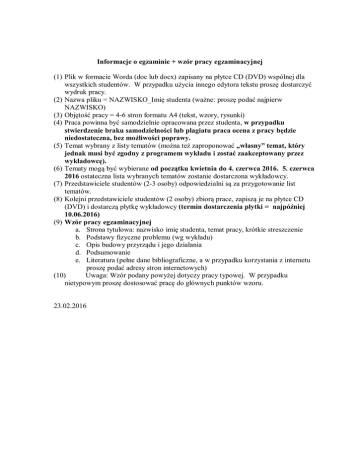 Informacje o egzaminie + wzór pracy egzaminacyjnej (1) Plik w formacie Worda (doc lub docx) zapisany na płytce CD (DVD) wspólnej dla wszystkich studentów. W przypadku użycia innego edytora tekstu proszę dostarczyć wydruk pracy. (2) Nazwa pliku = NAZWISKO_Imię studenta (ważne: proszę podać najpierw NAZWISKO) (3) Objętość pracy = 4-6 stron formatu A4 (tekst, wzory, rysunki) (4) Praca powinna być samodzielnie opracowana przez studenta, w przypadku stwierdzenie braku samodzielności lub plagiatu praca ocena z pracy będzie niedostateczna, bez możliwości poprawy. (5) Temat wybrany z listy tematów (można też zaproponować „własny” temat, który jednak musi być zgodny z programem wykładu i zostać zaakceptowany przez wykładowcę). (6) Tematy mogą być wybierane od początku kwietnia do 4. czerwca 2016. 5. czerwca 2016 ostateczna lista wybranych tematów zostanie dostarczona wykładowcy. (7) Przedstawiciele studentów (2-3 osoby) odpowiedzialni są za przygotowanie list tematów. (8) Kolejni przedstawiciele studentów (2 osoby) zbiorą prace, zapiszą je na płytce CD (DVD) i dostarczą płytkę wykładowcy (termin dostarczenia płytki = najpóźniej 10.06.2016) (9) Wzór pracy egzaminacyjnej a. Strona tytułowa: nazwisko imię studenta, temat pracy, krótkie streszczenie b. Podstawy fizyczne problemu (wg wykładu) c. Opis budowy przyrządu i jego działania d. Podsumowanie e. Literatura (pełne dane bibliograficzne, a w przypadku korzystania z internetu proszę podać adresy stron internetowych) (10) Uwaga: Wzór podany powyżej dotyczy pracy typowej. W przypadku nietypowym proszę dostosować pracę do głównych punktów wzoru. 23.02.2016