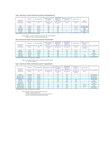 Typy i wła ciwo ci fizyko-mechaniczne pianek S (standardowych) G sto Oznaczenie Eurofoam International Sztywno 40% PN-EN ISO 845 PN-EN ISO 3386-1 kg/m3 kPa S224 19-21,5 3,7-5,8 24-27 3,3-47 S284 Pad. MD3 23-25,5 3,2-4,7 5,5-7,5 Pad. MD5 23-26 26-29 3,2-4,8 Pott 320 26-30 5-7,7 S318 * dopuszcza si inny kolor po uzgodnieniu z odbiorc PN-EN ISO 1798 nie mniej ni kPa Wydłu enie wzgledne przy zerwaniu PN-EN ISO 1798 nie mniej ni % 120 180 120 150 60 180 Wytrzymało na rozci ganie Wytrzymało na rozdzieranie Ilo komórek Barwa podstawowa* ASTM D 3574 F N/cm PN-67/P-04951 szt/cm 100 200 180 90 80 100 4 - 14 ± 3 18 ± 2 11 ± 2 11 ± 2 18 ± 3 PN-EN ISO 1798 nie mniej ni kPa Wydłu enie wzgledne przy zerwaniu PN-EN ISO 1798 nie mniej ni % Odkształcenie trwałe 50% (22h/70°C) PN-EN ISO 1856 nie wi cej ni PN-67/P-04951 szt/cm PN-ISO 3795 nie wi cej ni mm/min Barwa podstawowa* 140 140 240 140 130 180 250 200 250 230 200 150 20 20 20 20 10 10 18 ± 2 14-19 17 ± 2 18 ± 2 17 ± 3 18 ± 2 100 100 100 biała biała szara ciemnoszara szara do uzgodnienia wg uzgodnienia wg uzgodnienia biała biała wg uzgodnienia biała Uwagi: Padiflex - pianka o komórkach regularnych; MD - rednia g sto Pottscorer - pianka o komórkach nieregularnych Typy i wła ciwo ci fizyko-mechaniczne pianek S (technicznych) G sto Oznaczenie Eurofoam International Sztywno 40% PN-EN ISO 845 PN-EN ISO 3386-1 kg/m3 kPa S284 M 24-27 3,4-4,6 24-27 3,3-4,6 S284 MD S313 M 26,5-30 3,6-4,8 S364 M 30,5-35 3,8-5 31-35 3,8-5 S364 MD SF 414 MD 35-41 4-5,5 * dopuszcza si inny kolor po uzgodnieniu z odbiorc Wytrzymało na rozci ganie Ilo komórek Odporno palno na Uwagi: M- dla motoryzacji; D- pianki o okre lonej szybko ci palenia SF - pianka low fogging Typy i wła ciwo ci fizyko-mechaniczne pianek T (specjalnych) G sto Oznaczenie Eurofoam International Sztywno 40% PN-EN ISO 845 PN-EN ISO 3386-1 kg/m3 kPa T23130 19,5-22,5 2,3-3,8 Sweepex T23 21-23,5 2,9-4,5 Sweepex T23 C 21,5-24 3,3-4,8 Sweepex T23 F 21,5-23,5 2,5-3,8 D25130 21,0-25,0 3,0 -3,8 D41170 36,5-40,5 3,6-4,4 D 30130 25-29 2,5-4 Recstat 26 22-25 2,8-3,8 Lamiflex 271 D 23-26 2,4-3,6 Lamiflex 283 D 23-27 3-4,6 Lamiflex 353 D 31,5-34 3,8-5 Hydroseal T37D 34-37 3,8-5,5 * dopuszcza si inny kolor po uzgodnieniu z odbiorc Odkształcenie trwałe Wytrzymało na rozci ganie PN-EN ISO 1856 nie wi cej ni % PN-EN ISO 1798 nie mniej ni kPa Wydłu enie wzgledne przy zerwaniu PN-EN ISO 1798 nie mniej ni % 5 6 5 8 5 15 25 5 5 110 50 50 70 90 120 110 110 120 130 70 160 70 60 100 120 150 250 200 200 180 80 Uwagi: Sweepex - pianka o strukturze gabki naturalnej Recstat - pianka antystatyczna D - pianka samogasn ca z okre lon szybko ci palenia Lamiflex - pianka do laminowania płomieniowego Odporno palno na Ilo komórek PN-ISO 3795 nie wi cej ni mm/min PN-67/P-04951 szt/cm Barwa podstawowa* 100 100 100 100 100 75 100 16 ± 2 16 ± 2 16 ± 3 - wg uzgodnie wg uzgodnie wg uzgodnie wg uzgodnie ciemnoszara szara cimnoszara oran jasnoszara szara jasnoszara ciemnoszara