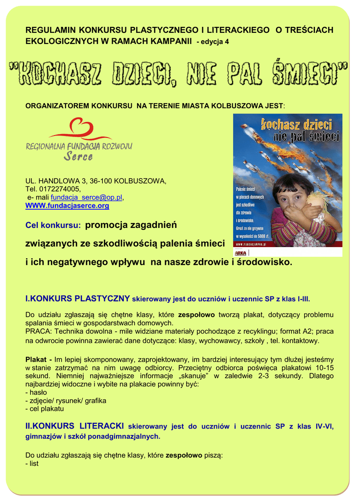 REGULAMIN KONKURSU PLASTYCZNEGO I LITERACKIEGO O TREŚCIACH EKOLOGICZNYCH W RAMACH KAMPANII - edycja 4 ORGANIZATOREM KONKURSU NA TERENIE MIASTA KOLBUSZOWA JEST: UL. HANDLOWA 3, 36-100 KOLBUSZOWA, Tel. 0172274005, e- mali [email protected], WWW.fundacjaserce.org Cel konkursu: promocja zagadnień związanych ze szkodliwością palenia śmieci i ich negatywnego wpływu na nasze zdrowie i środowisko. I.KONKURS PLASTYCZNY skierowany jest do uczniów i uczennic SP z klas I-III. Do udziału zgłaszają się chętne klasy, które zespołowo tworzą plakat, dotyczący problemu spalania śmieci w gospodarstwach domowych. PRACA: Technika dowolna - mile widziane materiały pochodzące z recyklingu; format A2; praca na odwrocie powinna zawierać dane dotyczące: klasy, wychowawcy, szkoły , tel. kontaktowy. Plakat - Im lepiej skomponowany, zaprojektowany, im bardziej interesujący tym dłużej jesteśmy w stanie zatrzymać na nim uwagę odbiorcy. Przeciętny odbiorca poświęca plakatowi 10-15 sekund. Niemniej najważniejsze informacje „skanuje” w zaledwie 2-3 sekundy. Dlatego najbardziej widoczne i wybite na plakacie powinny być: - hasło - zdjęcie/ rysunek/ grafika - cel plakatu II.KONKURS LITERACKI skierowany jest do uczniów i uczennic SP z klas IV-VI, gimnazjów i szkół ponadgimnazjalnych. Do udziału zgłaszają się chętne klasy, które zespołowo piszą: - list - apel - komunikat do dorosłych, dotyczący problemu spalania śmieci w gospodarstwach domowych. PRACA powinna: -być napisana w formacie A-4/ prace powyżej tej wielkości nie zostaną oceniane/; -zachować cechy gatunku literackiego - cechy listu, apelu lub komunikatu; -promować wartości proekologiczne; -być napisana ręcznie lub w formie elektronicznej i wysłana na adres: [email protected] lub przekazana do biura fundacji; -zawierać dane dotyczące klasy, szkoły, opiekuna, tel. kontaktowy. List - Wysyłanie korespondencji do mieszkańców jest coraz bardziej docenianą formą przekazu. Okazuje się, że ma ona o wiele większą niż ulotka siłę oddziaływania. Wasze prace powinny przypominać tradycyjny list. Jeśli to możliwe, powinny być także skierowane imiennie do określonej osoby. Ponadto własnoręczny podpis, lub odręczny podpis wydrukowany innym kolorem, sprawiają wrażenie jakby list był adresowany dokładnie do jego odbiorcy, a to zwiększa prawdopodobieństwo, że list zostanie przeczytany. Starajcie się, aby w Waszym liście (komunikacie, apelu) znalazły się podstawowe elementy: - kim jesteście, bądź kim jesteś - dlaczego zabieracie/zabierasz głos - jak jest - jak powinno być - jak to osiągnąć Apel - bezpośrednie wezwanie, żądanie wysłuchania i odezwy – działania mającego na celu zastosowania się do treści niesionej słowami, kierowane przez autora ku czytelnikom lub ku słuchaczom apelu. Treść apelu często jest wyrazem uczuć mających łączyć nadawcę i jego odbiorców. Komunikat prasowy - Komunikat prasowy jest napisany w celu naświetlenia ważnych wydarzeń, programów lub kawałka informacji przez organizacje, która zwięźle opisuje KTO, CO, GDZIE, KIEDY, DLACZEGO i JAK jest częścią opisywanej historii. 1. Udział w konkursie jest dobrowolny i otwarty. 2.Konkurs ma charakter rywalizacji zespołowej, czyli z każdej szkoły może wziąć udział dowolna liczba zespołów - reprezentujących klasę, którzy przygotują prace konkursowe. 3.Zespół konkursowy może liczyć od 10 do 30 uczniów, a reprezentowany jest przez Opiekuna – Nauczyciela. 4.Warunkiem uczestnictwa zespołu w konkursie jest zgłoszenie o przystąpieniu do konkursu drogą elektroniczną na adres [email protected] lub telefonicznie pod nr tel.0172274005 w terminie 7 dni od ogłoszenia konkursu. Zgłoszenie stanowi potwierdzenie zaakceptowania warunków regulaminu Konkursu. 5. Termin składania prac upływa z dniem 10.11.2012r. 6. Laureatami konkursu będą : Konkurs plastyczny: PLAKAT- 1 zespół/ klasa w kat. I-III SP Konkurs literacki: LIST/ APEL/KOMUNIKAT- 1 zespół/ klasa w kat. IV-VI SP LIST/ APEL/KOMUNIKAT - 1 zespół/ klasa w kat. gimnazjum LIST/ APEL/KOMUNIKAT - 1 zespół/ klasa w kat. szkoła ponadgimnazjalna Organizator przewiduje również wyróżnienia dla najlepszego zespołu- lidera z każdej szkoły. 7. Oceny prac dokona jury powołane przez organizatora. 8. Oceniana będzie: · pomysłowość i ciekawe aranżacje plastyczne · zachowanie cech gatunku literackiego · estetyka zapisu (mile widziane listy pisane ręcznie). 9. Oficjalne rezultaty zostaną przedstawione na stronie WWW.fundacjaserce.org 10. Laureaci konkursu zostaną poinformowani telefonicznie bądź mailowo 11. Łączna wartość nagród to 1500 zł. Na podstawie protokołu Jury Konkursowego, Fundacja przyznaje nagrody w w/w kategoriach (nagroda w postaci dofinansowania do inicjatyw klasowych np. wycieczki) 12. Uwagi końcowe: PRZEKAZANE PRACE NIE PODLEGAJĄ ZWROTOWI. WSZYSTKIE PRACE BIORĄCE UDZIAŁ W KONKURSIE POZOSTANĄ WŁASNOŚCIĄ ORGANIZATORA, KTÓRY ZASTRZEGA SOBIE PRAWO DO ICH PUBLIKACJI 10.10.2012 – ogłoszenie konkursu 12.11.2012- ostateczny termin składania prac 19.11.2012- ogłoszenie wyników Organizator zastrzega sobie prawo interpretacji regulaminu oraz dokonywania zmian w jego treści. Zapraszamy do udziału! „Życie to raj, do którego klucze są w naszych rękach” F. Dostojewski Kochasz dzieci, nie pal śmieci Fundacja Ekologiczna ARKA prowadzi kampanię pt. „Kochasz dzieci, nie pal śmieci”. Palenie śmieci w piecach domowych jest szkodliwe dla zdrowia i środowiska. Grozi za niej grzywna w wysokości 5 000 zł. Kampania realizowana jest przy wsparciu środków Unii Europejskiej. Jeżeli w twojej gminie mieszkańcy palą śmieci, jeżeli robi to twój sąsiad, to możesz zgłosić się do ARKI po bezpłatne plakaty i ulotki. Raport Komisji Europejskiej informuje, iż co roku na choroby wywołane złym stanem powietrza umiera 28 tysięcy Polaków. W Unii, co dziesiąta osoba umi