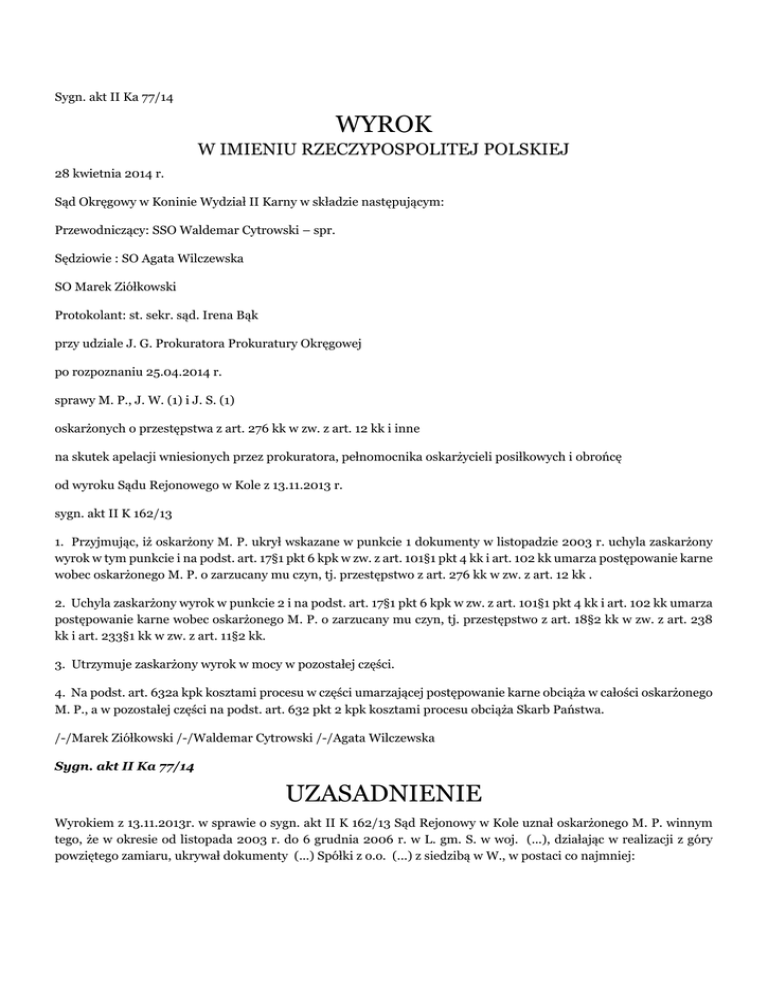 Sygn. akt II Ka 77/14 WYROK W IMIENIU RZECZYPOSPOLITEJ POLSKIEJ 28 kwietnia 2014 r. Sąd Okręgowy w Koninie Wydział II Karny w składzie następującym: Przewodniczący: SSO Waldemar Cytrowski – spr. Sędziowie : SO Agata Wilczewska SO Marek Ziółkowski Protokolant: st. sekr. sąd. Irena Bąk przy udziale J. G. Prokuratora Prokuratury Okręgowej po rozpoznaniu 25.04.2014 r. sprawy M. P., J. W. (1) i J. S. (1) oskarżonych o przestępstwa z art. 276 kk w zw. z art. 12 kk i inne na skutek apelacji wniesionych przez prokuratora, pełnomocnika oskarżycieli posiłkowych i obrońcę od wyroku Sądu Rejonowego w Kole z 13.11.2013 r. sygn. akt II K 162/13 1. Przyjmując, iż oskarżony M. P. ukrył wskazane w punkcie 1 dokumenty w listopadzie 2003 r. uchyla zaskarżony wyrok w tym punkcie i na podst. art. 17§1 pkt 6 kpk w zw. z art. 101§1 pkt 4 kk i art. 102 kk umarza postępowanie karne wobec oskarżonego M. P. o zarzucany mu czyn, tj. przestępstwo z art. 276 kk w zw. z art. 12 kk . 2. Uchyla zaskarżony wyrok w punkcie 2 i na podst. art. 17§1 pkt 6 kpk w zw. z art. 101§1 pkt 4 kk i art. 102 kk umarza postępowanie karne wobec oskarżonego M. P. o zarzucany mu czyn, tj. przestępstwo z art. 18§2 kk w zw. z art. 238 kk i art. 233§1 kk w zw. z art. 11§2 kk. 3. Utrzymuje zaskarżony wyrok w mocy w pozostałej części. 4. Na podst. art. 632a kpk kosztami procesu w części umarzającej postępowanie karne obciąża w całości oskarżonego M. P., a w pozostałej części na podst. art. 632 pkt 2 kpk kosztami procesu obciąża Skarb Państwa. /-/Marek Ziółkowski /-/Waldemar Cytrowski /-/Agata Wilczewska Sygn. akt II Ka 77/14 UZASADNIENIE Wyrokiem z 13.11.2013r. w sprawie o sygn. akt II K 162/13 Sąd Rejonowy w Kole uznał oskarżonego M. P. winnym tego, że w okresie od listopada 2003 r. do 6 grudnia 2006 r. w L. gm. S. w woj. (...), działając w realizacji z góry powziętego zamiaru, ukrywał dokumenty (...) Spółki z o.o. (...) z siedzibą w W., w postaci co najmniej: • dokumentów dotyczących posiadanych przez Spółkę rachunków bankowych z lat 2000-2003 w postaci umów, wyciągów ze stanami gotówki, wykazów operacji dokonywanych na tych rachunkach, kart wzorów podpisów i wykazów osób uprawnionych do korzystania z nich, • raportów kasowych za okres od powstania Spółki do 22 września 2003 r., • wykazów środków trwałych, wartości niematerialnych i prawnych za okres od powstania Spółki do 31 sierpnia 2003 r., • wykazów stanów magazynowych za okres od powstania Spółki do 31 sierpnia 2003 r., • faktur zakupów i sprzedaży za okres od powstania Spółki do 22 września 2003 r., poprzez uzgodnienie z inną ustaloną osobą przewiezienia tych dokumentów w listopadzie 2003 r. bez wiedzy nowych władz Spółki (...) do W. i zgłoszenia ich fikcyjnej kradzieży oraz przechowywania ich na terenie W. przez okres około dwóch miesięcy, a następnie po ich przewiezieniu do L. poprzez ich złożenie w miejscu nieznanym uprawnionym i nie wydanie ich pomimo żądań zarządowi tej Spółki, nie mając prawa wyłącznie rozporządzać tymi dokumentami, z uwagi na zmianę zarządu tej Spółki, to jest przestępstwa z art. 276 k.k. w zw. z art. 12 k.k. i za to na podstawie art. 276 k.k. skazał go na karę 8 miesięcy pozbawienia wolności. Oskarżonego M. P. Sąd uznał winnym tego, że w listopadzie 2003 r. w L. gm. S. w woj. (...), chcąc aby inna osoba dokonała czynu zabronionego, nakłonił Prezesa Spółki (...) Sp. z o.o. w W. B. W. (1) do powiadomienia, organu powołanego do ścigania, o niepopełnionym przestępstwie oraz do złożenia, mających służyć jako dowód w sprawie RSD (...) ( (...)D (...), prowadzonej przez Komendę Rejonową Policji W. III, fałszywych zeznań dotyczących włamania i kradzieży samochodu marki (...) o nr rej. (...), wraz z dokumentami finansowo- księgowymi spółek (...) Sp. z o.o. i (...) Sp. z o.o. z siedzibą w W., która faktycznie nie miała miejsca tj. przestępstwa z art. 18 § 2 k.k. w zw. z art. 238 k.k. i art. 233 § 1 k.k. w zw. z art. 11 § 2 k.k. i za to na podstawie art. 19 § 1 kk w zw. z art. 233 § 1 k.k. w zw. z art. 11 § 3 k.k. skazał go na karę 1 roku i 6 miesięcy pozbawienia wolności. Na podstawie art. 85 k.k. i art. 86 § 1 k.k. wymierzył oskarżonemu M. P. karę łączną 1 roku i 8 miesięcy pozbawienia wolności, której wykonanie na podstawie art. 69 § 1 i § 2 k.k. i art. 70 § 1 pkt 1 k.k. warunkowo zawiesił na okres 4 lat próby. Na podstawie art. 71 § 1 k.k. Sąd skazał oskarżonego M. P. na karę grzywny w liczbie 150 stawek dziennych po 50 złotych Na podstawie art. 73 § 1 k.k. oddał oskarżonego M. P. w okresie próby pod dozór kuratora. Sąd uniewinnił oskarżonych J. W. (1) i J. S. (1) od tego, że okresie od 06 lipca 2004 r. do 19 grudnia 2006 roku w L., gm. S., w woj. (...), działając wspólnie i w porozumieniu z M. P. oraz w realizacji z góry powziętego zamiaru, odmawiali wydania, pomimo żądań ze strony nowego Zarządu Spółki z o.o. (...) oraz ukrywali dokumenty finansowo-księgowe i kadrowo-płacowe firmy (...) Sp. z o.o. z siedzibą w W., nie mając prawa wyłącznie nimi rozporządzać z uwagi na zmianę Zarządu Spółki, tj. od popełnienia przestępstwa z art. 276 k.k. w zw. z art. 12 k.k. Wyrok zaskarżył prokurator, który zarzucił błąd w ustaleniach faktycznych, przyjętych za podstawę orzeczenia i mający wpływ na jego treść, a polegający na uznaniu przez Sąd I instancji, iż materiał dowodowy zebrany w sprawie, nie daje podstaw do przyjęcia, że oskarżeni J. W. (1) i J. S. (1), dopuścili się zarzucanego im w akcie oskarżenia czynu, zakwalifikowanego z art. 276 k.k. w zw. z art. 12 k.k. i w konsekwencji, prowadzący do uniewinnienia tych oskarżonych oraz do przyjęcia, iż oskarżony M. P. czynu z art. 276 k.k. w zw. z art. 12 k.k., dopuścił się sam, podczas gdy prawidłowa ocena dowodów zebranych w sprawie, w ich wzajemnym 