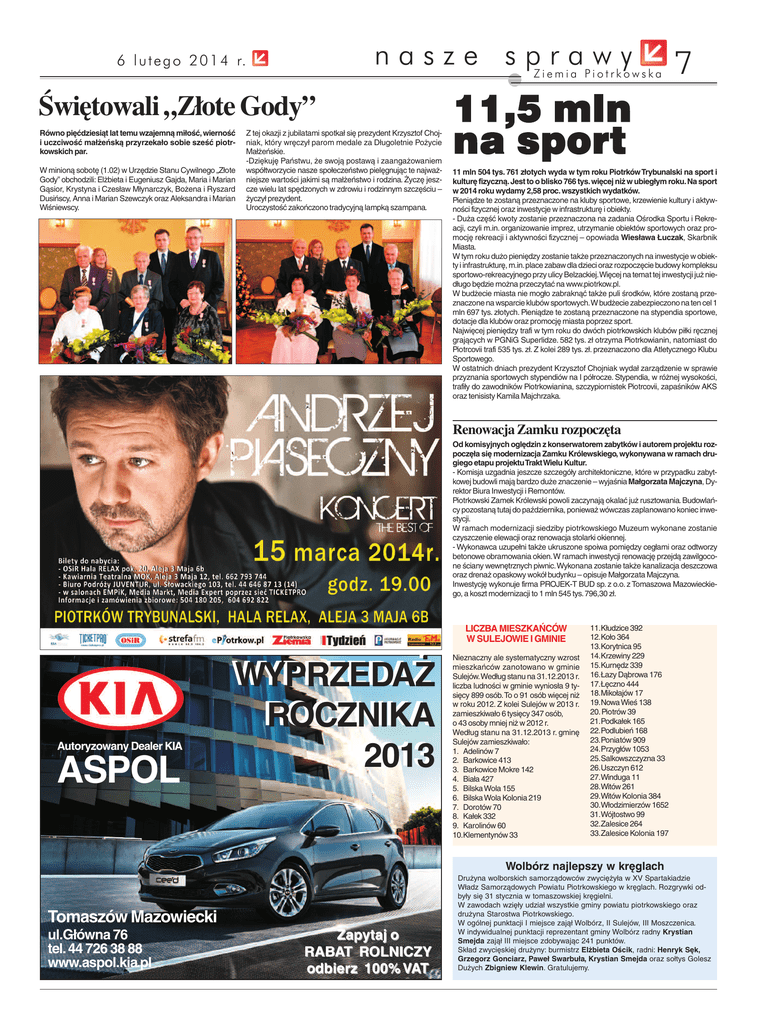 nasze sprawy 6 l u t e g o 2 0 1 4 r. Ziemia Piotrkowska Świętowali „Złote Gody” Równo pięćdziesiąt lat temu wzajemną miłość, wierność i uczciwość małżeńską przyrzekało sobie sześć piotrkowskich par. W minioną sobotę (1.02) w Urzędzie Stanu Cywilnego „Złote Gody” obchodzili: Elżbieta i Eugeniusz Gajda, Maria i Marian Gąsior, Krystyna i Czesław Młynarczyk, Bożena i Ryszard Dusińscy, Anna i Marian Szewczyk oraz Aleksandra i Marian Wiśniewscy. Z tej okazji z jubilatami spotkał się prezydent Krzysztof Chojniak, który wręczył parom medale za Długoletnie Pożycie Małżeńskie. -Dziękuję Państwu, że swoją postawą i zaangażowaniem współtworzycie nasze społeczeństwo pielęgnując te najważniejsze wartości jakimi są małżeństwo i rodzina. Życzę jeszcze wielu lat spędzonych w zdrowiu i rodzinnym szczęściu – życzył prezydent. Uroczystość zakończono tradycyjną lampką szampana. 7 11,5 mln na sport 11 mln 504 tys. 761 złotych wyda w tym roku Piotrków Trybunalski na sport i kulturę fizyczną. Jest to o blisko 766 tys. więcej niż w ubiegłym roku. Na sport w 2014 roku wydamy 2,58 proc. wszystkich wydatków. Pieniądze te zostaną przeznaczone na kluby sportowe, krzewienie kultury i aktywności fizycznej oraz inwestycje w infrastrukturę i obiekty. - Duża część kwoty zostanie przeznaczona na zadania Ośrodka Sportu i Rekreacji, czyli m.in. organizowanie imprez, utrzymanie obiektów sportowych oraz promocję rekreacji i aktywności fizycznej – opowiada Wiesława Łuczak, Skarbnik Miasta. W tym roku dużo pieniędzy zostanie także przeznaczonych na inwestycje w obiekty i infrastrukturę, m.in.place zabaw dla dzieci oraz rozpoczęcie budowy kompleksu sportowo-rekreacyjnego przy ulicy Belzackiej.Więcej na temat tej inwestycji już niedługo będzie można przeczytać na www.piotrkow.pl. W budżecie miasta nie mogło zabraknąć także puli środków, które zostaną przeznaczone na wsparcie klubów sportowych.W budżecie zabezpieczono na ten cel 1 mln 697 tys. złotych. Pieniądze te zostaną przeznaczone na stypendia sportowe, dotacje dla klubów oraz promocję miasta poprzez sport. Najwięcej pieniędzy trafi w tym roku do dwóch piotrkowskich klubów piłki ręcznej grających w PGNiG Superlidze. 582 tys. zł otrzyma Piotrkowianin, natomiast do Piotrcovii trafi 535 tys. zł. Z kolei 289 tys. zł. przeznaczono dla Atletycznego Klubu Sportowego. W ostatnich dniach prezydent Krzysztof Chojniak wydał zarządzenie w sprawie przyznania sportowych stypendiów na I półrocze. Stypendia, w różnej wysokości, trafiły do zawodników Piotrkowianina, szczypiornistek Piotrcovii, zapaśników AKS oraz tenisisty Kamila Majchrzaka. Renowacja Zamku rozpoczęta Od komisyjnych oględzin z konserwatorem zabytków i autorem projektu rozpoczęła się modernizacja Zamku Królewskiego, wykonywana w ramach drugiego etapu projektu Trakt Wielu Kultur. - Komisja uzgadnia jeszcze szczegóły architektoniczne, które w przypadku zabytkowej budowli mają bardzo duże znaczenie – wyjaśnia Małgorzata Majczyna, Dyrektor Biura Inwestycji i Remontów. Piotrkowski Zamek Królewski powoli zaczynają okalać już rusztowania. Budowlańcy pozostaną tutaj do października, ponieważ wówczas zaplanowano koniec inwestycji. W ramach modernizacji siedziby piotrkowskiego Muzeum wykonane zostanie czyszczenie elewacji oraz renowacja stolarki okiennej. - Wykonawca uzupełni także ukruszone spoiwa pomiędzy cegłami oraz odtworzy betonowe obramowania okien.W ramach inwestycji renowację przejdą zawilgocone ściany wewnętrznych piwnic.Wykonana zostanie także kanalizacja deszczowa oraz drenaż opaskowy wokół budynku – opisuje Małgorzata Majczyna. Inwestycję wykonuje firma PROJEK-T BUD sp. z o.o. z Tomaszowa Mazowieckiego, a koszt modernizacji to 1 mln 545 tys. 796,30 zł. LICZBA MIESZKAŃCÓW W SULEJOWIE I GMINIE Autoryzowany Dealer KIA ASPOL WYPRZEDAŻ WYPRZEDAŻ ROCZNIKA ROCZNIKA 2013 2013 Nieznaczny ale systematyczny wzrost mieszkańców zanotowano w gminie Sulejów.Według stanu na 31.12.2013 r. liczba ludności w gminie wyniosła 9 tysięcy 899 osób.To o 91 osób więcej niż w roku 2012. Z kolei Sulejów w 2013 r. zamieszkiwało 6 tysięcy 347 osób, o 43 osoby mniej niż w 2012 r. Według stanu na 31.12.2013 r. gminę Sulejów zamieszkiwało: 1. Adelinów 7 2. Barkowice 413 3. Barkowice Mokre 142 4. Biała 427 5. Bilska Wola 155 6. Bilska Wola Kolonia 219 7. Dorotów 70 8. Kałek 332 9. Karolinów 60 10.Klementynów 33 11.Kłudzice 392 12.Koło 364 13.Korytnica 95 14.Krzewiny 229 15.Kurnędz 339 16.Łazy Dąbrowa 176 17.Łęczno 444 18.Mikołajów 17 19.Nowa Wieś 138 20. Piotrów 39 21.Podkałek 165 22.Podlubień 168 23.Poniatów 909 24.Przygłów 1053 25.Salkowszczyzna 33 26.Uszczyn 612 27.Winduga 11 28.Witów 261 29.Witów Kolonia 384 30.Włodzimierzów 1652 31.Wójtostwo 99 32.Zalesice 264 33.Zalesice Kolonia 197 Wolbórz najlepszy w kręglach Tomaszów Mazowiecki ul.Główna 76 tel. 44 726 38 88 www.aspol.kia.pl Zapytaj o RABAT ROLNICZY odbierz 100% VAT Drużyna wolborskich samorządowców zwyciężyła w XV Spartakiadzie Władz Samorządowych Powiatu Piotrkowskiego w kręglach. Rozgrywki odbyły się 31 stycznia w tomaszowskiej kręgielni. W zawodach wzięły udział wszystkie gminy powiatu piotrkowskiego oraz drużyna Starostwa Piotrkowskiego. W ogólnej punktacji I miejsce zajął Wolbórz, II Sulejów, III Moszczenica. W indywidualnej punktacji reprezentant gminy Wolbórz radny Krystian Smejda zajął III miejsce zdobywając 241 punktów. Skład zwycięskiej drużyny: burmistrz Elżbieta Ościk, radni: Henryk Sęk, Grzegorz Gonciarz, Paweł Swarbuła, Krystian Smejda oraz sołtys Golesz Dużych Zbigniew Klewin. Gratulujemy.