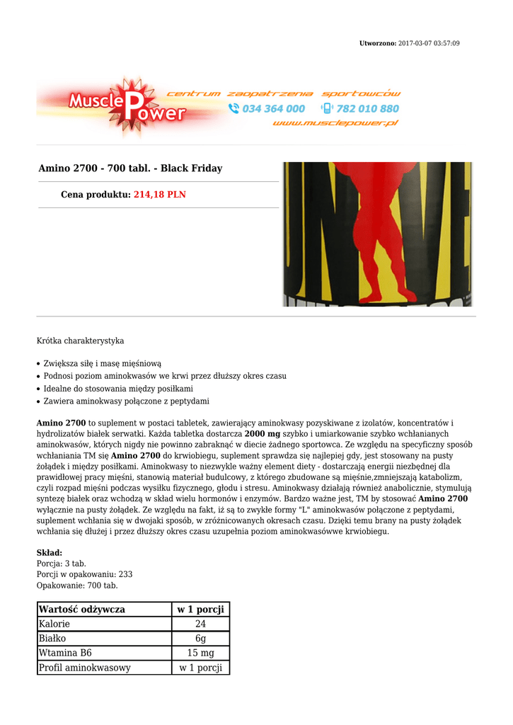 Utworzono: 2017-03-07 03:57:09 Amino 2700 - 700 tabl. - Black Friday Cena produktu: 214,18 PLN Krótka charakterystyka ● Zwiększa siłę i masę mięśniową ● Podnosi poziom aminokwasów we krwi przez dłuższy okres czasu ● Idealne do stosowania między posiłkami ● Zawiera aminokwasy połączone z peptydami Amino 2700 to suplement w postaci tabletek, zawierający aminokwasy pozyskiwane z izolatów, koncentratów i hydrolizatów białek serwatki. Każda tabletka dostarcza 2000 mg szybko i umiarkowanie szybko wchłanianych aminokwasów, których nigdy nie powinno zabraknąć w diecie żadnego sportowca. Ze względu na specyficzny sposób wchłaniania TM się Amino 2700 do krwiobiegu, suplement sprawdza się najlepiej gdy, jest stosowany na pusty żołądek i między posiłkami. Aminokwasy to niezwykle ważny element diety - dostarczają energii niezbędnej dla prawidłowej pracy mięśni, stanowią materiał budulcowy, z którego zbudowane są mięśnie,zmniejszają katabolizm, czyli rozpad mięśni podczas wysiłku fizycznego, głodu i stresu. Aminokwasy działają również anabolicznie, stymulują syntezę białek oraz wchodzą w skład wielu hormonów i enzymów. Bardzo ważne jest, TM by stosować Amino 2700 wyłącznie na pusty żołądek. Ze względu na fakt, iż są to zwykłe formy "L" aminokwasów połączone z peptydami, suplement wchłania się w dwojaki sposób, w zróżnicowanych okresach czasu. Dzięki temu brany na pusty żołądek wchłania się dłużej i przez dłuższy okres czasu uzupełnia poziom aminokwasówwe krwiobiegu. Skład: Porcja: 3 tab. Porcji w opakowaniu: 233 Opakowanie: 700 tab. Wartość odżywcza w 1 porcji Kalorie 24 Białko 6g Wtamina B6 Profil aminokwasowy 15 mg w 1 porcji L-lizyna 555 mg L-histydyna 121 mg L-arginina 145 mg L-treonina 394 mg L-fenyloalanina 209 mg L-metionina 129 mg L-izoleucyna 378 mg L-walina 354 mg L-seryna 290 mg L-kwas glutaminowy 1038 mg L-prolina 338 mg L-glicyna 113 mg L-alanina 298 mg L-cysteina 153 mg L-tyrozyna 185 mg L-kwas asparaginowy 652 mg L-leucyna 668 mg Tryptofan 105 mg Dawakowanie: 1-4 porcji dziennie (1 porcja = 3 tabl). Ilość Adres: http://www.muscle.trustnet.pl/ 700 tabl. Telefon: 34 36 43 000, 782 010 880 Email: [email protected]