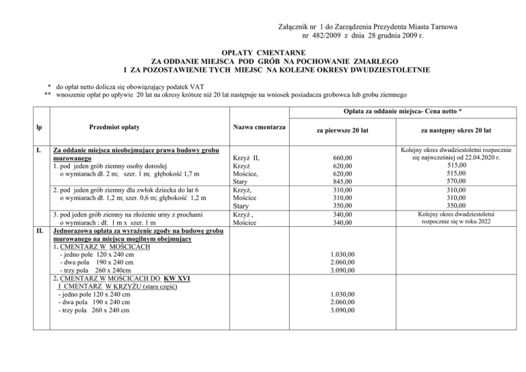 Załącznik nr 1 do Zarządzenia Prezydenta Miasta Tarnowa nr 482/2009 z dnia 28 grudnia 2009 r. OPŁATY CMENTARNE ZA ODDANIE MIEJSCA POD GRÓB NA POCHOWANIE ZMARŁEGO I ZA POZOSTAWIENIE TYCH MIEJSC NA KOLEJNE OKRESY DWUDZIESTOLETNIE * do opłat netto dolicza się obowiązujący podatek VAT ** wnoszenie opłat po upływie 20 lat na okresy krótsze niż 20 lat następuje na wniosek posiadacza grobowca lub grobu ziemnego Opłata za oddanie miejsca- Cena netto * lp I. Przedmiot opłaty Za oddanie miejsca nieobejmujące prawa budowy grobu murowanego 1. pod jeden grób ziemny osoby dorosłej o wymiarach dł. 2 m; szer. 1 m; głębokość 1,7 m 2. pod jeden grób ziemny dla zwłok dziecka do lat 6 o wymiarach dł. 1,2 m; szer. 0,6 m; głębokość 1,2 m Nazwa cmentarza Krzyż II, Krzyż Mościce, Stary Krzyż, Mościce Stary II. 3. pod jeden grób ziemny na złożenie urny z prochami o wymiarach : dł. 1 m x szer. 1 m Jednorazowa opłata za wyrażenie zgody na budowę grobu murowanego na miejscu mogilnym obejmujący 1. CMENTARZ W MOŚCICACH - jedno pole 120 x 240 cm - dwa pola 190 x 240 cm - trzy pola 260 x 240cm 2. CMENTARZ W MOŚCICACH DO KW XVI I CMENTARZ W KRZYŻU (stara część) - jedno pole 120 x 240 cm - dwa pola 190 x 240 cm - trzy pola 260 x 240 cm Krzyż , Mościce za pierwsze 20 lat za następny okres 20 lat 660,00 620,00 620,00 845,00 310,00 310,00 350,00 340,00 340,00 Kolejny okres dwudziestoletni rozpocznie się najwcześniej od 22.04.2020 r. 515,00 515,00 570,00 310,00 310,00 350,00 Kolejny okres dwudziestoletni rozpocznie się w roku 2022 1.030,00 2.060,00 3.090,00 1.030,00 2.060,00 3.090,00 Opłata za oddanie miejsca – Cena netto * lp Przedmiot opłaty Nazwa cmentarza za pierwsze 20 lat 3. CMENTARZ STARY - jedno pole 120 x 240 - dwa pola 190 x 240 4. CMENTARZ W KRZYŻU I MOŚCICACH - miejsce pod grób murowany na urny o wymiarach : dł. 1 m; szer. 1 m. III. IV. za następny okres 20 lat** 1.240,00 2.470,00 515,00 Za pokrycie udziału w kosztach utrzymania cmentarza przez posiadających groby murowane uiszczana na kolejne okresy 20 letnie opłata od powierzchni zajmowanej przez grobowiec ( podstawowy wymiar w cm : dł. 240 x szer. 110 x i wielokrotność szerokości. - Cmentarz Krzyż - Cmentarz Mościce - Cmentarz Stary - Za oddanie miejsca nieobejmujące prawa budowy grobu murowanego 1. pod jeden grób ziemny osoby dorosłej o wymiarach dł. 2 m; szer. 1 m; głębokość 1,7 m Klikowa 870,00 2. pod jeden grób ziemny dla zwłok dziecka do lat 6 o wymiarach dł. 1,2 m; szer. 0,6 m; głębokość 1,2 m Klikowa 420,00 515,00 515,00 515,00 Opłaty obowiązywać będą w 2028 r. 3. pod jeden grób ziemny na złożenie urny z prochami o wymiarach: dł. 1 m x szer. 1 m V. Jednorazowa opłata za wyrażenie zgody na budowę grobu murowanego na miejscu mogilnym obejmujący: - jedno pole 120 x 240 cm - dwa pola 190 x 240 cm - trzy pola 260 x 240 cm - pole pod grób murowany na urny o wymiarach do 1m x 1m Klikowa 420,00 Klikowa Klikowa Klikowa Klikowa 870,00 1.860,00 2.170,00 820,00 Załącznik nr 2 do Zarządzenia Prezydenta Miasta Tarnowa Nr 482/2009 z dnia 28 grudnia 2009 r. CENNIK ZA WYKONANIE POGRZEBU NA CMENTARZACH KOMUNALNYCH W PODSTAWOWYM ZAKRESIE CEREMONII W DNI ROBOCZE Usługa obejmuje : 1. wykopanie grobu ziemnego , złożenie trumny, zasypanie i uformowanie mogiły 2. przygotowanie grobowca poprze zdjęcie płyty dekoracyjnej i sanitarnej, złożenie trumny w grobowcu, założenie płyty sanitarnej, jej zaspoinowanie zaprawą piaskowo – wapienną , osadzenie i zamknięcie płyty dekoracyjnej 3. w grobowcu wielokondygnacyjnym: przygotowanie rusztowania, pochowanie zmarłego, zamurowanie otworu cegłami na zaprawie piaskowo- cementowo – wapiennej, demontaż rusztowania * do opłat netto dolicza się obowiązujący podatek VAT Lp. Zakres usług 1. - do mogiły ziemnej zwykłej - do mogiły ziemnej pogłębionej - do grobowca naziemnego z płytą pionową - do grobowca naziemnego z płytą poziomą - do grobowca podziemnego - do grobowca wielokondygnacyjnego – kondygnacja I i II - do grobu urnowego - do grobowca wielokondygnacyjnego – kondygnacja III i IV CENY ZA INNE USŁUGI 1. przygotowanie kaplicy cmentarnej do ceremonii pogrzebowej - bez Mszy Świętej - z Mszą Świętą 2. w okresie zimowym obejmującym ogrzewanie kaplicy - bez Mszy Świętej - z Mszą Świętą 2. Pochowanie osoby dorosłej opłata netto * Pochowanie dziecka do lat 6 opłata netto* Pochowanie urny opłata netto* 610,00 840,00 560,00 670,00 760,00 360,00 410,00 420,00 470,00 600,00 330,00 350,00 380,00 450,00 550,00 - 450,00 - 380,00 230,00 650,00 520,00 430,00 160,00 210,00 160,00 210,00 160,00 210,00 210,00 260,00 210,00 260,00 210,00 260,00 Załącznik nr 3 do Zarządzenia Prezydenta Miasta Tarnowa nr 482/2009 z dnia 28 grudnia 2009 r. CENNIK ZA ZORGANIZOWANIE I WYKONANIE POGRZEBU, KTÓREGO KOSZTY PONOSI GMINA MIASTA TARNOWA * do opłat netto dolicza się obowiązujący podatek VAT lp Przedmiot opłaty Opłata - cena netto * 1. Przewóz zmarłego w granicach administracyjnych miasta 130,00 2. Czynności żałobników w czasie przewozu zmarłego (4 osoby)- zakres usługi obejmuje: załadunek trumny i przewóz na wskazane przez klienta miejsce, złożenie ciała w trumnie, załadunek trumny ze zmarłym na środek transportu, przeniesienie trumny do kaplicy lub wniesienie do kościoła 205,00 3. Udział żałobników w ceremonii pogrzebowej - zakres usługi obejmuje: udział 4-ch żałobników do przeniesienia trumny z kaplicy cmentarnej do grobu 215,00 4. Korzystanie z pomieszczenia kaplicy do pogrzebu - przygotowanie i złożenie trumny na katafalku, oświetlenie kaplicy, użycie dzwonu 110,00 5. Pochowanie osoby zmarłej do mogiły ziemnej lub grobowca – usługa obejmuje : wykopanie mogiły, złożenie trumny, zasypanie i uformowanie grobu, korekta uformowania grobu po stabilizacji gruntu; przygotowanie grobowca poprzez zdjęcie płyt dekoracyjnej i sanitarnej, demontaż kostki, prace ziemne
