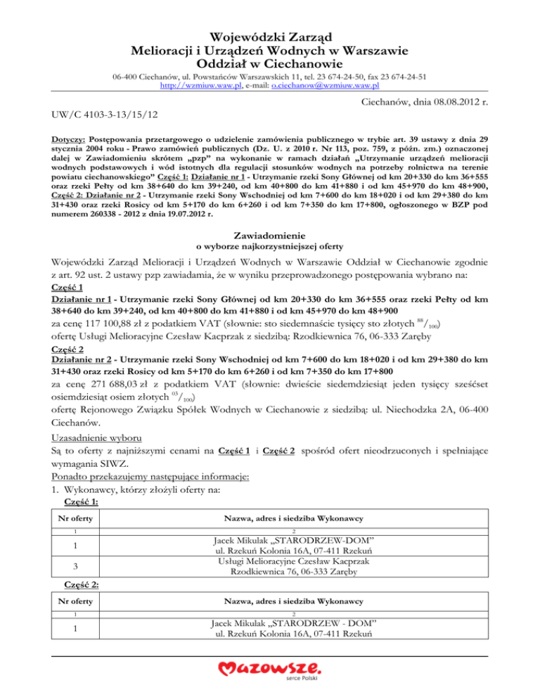 Wojewódzki Zarząd Melioracji i Urządzeń Wodnych w Warszawie Oddział w Ciechanowie 06-400 Ciechanów, ul. Powstańców Warszawskich 11, tel. 23 674-24-50, fax 23 674-24-51 http://wzmiuw.waw.pl, e-mail: [email protected] Ciechanów, dnia 08.08.2012 r. UW/C 4103-3-13/15/12 Dotyczy: Postępowania przetargowego o udzielenie zamówienia publicznego w trybie art. 39 ustawy z dnia 29 stycznia 2004 roku - Prawo zamówień publicznych (Dz. U. z 2010 r. Nr 113, poz. 759, z późn. zm.) oznaczonej dalej w Zawiadomieniu skrótem „pzp” na wykonanie w ramach działań „Utrzymanie urządzeń melioracji wodnych podstawowych i wód istotnych dla regulacji stosunków wodnych na potrzeby rolnictwa na terenie powiatu ciechanowskiego” Część 1: Działanie nr 1 - Utrzymanie rzeki Sony Głównej od km 20+330 do km 36+555 oraz rzeki Pełty od km 38+640 do km 39+240, od km 40+800 do km 41+880 i od km 45+970 do km 48+900, Część 2: Działanie nr 2 - Utrzymanie rzeki Sony Wschodniej od km 7+600 do km 18+020 i od km 29+380 do km 31+430 oraz rzeki Rosicy od km 5+170 do km 6+260 i od km 7+350 do km 17+800, ogłoszonego w BZP pod numerem 260338 - 2012 z dnia 19.07.2012 r. Zawiadomienie o wyborze najkorzystniejszej oferty Wojewódzki Zarząd Melioracji i Urządzeń Wodnych w Warszawie Oddział w Ciechanowie zgodnie z art. 92 ust. 2 ustawy pzp zawiadamia, że w wyniku przeprowadzonego postępowania wybrano na: Część 1 Działanie nr 1 - Utrzymanie rzeki Sony Głównej od km 20+330 do km 36+555 oraz rzeki Pełty od km 38+640 do km 39+240, od km 40+800 do km 41+880 i od km 45+970 do km 48+900 za cenę 117 100,88 zł z podatkiem VAT (słownie: sto siedemnaście tysięcy sto złotych 88/100) ofertę Usługi Melioracyjne Czesław Kacprzak z siedzibą: Rzodkiewnica 76, 06-333 Zaręby Część 2 Działanie nr 2 - Utrzymanie rzeki Sony Wschodniej od km 7+600 do km 18+020 i od km 29+380 do km 31+430 oraz rzeki Rosicy od km 5+170 do km 6+260 i od km 7+350 do km 17+800 za cenę 271 688,03 zł z podatkiem VAT (słownie: dwieście siedemdziesiąt jeden tysięcy sześćset osiemdziesiąt osiem złotych 03/100) ofertę Rejonowego Związku Spółek Wodnych w Ciechanowie z siedzibą: ul. Niechodzka 2A, 06-400 Ciechanów. Uzasadnienie wyboru Są to oferty z najniższymi cenami na Część 1 i Część 2 spośród ofert nieodrzuconych i spełniające wymagania SIWZ. Ponadto przekazujemy następujące informacje: 1. Wykonawcy, którzy złożyli oferty na: Część 1: Nr oferty 1 1 3 Nazwa, adres i siedziba Wykonawcy 2 Jacek Mikulak „STARODRZEW-DOM” ul. Rzekuń Kolonia 16A, 07-411 Rzekuń Usługi Melioracyjne Czesław Kacprzak Rzodkiewnica 76, 06-333 Zaręby Część 2: Nr oferty Nazwa, adres i siedziba Wykonawcy 1 2 1 Jacek Mikulak „STARODRZEW - DOM” ul. Rzekuń Kolonia 16A, 07-411 Rzekuń 2 Rejonowy Związek Spółek Wodnych w Ciechanowie ul. Niechodzka 2A, 06-400 Ciechanów 2. Streszczenie oceny i porównania złożonych ofert na: Część 1 Nr oferty Liczba punktów w kryterium cena Razem 1 2 3 3 100 100 Nr oferty Liczba punktów w kryterium cena Razem 1 2 3 2 100 100 Część 2 DYREKTOR ODDZIAŁU WZMiUW W Ciechanowie mgr inż. Krzysztof Rochowicz