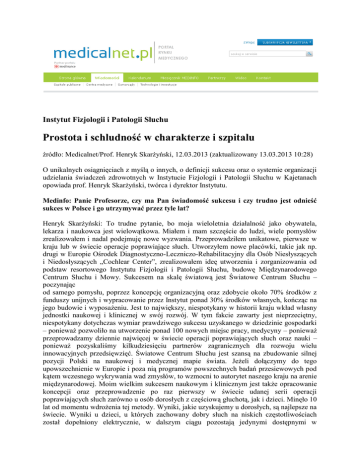 Instytut Fizjologii i Patologii Słuchu Prostota i schludność w charakterze i szpitalu źródło: Medicalnet/Prof. Henryk Skarżyński, 12.03.2013 (zaktualizowany 13.03.2013 10:28) O unikalnych osiągnięciach z myślą o innych, o definicji sukcesu oraz o systemie organizacji udzielania świadczeń zdrowotnych w Instytucie Fizjologii i Patologii Słuchu w Kajetanach opowiada prof. Henryk Skarżyński, twórca i dyrektor Instytutu. Medinfo: Panie Profesorze, czy ma Pan świadomość sukcesu i czy trudno jest odnieść sukces w Polsce i go utrzymywać przez tyle lat? Henryk Skarżyński: To trudne pytanie, bo moja wieloletnia działalność jako obywatela, lekarza i naukowca jest wielowątkowa. Miałem i mam szczęście do ludzi, wiele pomysłów zrealizowałem i nadal podejmuję nowe wyzwania. Przeprowadziłem unikatowe, pierwsze w kraju lub w świecie operacje poprawiające słuch. Utworzyłem nowe placówki, takie jak np. drugi w Europie Ośrodek Diagnostyczno-Leczniczo-Rehabilitacyjny dla Osób Niesłyszących i Niedosłyszących „Cochlear Center”, zrealizowałem ideę utworzenia i zorganizowania od podstaw resortowego Instytutu Fizjologii i Patologii Słuchu, budowę Międzynarodowego Centrum Słuchu i Mowy. Sukcesem na skalę światową jest Światowe Centrum Słuchu – poczynając od samego pomysłu, poprzez koncepcję organizacyjną oraz zdobycie około 70% środków z funduszy unijnych i wypracowanie przez Instytut ponad 30% środków własnych, kończąc na jego budowie i wyposażeniu. Jest to największy, niespotykany w historii kraju wkład własny jednostki naukowej i klinicznej w swój rozwój. W tym fakcie zawarty jest nieprzeciętny, niespotykany dotychczas wymiar prawdziwego sukcesu uzyskanego w dziedzinie gospodarki – ponieważ pozwoliło na utworzenie ponad 100 nowych miejsc pracy, medycyny – ponieważ przeprowadzamy dziennie najwięcej w świecie operacji poprawiających słuch oraz nauki – ponieważ pozyskaliśmy kilkudziesięciu partnerów zagranicznych dla rozwoju wielu innowacyjnych przedsięwzięć. Światowe Centrum Słuchu jest szansą na zbudowanie silnej pozycji Polski na naukowej i medycznej mapie świata. Jeżeli dołączymy do tego upowszechnienie w Europie i poza nią programów powszechnych badań przesiewowych pod kątem wczesnego wykrywania wad zmysłów, to wzmocni to autorytet naszego kraju na arenie międzynarodowej. Moim wielkim sukcesem naukowym i klinicznym jest także opracowanie koncepcji oraz przeprowadzenie po raz pierwszy w świecie udanej serii operacji poprawiających słuch zarówno u osób dorosłych z częściową głuchotą, jak i dzieci. Minęło 10 lat od momentu wdrożenia tej metody. Wyniki, jakie uzyskujemy u dorosłych, są najlepsze na świecie. Wyniki u dzieci, u których zachowany dobry słuch na niskich częstotliwościach został dopełniony elektrycznie, w dalszym ciągu pozostają jedynymi dostępnymi w literaturze. To jest największa w świecie Grupa ponad 1500 zoperowanych pacjentów. Miniony rok był także bardzo udany pod względem osiągnięć klinicznych. Przede wszystkim przeprowadziliśmy w Polsce kolejne pionierskie operacje: wszczepienie systemu CODACS – najnowszego implantu ucha środkowego i wewnętrznego oraz implantu słuchowego typu BONEBRIDGE. Spektakularnym sukcesem, będącym efektem wspólnego międzynarodowego przedsięwzięcia, jest również pierwsze w świecie obustronne wszczepienie implantów do pnia mózgu. Dziś w Światowym Centrum Słuchu możemy dać szansę prawie każdemu, kto ma wadę słuchu. Postęp w tej dziedzinie medycy jest niewiarygodnie szybki i – co powtórzę z pełnym naciskiem – potrafimy pomóc niemal każdemu z różnego typu częściowym lub całkowitym ubytkiem słuchu. O wielkości tych przedsięwzięć niech jednak świadczą nie słowa, ale liczne nagrody: Prezydenta, Premiera, Ministrów Zdrowia, Nauki, Spraw Zagranicznych, Rozwoju Regionalnego, Prezydium PAN, wielu uczelni, towarzystw naukowych, organizacji biznesowych, gospodarczych, pozarządowych i korporacji lekarskich. Jak to osiągnąć? Trzeba dobrze zidentyfikować potrzebę i problem i wierzyć w to, co się robi. Tylko determinacja i ciężka praca gwarantują sukces. Ja kocham pracę – dlatego jest ona dla mnie przyjemnością. Krótka odpowiedź jest jak błysk fotograficznego flesza, ale za nią kryje się wielka praca organiczna w wielu wymiarach, wykonywana w różnych, czasem sprzyjających a czasem niesprzyjających, warunkach. Podkreślam to znaczenie pracy, by uświadomić, że nie jest to cud, że nie powstało to samo, że dalej też nie będzie funkcjonowało bez bardzo przemyślanego planu. Dopiero ocena tych dokonań z perspektywy 5, 10 a lepiej 15 lat powinna pokazać zarówno ich wartość, jak i znaczenie dla rozwoju nauki i medycyny w kraju i na arenie międzynarodowej. Medinfo: Co może Pan powiedzieć o wysokości wyceny procedur laryngologicznych w Polsce? HS: W dalszym ciągu zbyt wiele procedur, zwłaszcza chirurgicznych, w różnych specjalnościach nie uwzględnia poziomu kosztów. Odnosi się to zwłaszcza do zabiegów kompleksowych wykonywanych w klinikach uniwersyteckich i instytutach naukowych. Podobnie wygląda to w lecznictwie otwartym, gdzie pacjent z drugiego końca Polski nie może odjechać bez kompletu badań bez względu na to, jak jest wyceniona porada. Utrzymanie specjalistycznego zespołu i bardzo drogiej aparatury kosztuje. Zwłaszcza jeżeli chce się oferować światowy poziom usług medycznych. Medinfo: Co jest najważniejsze w leczeniu laryngologicznym i czy da się wszystkie cele realizować w Polsce? HS: Jeżeli pacjent zgłasza się z chorobą, to najważniejsze jest jej wyleczenie. W naszej strefie geograficznej problemem zawsze będą schorzenia górnych dróg oddechowych: nosa i zatok obocznych, gardła i krtani. U części chorych następstwem tych dolegliwości są schorzenia uszu. Prawie jedna piąta dzieci w wieku wczesnoszkolnym ma w