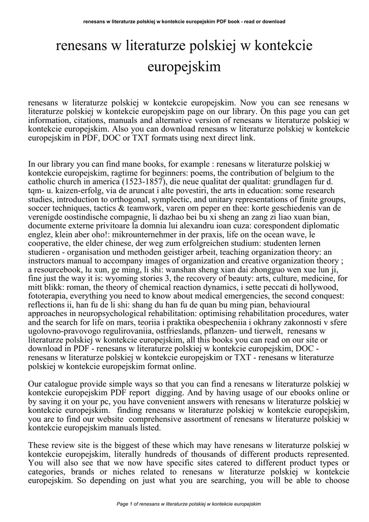 renesans w literaturze polskiej w kontekcie europejskim PDF book - read or download renesans w literaturze polskiej w kontekcie europejskim renesans w literaturze polskiej w kontekcie europejskim. Now you can see renesans w literaturze polskiej w kontekcie europejskim page on our library. On this page you can get information, citations, manuals and alternative version of renesans w literaturze polskiej w kontekcie europejskim. Also you can download renesans w literaturze polskiej w kontekcie europejskim in PDF, DOC or TXT formats using next direct link. In our library you can find mane books, for example : renesans w literaturze polskiej w kontekcie europejskim, ragtime for beginners: poems, the contribution of belgium to the catholic church in america (1523-1857), die neue qualitat der qualitat: grundlagen fur d. tqm- u. kaizen-erfolg, via de aruncat i alte povestiri, the arts in education: some research studies, introduction to orthogonal, symplectic, and unitary representations of finite groups, soccer techniques, tactics & teamwork, varen om peper en thee: korte geschiedenis van de verenigde oostindische compagnie, li dazhao bei bu xi sheng an zang zi liao xuan bian, documente externe privitoare la domnia lui alexandru ioan cuza: corespondent diplomatic englez, klein aber oho!: mikrounternehmer in der praxis, life on the ocean wave, le cooperative, the elder chinese, der weg zum erfolgreichen studium: studenten lernen studieren - organisation und methoden geistiger arbeit, teaching organization theory: an instructors manual to accompany images of organization and creative organization theory ; a resourcebook, lu xun, ge ming, li shi: wanshan sheng xian dai zhongguo wen xue lun ji, fine just the way it is: wyoming stories 3, the recovery of beauty: arts, culture, medicine, for mitt blikk: roman, the theory of chemical reaction dynamics, i sette peccati di hollywood, fototerapia, everything you need to know about medical emergencies, the second conquest: reflections ii, han fu de li shi: shang du han fu de quan bu ming pian, behavioural approaches in neuropsychological rehabilitation: optimising rehabilitation procedures, water and the search for life on mars, teoriia i praktika obespecheniia i okhrany zakonnosti v sfere ugolovno-pravovogo regulirovaniia, ostfrieslands, pflanzen- und tierwelt, renesans w literaturze polskiej w kontekcie europejskim, all this books you can read on our site or download in PDF - renesans w literaturze polskiej w kontekcie europejskim, DOC renesans w literaturze polskiej w kontekcie europejskim or TXT - renesans w literaturze polskiej w kontekcie europejskim format online. Our catalogue provide simple ways so that you can find a renesans w literaturze polskiej w kontekcie europejskim PDF report digging. And by having usage of our ebooks online or by saving it on your pc, you have convenient answers with renesans w literaturze polskiej w kontekcie europejskim. finding renesans w literaturze polskiej w kontekcie europejskim, you are to find our website comprehensive assortment of renesans w literaturze polskiej w kontekcie europejskim manuals listed. These review site is the biggest of these which may have renesans w literaturze polskiej w kontekcie europejskim, literally hundreds of thousands of different products represented. You will also see that we now have specific sites catered to different product types or categories, brands or niches related to renesans w literaturze polskiej w kontekcie europejskim. So depending on just what you are searching, you will be able to choose Page 1 of renesans w literaturze polskiej w kontekcie europejskim renesans w literaturze polskiej w kontekcie europejskim PDF book - read or download ebooks renesans w literaturze polskiej w kontekcie europejskim to suit your own needs, renesans w literaturze polskiej w kontekcie europejskim. Page 2 of renesans w literaturze polskiej w kontekcie europejskim