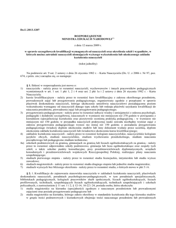 Dz.U.2013.1207 ROZPORZĄDZENIE MINISTRA EDUKACJI NARODOWEJ(1) z dnia 12 marca 2009 r. w sprawie szczegółowych kwalifikacji wymaganych od nauczycieli oraz określenia szkół i wypadków, w których można zatrudnić nauczycieli niemających wyższego wykształcenia lub ukończonego zakładu kształcenia nauczycieli (tekst jednolity) Na podstawie art. 9 ust. 2 ustawy z dnia 26 stycznia 1982 r. - Karta Nauczyciela (Dz. U. z 2006 r. Nr 97, poz. 674, z późn. zm.) zarządza się, co następuje: § 1. Ilekroć w rozporządzeniu jest mowa o: nauczycielu - należy przez to rozumieć nauczycieli, wychowawców i innych pracowników pedagogicznych wymienionych w art. 1 ust. 1 pkt 1, 2 i 4 oraz ust. 2 pkt 1a i 2 ustawy z dnia 26 stycznia 1982 r. - Karta Nauczyciela; 2) kursie kwalifikacyjnym - należy przez to rozumieć kurs kwalifikacyjny z zakresu określonego przedmiotu, prowadzonych zajęć lub przygotowania pedagogicznego, organizowany zgodnie z przepisami w sprawie placówek doskonalenia nauczycieli, którego ukończenie umożliwia nauczycielowi posiadającemu poziom wykształcenia wymagany od nauczycieli danego typu szkoły lub rodzaju placówki uzyskanie kwalifikacji do nauczania przedmiotu, prowadzenia zajęć lub przygotowania pedagogicznego; 3) przygotowaniu pedagogicznym - należy przez to rozumieć nabycie wiedzy i umiejętności z zakresu psychologii, pedagogiki i dydaktyki szczegółowej, nauczanych w wymiarze nie mniejszym niż 270 godzin w powiązaniu z kierunkiem (specjalnością) kształcenia oraz pozytywnie ocenioną praktyką pedagogiczną - w wymiarze nie mniejszym niż 150 godzin; w przypadku nauczycieli praktycznej nauki zawodu niezbędny wymiar zajęć z zakresu przygotowania pedagogicznego wynosi nie mniej niż 150 godzin; o posiadaniu przygotowania pedagogicznego świadczy dyplom ukończenia studiów lub inny dokument wydany przez uczelnię, dyplom ukończenia zakładu kształcenia nauczycieli lub świadectwo ukończenia kursu kwalifikacyjnego; 4) zakładzie kształcenia nauczycieli - należy przez to rozumieć kolegium nauczycielskie, nauczycielskie kolegium języków obcych, studium nauczycielskie, studium wychowania przedszkolnego, studium nauczania początkowego lub pedagogiczne studium techniczne; 4a) szkołach podstawowych za granicą, gimnazjach za granicą lub liceach ogólnokształcących za granicą - należy przez to rozumieć odpowiednio szkoły podstawowe, gimnazja lub licea ogólnokształcące oraz zespoły tych szkół, a także szkolne punkty konsultacyjne, przy przedstawicielstwach dyplomatycznych, urzędach konsularnych i przedstawicielstwach wojskowych Rzeczypospolitej Polskiej, realizujące plany nauczania uzupełniającego; 5) studiach pierwszego stopnia - należy przez to rozumieć studia licencjackie, inżynierskie lub studia wyższe zawodowe; 6) studiach magisterskich - należy przez to rozumieć studia drugiego stopnia lub jednolite studia magisterskie; 7) studiach wyższych bez bliższego określenia - należy przez to rozumieć studia, o których mowa w pkt 5 i 6. 1) § 2. 1. Kwalifikacje do zajmowania stanowiska nauczyciela w zakładach kształcenia nauczycieli, placówkach doskonalenia nauczycieli, poradniach psychologiczno-pedagogicznych, w tym poradniach specjalistycznych, bibliotekach pedagogicznych, kolegiach pracowników służb społecznych, liceach ogólnokształcących, liceach profilowanych, technikach, uzupełniających liceach ogólnokształcących, technikach uzupełniających i szkołach policealnych, z zastrzeżeniem § 11 ust. 1 i 2, § 12-14, 16-22 i 24, posiada osoba, która ukończyła: 1) studia magisterskie na kierunku (specjalności) zgodnym z nauczanym przedmiotem lub prowadzonymi zajęciami oraz posiada przygotowanie pedagogiczne lub 2) studia magisterskie na kierunku, którego zakres określony w standardzie kształcenia dla tego kierunku studiów w grupie treści podstawowych i kierunkowych obejmuje treści nauczanego przedmiotu lub prowadzonych zajęć, oraz posiada przygotowanie pedagogiczne, lub studia magisterskie na kierunku (specjalności) innym niż wymieniony w pkt 1 i 2 i studia podyplomowe w zakresie nauczanego przedmiotu lub prowadzonych zajęć oraz posiada przygotowanie pedagogiczne. 2. Kwalifikacje do zajmowania stanowiska nauczyciela teoretycznych przedmiotów zawodowych w szkołach, o których mowa w ust. 1, posiada również osoba, która ukończyła: 1) studia pierwszego stopnia na kierunku (specjalności) zgodnym z nauczanym przedmiotem oraz posiada przygotowanie pedagogiczne lub 2) studia pierwszego stopnia na kierunku, którego zakres określony w standardzie kształcenia dla tego kierunku studiów w grupie treści podstawowych i kierunkowych obejmuje treści nauczanego przedmiotu, oraz posiada przygotowanie pedagogiczne. 3) § 3. Kwalifikacje do zajmowania stanowiska nauczyciela w gimnazjach i zasadniczych szkołach zawodowych, z zastrzeżeniem § 11 ust. 1 i 2, § 12-14, 16-22 i 24, posiada osoba, która: 1) ma kwalifikacje określone w § 2 lub 2) ukończyła: a) studia pierwszego stopnia na kierunku (specjalności) zgodnym z nauczanym przedmiotem lub prowadzonymi zajęciami oraz posiada przygotowanie pedagogiczne lub b) studia pierwszego stopnia na kierunku, którego zakres określony w standardzie kształcenia dla tego kierunku studiów w grupie treści podstawowych i kierunkowych obejmuje treści nauczanego przedmiotu lub prowadzonych zajęć, oraz posiada przygotowanie pedagogiczne, lub c) studia wyższe na kierunku (specjalności) innym niż wymieniony w lit. a i b, a ponadto ukończyła studia podyplomowe lub kurs kwalifikacyjny w zakresie nauczanego przedmiotu lub prowadzonych zajęć, oraz posiada przygotowanie pedagogiczne. § 3a. 1. Kwalifikacje do nauczania przedmiotów uzupełniających w szkołach ponadgimnazjalnych i gimnazjach posiada osoba, która ma kwalifikacje określone odpowiednio w § 2 i § 3. 2. Kwalifikacje do nauczania przyrody jako przedmiotu uzupełniającego w szk