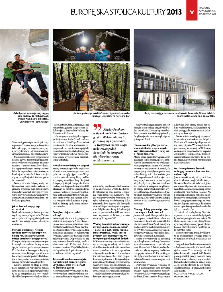 europejska stolica kultury 2013 Artystyczne instalacje przyciągają całe rodziny do nietypowych miejsc. Na zdjęciu: biblioteka Uniwersytetu Technicznego Staramy się postrzegać miasto jak żywy organizm. Transformacja jest możliwa tylko wtedy, gdy na wszystko patrzymy z góry, systemowo. Gdy zauważamy i zaczynamy rozumieć całe mechanizmy. Stosunkowo łatwo jest zorganizować kolejną edycję festiwalu lub jednorazowe wydarzenie kulturalne. Znacznie trudniej – zmienić mentalność ludzi. Do tego potrzebna jest strategia na wiele lat. Dlatego w biurze festiwalowym bardziej niż na detalach koncentrujemy się na ogólnej wizji. Zmianę pokaże przyszłość. Nasz projekt nie dotyczy wyłącznie Koszyc, lecz także okolic. Władze regionalne organizują m.in. projekt „Terra incognita”, w ramach którego przygotowano trasy zwiedzania związane z produkcją wina, wytapianiem żelaza i zabytkami gotyckimi. Jak na festiwal reagują jego uczestnicy? Bardzo dobre recenzje zbieramy od naszych zagranicznych partnerów. Zwłaszcza od tych, którzy przyjeżdżają do nas często i zauważają zmianę, jaka się tu dokonała. Pierwsze skojarzenie: Koszyce – idylla na peryferiach Europy. Nie boi się Pan, że za sprawą zmian miasto utraci część swojego uroku? Koszyce nigdy nie staną się metropolią w stylu zachodnim. Proszę zauważyć, że pomimo gwałtownego rozwoju Kraków nie stracił swojego uroku, wciąż emanuje takim, którego na próżno szukać w dużych metropoliach. Podobnie jest w Koszycach – oba miasta posiadają własną, niepowtarzalną atmosferę. Koszyce jeszcze na długo pozostaną na peryferiach. Ale wkrótce pokażą swoje możliwości. Sprawimy, że będzie tu po co przyjeżdżać. Na swój sposób chcielibyśmy powtórzyć sukces Linzu „Zmianę pokaże przyszłość”, mówi dyrektor Festiwalu. I dodaje: „stawiamy na nowe media” i jego Centrum Ars Electronica, dokąd przyjeżdżają goście z całego świata. Podobnie jest z Festiwalem Kultury Żydowskiej w Krakowie. Nie wszyscy rozumieją, dlaczego organizujemy np. festiwal sztuki elektronicznej Sound City Days. Mam jednak przekonanie, że takie wydarzenia pomagają całemu miastu, wzmagają także zainteresowanie sztuką tradycyjną. Kiedy w Linzu powstwała Ars Electronica, lokalni artyści również narzekali: to nie jest sztuka! " Między Polakami a Słowakami nie ma bariery języka. Wykorzystujmy to, poznawajmy się nawzajem! W Koszycach można usiąść na ławce, zagadać do sąsiada i w ten sposób nie tylko obserwować ludzi z zewnątrz. Nowa kultura rodzi się w napięciu? Mamy tu instytucje i ludzi myślących o kulturze w sposób tradycyjny – oraz tych, którzy spoglądają na „nowe”. Przypomina to trochę czasy, kiedy do Polski przywędrował jazz. Przy okazji tak dużego projektu jak Europejska Stolica Kultury międzypokoleniowy konflikt siłą rzeczy się zaostrza. Sprzyjają temu warunki: jest więcej pieniędzy, publiczność jest bardziej zainteresowana. Procesy, które zwykle nie są silne, nabierają rozpędu. Jednak różnice w poglądach na kulturę są dla mnie całkowicie naturalne. Co najbardziej niszczy dziś kulturę? Konsumpcjonizm, w którego apogeum właśnie się znajdujemy. A także komercja. Ale nawet ona nie jest w stanie zniszczyć kultury całkowicie. Nasza cywilizacja istnieje od tysięcy lat i jak dotąd nic nie zdołało zniszczyć jej kulturowego wymiaru. Człowiek od zawsze szukał, zadawał pytania. Odpowiadał na nie przy pomocy filozofii, religii, nauki – lub właśnie sztuki. Kultura jest zakodowana w człowieku. Dopóki będzie istnieć cywilizacja, dopóty istnieć będzie też kultura, także ta „wysoka”. Tożsamość środkowoeuropejską ma wiele miast naszego regionu. Czy Koszyce mają swój pomysł na Środkową Europę? Koszyce zawsze były miastem środkowoeuropejskim. Przed laty byliśmy częścią monarchii austro-węgierskiej. Zimą mieszkańcy miasta wyjeżdżali na wczasy do chorwackiej Opatii. Kiedyś było naturalne, że choć żyjemy w regionie wielu narodowości, języków i religii, tworzymy wspólną przestrzeń, nie tylko polityczną, ale i kulturalną. Taka mieszanka była typowa dla dawnych Austro-Węgier – weźmy np. kompozytora Bélę Bartóka, który źródeł swojej muzyki poszukiwał w folklorze z terenów całej monarchii. W Koszycach staramy się do tego wrócić. W całej Europie Środkowej zmagamy się z „pamięcią nieobecności” – pamięcią o tych, którzy już z nami nie mieszkają. W jaki sposób program Europejskiej Stolicy Kultury pamięta o koszyckich Żydach? W Koszycach mamy trzy budynki dawnych synagog. W jednej z nich działa dziś filharmonia. W drugiej mieścił się uniwersytet ekonomiczny, a poprzednio – żydowska szkoła. W centrum miasta jest dzielnica żydowska. Niestety, społeczność żydowska w Koszycach jest niewielka. Żydzi, którzy przeżyli wojnę, wyemigrowali do Izraela i Ameryki. Ci, którzy pozostali, w dużej mierze utracili swoją tożsamość w czasach komunizmu – możliwość kultywowania tradycji była w tym czasie ograniczona. V Tygodnik powszechny 25 23 czerwca 2013 Koszyce czekają jeszcze m.in. na otwarcie Kunsthalle (Domu Sztuki), które zaplanowano na 3 lipca 2013 r. Kiedy jednak organizujemy koncert muzyki klezmerskiej, przychodzi bardzo dużo ludzi. Słowacy są coraz bardziej zainteresowani kulturą żydowską. Dzięki niej wielu z nas nauczyło się czegoś o przeszłości. Nieobecnymi w głównym nurcie słowackiej kultury są – z innych oczywiście powodów i w innej skali – także Romowie. Mamy sporo projektów wpierających integrację. W programie „spotów kulturalnych” orientujemy się na sztukę społeczną, na peryferia miasta. Nie koncentrujemy się wyłącznie na Romach, ale przyznajemy pieniądze organizacjom, które działają w ich środowisku. Jest w Koszycach romska telewizja i inne instytucje, które same prowadzą projekty. Myśl