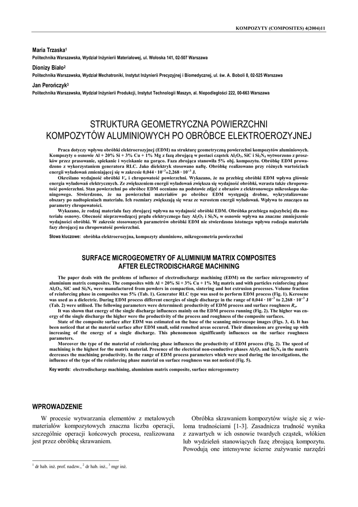 KOMPOZYTY (COMPOSITES) 4(2004)11 Maria Trzaska1 Politechnika Warszawska, Wydział Inżynierii Materiałowej, ul. Wołoska 141, 02-507 Warszawa Dionizy Biało2 Politechnika Warszawska, Wydział Mechatroniki, Instytut Inżynierii Precyzyjnej i Biomedycznej, ul. św. A. Boboli 8, 02-525 Warszawa Jan Perończyk3 Politechnika Warszawska, Wydział Inżynierii Produkcji, Instytut Technologii Maszyn, al. Niepodległości 222, 00-663 Warszawa STRUKTURA GEOMETRYCZNA POWIERZCHNI KOMPOZYTÓW ALUMINIOWYCH PO OBRÓBCE ELEKTROEROZYJNEJ Praca dotyczy wpływu obróbki elektroerozyjnej (EDM) na strukturę geometryczną powierzchni kompozytów aluminiowych. Kompozyty o osnowie Al + 20% Si + 3% Cu + 1% Mg z fazą zbrojącą w postaci cząstek Al2O3, SiC i Si3N4 wytworzono z proszków przez prasowanie, spiekanie i wyciskanie na gorąco. Faza zbrojąca stanowiła 5% obj. kompozytu. Obróbkę EDM prowadzono z wykorzystaniem generatora RLC. Jako dielektryk stosowano naftę. Obróbkę realizowano przy różnych wartościach energii wyładowań zmieniającej się w zakresie 0,044 · 10−3÷2,268 · 10−3 J. Określano wydajność obróbki Vw i chropowatość powierzchni. Wykazano, że na przebieg obróbki EDM wpływa głównie energia wyładowań elektrycznych. Ze zwiększeniem energii wyładowań zwiększa się wydajność obróbki, wzrasta także chropowatość powierzchni. Stan powierzchni po obróbce EDM oceniano na podstawie zdjęć z obrazów z elektronowego mikroskopu skaningowego. Stwierdzono, że na powierzchni materiałów po obróbce EDM występują drobne, wykrystalizowane obszary po nadtopieniach materiału. Ich rozmiary zwiększają się wraz ze wzrostem energii wyładowań. Wpływa to znacząco na parametry chropowatości. Wykazano, że rodzaj materiału fazy zbrojącej wpływa na wydajność obróbki EDM. Obróbka przebiega najszybciej dla materiału osnowy. Obecność nieprzewodzącej prądu elektrycznego fazy Al2O3 i Si3N4 w osnowie wpływa na znaczne zmniejszenie wydajności obróbki. W zakresie stosowanych parametrów obróbki EDM nie stwierdzono istotnego wpływu rodzaju materiału fazy zbrojącej na chropowatość powierzchni. Słowa kluczowe: obróbka elektroerozyjna, kompozyty aluminiowe, mikrogeometria powierzchni SURFACE MICROGEOMETRY OF ALUMINIUM MATRIX COMPOSITES AFTER ELECTRODISCHARGE MACHINING The paper deals with the problems of influence of electrodischarge machining (EDM) on the surface microgeometry of aluminium matrix composites. The composites with Al + 20% Si + 3% Cu + 1% Mg matrix and with particles reinforcing phase Al2O3, SiC and Si3N4 were manufactured from powders in compaction, sintering and hot extrusion processes. Volume fraction of reinforcing phase in composites was 5% (Tab. 1). Generator RLC type was used to perform EDM process (Fig. 1). Kerosene was used as a dielectric. During EDM process different energies of single discharge in the range of 0,044 · 10−3 to 2,268 · 10−3 J (Tab. 2) were utilised. The following parameters were determined: productivity of EDM process and surface roughness Ra. It was shown that energy of the single discharge influences mainly on the EDM process running (Fig. 2). The higher was energy of the single discharge the higher were the productivity of the process and roughness of the composite surfaces. State of the composite surface after EDM was estimated on the base of the scanning microscope images (Figs. 3, 4). It has been noticed that at the material surface after EDM small, solid remelted areas occured. Their dimensions are growing up with increasing of the energy of a single discharge. This phenomenon signifficantly influences on the surface roughness parameters. Moreover the type of the material of reinforcing phase influences the productivity of EDM process (Fig. 2). The speed of machining is the highest for the matrix material. Presence of the electrical non-conductive phases Al2O3 and Si3N4 in the matrix deereases the machining productivity. In the range of EDM process parameters which were used during the investigations, the influence of the type of the reinforcing phase material on surface roughness was not noticed (Fig. 5). Key words: electrodischarge machining, aluminium matrix composite, surface microgeometry WPROWADZENIE W procesie wytwarzania elementów z metalowych materiałów kompozytowych znaczna liczba operacji, szczególnie operacji końcowych procesu, realizowana jest przez obróbkę skrawaniem. 1 dr hab. inż. prof. nadzw., 2 dr hab. inż., 3 mgr inż. Obróbka skrawaniem kompozytów wiąże się z wieloma trudnościami [1-3]. Zasadnicza trudność wynika z zawartych w ich osnowie twardych cząstek, włókien lub wydzieleń stanowiących fazę zbrojącą kompozytu. Powodują one intensywne ścierne zużywanie narzędzi 279 Struktura geometryczna powierzchni kompozytów aluminiowych po obróbce elektroerozyjnej skrawających, nawet takich, które są wykonane z węglików spiekanych czy ze specjalnych gatunków ceramiki. Ponadto podczas obróbki skrawaniem kompozytów występują złożone zjawiska dynamiczne wskutek przechodzenia ostrza narzędzia przez granicę fazową pomiędzy osnową i cząstkami zbrojącymi, co obserwowane jest często jako powtarzające się piki sił skrawania. W efekcie tego ostrze skrawające szybciej ulega zmęczeniowemu wykruszaniu niż przy obróbce materiałów o jednorodnej budowie. W wielu ośrodkach badawczych na świecie są prowadzone prace nad alternatywnymi metodami obróbki ubytkowej kompozytów metalowych, takimi jak: laserowa, strumieniem wody, elektrochemiczna, ultradźwiękowa itd. Jedną z najbardziej obiecujących metod jest obróbka elektroerozyjna (EDM) we wszystkich jej odmianach, tj. drążenia, przecinania, szlifowania, polerowania [4-6]. Prezentowana praca dotyczy obróbki EDM wybranej grupy kompozytów aluminiowych. Badania wstępne [7, 8] wykazały przydatność obróbki EDM do kształtowania powierzchni wyrobów kompozytowych, szczególnie w przypadku wyko