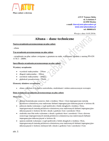 Place zabaw z drewna ATUT Tomasz Skiba ul. Leśmiana 5 62-050 Mosina e-mail: [email protected] www.atut-placezabaw.pl tel: 880081631 Wersja z dnia 14.03.2016r. Altana – dane techniczne Nazwa urządzenia przeznaczonego na plac zabaw - altana Typ urządzenia przeznaczonego na plac zabaw - urządzenie na plac zabaw związane z gruntem na stałe, wykonane zgodnie z normą PN-EN 1176-1 : 2009r. Specyfikacja urządzenia przeznaczonego na plac zabaw Wymiary urządzenia: wysokość maksymalna – 250cm długość maksymalna – 300cm szerokość maksymalna – 260cm głębokość posadowienia – 50cm Elementy składowe urządzenia: altana z dachem w kształcie sześcioboku, siedziskami i stołem umieszczonym wewnątrz Dane techniczne urządzenia przeznaczonego na plac zabaw Materiały: str. 1 drewno konstrukcyjne sosnowe, bale o średnicy 10cm i 12cm impregnowane metodą próżniowo-ciśnieniową oraz malowane farbami impregnacyjno-dekoracyjnymi w kolorze tik pokrycie dachu wykonane z rygli (połówek) z belek okrągłych o średnicy 10cm, impregnowanych metodą próżniowo-ciśnieniową oraz malowanych farbami impregnacyjnodekoracyjnymi w kolorze tik lub z desek o grubości 3cm i szerokości 10cm siedziska oraz blat stołu wykonane z desek o grubości 4cm i szerokości 15cm z drewna sosnowego impregnowanych metodą próżniowo-ciśnieniową oraz malowanych farbami impregnacyjno-dekoracyjnymi w kolorze tik oparcia siedzisk wykonane z rygli (połówek) z belek okrągłych o średnicy 10cm, impregnowanych metodą próżniowo-ciśnieniową oraz malowanych farbami impregnacyjnodekoracyjnymi w kolorze zielonym lub z desek o grubości 3cm i szerokości 15cm kotwy służące do posadowienia urządzenia w gruncie wykonane ze stali ocynkowanej ogniowo zabezpieczenia na śrubach wykonane z tworzyw sztucznych poliestrowych śruby, gwoździe oraz inne elementy metalowe wykorzystane w konstrukcji urządzenia wykonane z materiałów nierdzewnych lub ocynkowanych wszystkie elementy drewniane są w całości szlifowane w celu wyeliminowania zadr wszystkie spawy i łączenia elementów metalowych są gładkie i odpowiednio wyprofilowane Zabezpieczenia: drewno zabezpieczone przed korozją przez impregnację metodą próżniowo-ciśnieniową oraz malowanie farbami impregnacyjno-dekoracyjnymi w różnych kolorach drewno zabezpieczone przed spękaniem poprzez malowanie specjalnymi środkami na bazie olejów, minimalizującymi powstawanie pęknięć drewno zabezpieczone przed korozją postępującą od podłoża poprzez umieszczenie słupów na metalowych kotwach nad powierzchnią gruntu lub poprzez impregnację ciśnieniową w klasie 4 (w przypadku bezpośredniego fundamentowania słupów nośnych w podłożu) zgodnie z wymogami normy PN EN 1176: 2009 elementy metalowe zabezpieczone przed korozją przez ocynkowanie lub wykonanie z metali nierdzewnych gwinty śrub zabezpieczone poprzez nakrętki kołpakowe lub kapsle ochronne wykonane z tworzywa sztucznego Szczegóły dotyczące instalacji urządzenia przeznaczonego na plac zabaw Fundamentowanie: str. 2 urządzenie instalowane w gruncie na stałe, posadowione w fundamencie na głębokości 50cm górna krawędź fundamentu umieszczona 20cm poniżej poziomu gruntu urządzenie umieszczone na metalowych kotwach kotwa przytwierdzone do słupa nośnego za pomocą dwóch śrub zamkowych M10 x 120 klasa 5.8, przechodzących przez słup nośny i skręconych za pomocą nakrętek kołpakowych M10 cześć kotwy umieszczona w fundamencie wykonana ze stali ocynkowanej ogniowo o profilu 4cm x 4cm i grubości 3 mm część kotwy podtrzymująca słup wykonana ze stali ocynkowanej ogniowo o wymiarach 20cm x 6cm i grubości 4 mm ryc.1. Kotwa str. 3