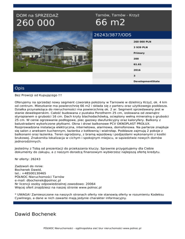 DOM na SPRZEDAŻ 260 000 Tarnów, Tarnów - Krzyż 66 m2 26243/3877/ODS 260 000 PLN 3 939 PLN Primary 200 61.61 2016 3 DevelopmentState Opis Bez Prowizji od Kupującego !!! Oferujemy na sprzedaż nowy segment czworaka położony w Tarnowie w dzielnicy Krzyż, ok. 4 km od centrum. Mieszkanie ma powierzchnię 66 m2 i składa się z parteru oraz użytkowego poddasza. Działka przynależąca do nieruchomości ma powierzchnię ok. 2 ar. Segment sprzedawany jest w stanie deweloperskim. Całość budowana z pustaka Porotherm 25 cm, izolowana od zewnątrz styropianem o grubości 16 cm. Dach kryty blachodachówką, ocieplony wełną mineralną o grubości 25 cm. W cenie ogrzewanie podłogowe, piec gazowy dwufunkcyjny oraz kaloryfery. Balkony z balustradami wykończone płytkami. Okna i drzwi balkonowe PCV OKNOPLAST PROLUX. Rozprowadzona instalacja elektryczna, internetowa, alarmowa, domofonowa. Na parterze znajduje się salon z aneksem kuchennym, łazienka z kotłownią i wiatrołap. Poddasze zajmują 2 pokoje z balkonami oraz łazienka. Teren ogrodzony, z bramą wjazdową i podjazdami wykonanymi z kostki brukowej. Znakomita lokalizacja w cichym i spokojnym miejscu, w sąsiedztwie nowych domów jednorodzinnych. Jesteśmy z Tobą od prezentacji do przekazania kluczy. Sprawnie przygotujemy dla Ciebie dokumenty do zakupu, a z naszym doradcą finansowym wybierzesz najlepszą ofertę kredytu. Nr oferty: 26243 Zadzwoń do mnie: Bochenek Dawid, tel.: +48500130465 PÓŁNOC Nieruchomości Tarnów e-mail: [email protected] Nr licencji osoby odpowiedzialnej zawodowo: 20064 Więcej ofert znajdziesz na naszej stronie www.polnoc.pl * UWAGA! Zamieszczone na naszych stronach oferty nie stanowią oferty w rozumieniu Kodeksu Cywilnego, a dane w nich zawarte mają jedynie charakter informacyjny. Dawid Bochenek PÓŁNOC Nieruchomości - ogólnopolska sieć biur nieruchomości www.polnoc.pl tel. 500-130-465 email: [email protected] PÓŁNOC Nieruchomości - ogólnopolska sieć biur nieruchomości www.polnoc.pl Powered by TCPDF (www.tcpdf.org)