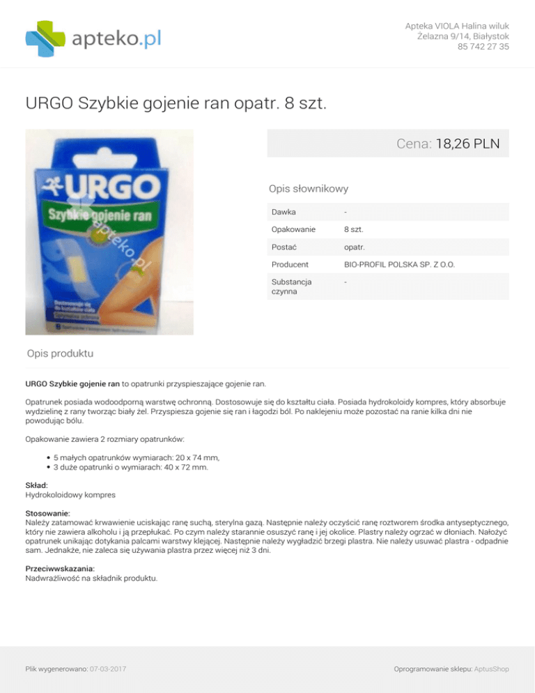 Apteka VIOLA Halina wiluk Żelazna 9/14, Białystok 85 742 27 35 URGO Szybkie gojenie ran opatr. 8 szt. Cena: 18,26 PLN Opis słownikowy Dawka - Opakowanie 8 szt. Postać opatr. Producent BIO-PROFIL POLSKA SP. Z O.O. Substancja czynna - Opis produktu URGO Szybkie gojenie ran to opatrunki przyspieszające gojenie ran. Opatrunek posiada wodoodporną warstwę ochronną. Dostosowuje się do kształtu ciała. Posiada hydrokoloidy kompres, który absorbuje wydzielinę z rany tworząc biały żel. Przyspiesza gojenie się ran i łagodzi ból. Po naklejeniu może pozostać na ranie kilka dni nie powodując bólu. Opakowanie zawiera 2 rozmiary opatrunków: 5 małych opatrunków wymiarach: 20 x 74 mm, 3 duże opatrunki o wymiarach: 40 x 72 mm. Skład: Hydrokoloidowy kompres Stosowanie: Należy zatamować krwawienie uciskając ranę suchą, sterylna gazą. Następnie należy oczyścić ranę roztworem środka antyseptycznego, który nie zawiera alkoholu i ją przepłukać. Po czym należy starannie osuszyć ranę i jej okolice. Plastry należy ogrzać w dłoniach. Nałożyć opatrunek unikając dotykania palcami warstwy klejącej. Następnie należy wygładzić brzegi plastra. Nie należy usuwać plastra - odpadnie sam. Jednakże, nie zaleca się używania plastra przez więcej niż 3 dni. Przeciwwskazania: Nadwrażliwość na składnik produktu. Plik wygenerowano: 07-03-2017 Oprogramowanie sklepu: AptusShop Apteka VIOLA Halina wiluk Żelazna 9/14, Białystok 85 742 27 35 Przed zastosowaniem produktu zapoznaj się z informacjami zamieszczonymi na opakowaniu lub ulotce. Plik wygenerowano: 07-03-2017 Powered by TCPDF (www.tcpdf.org) Oprogramowanie sklepu: AptusShop