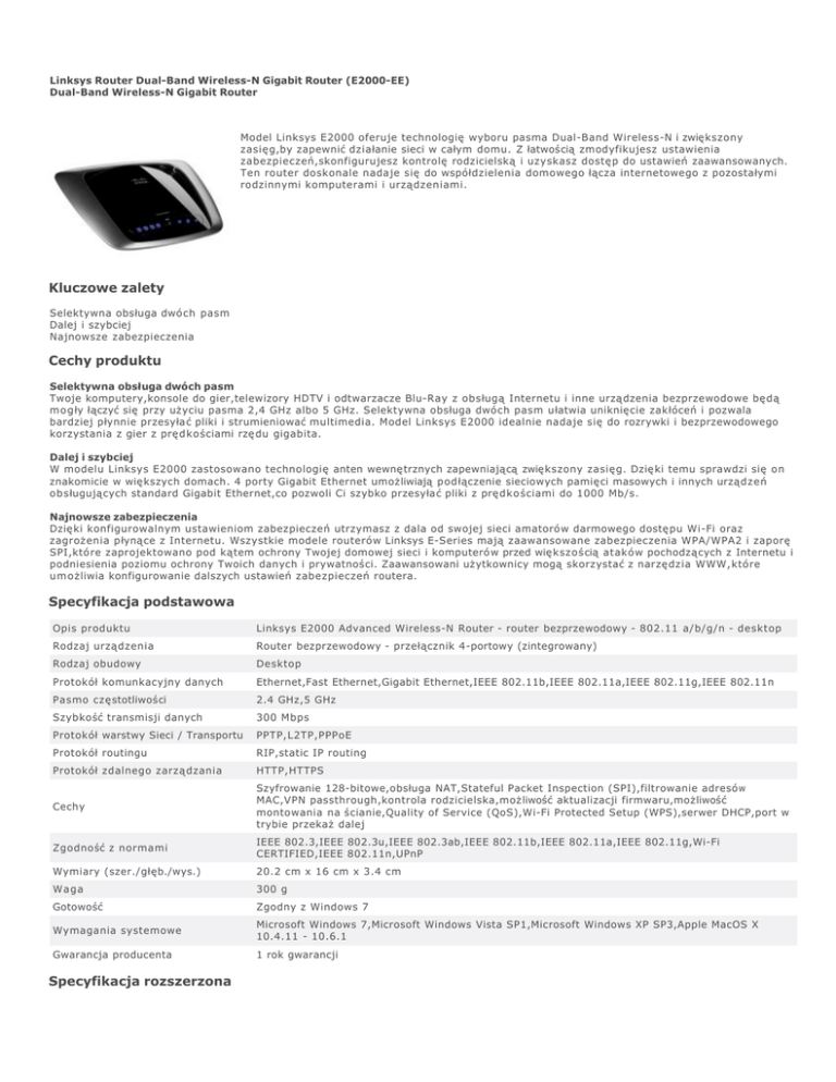 Linksys Router Dual-Band Wireless-N Gigabit Router (E2000-EE) Dual-Band Wireless-N Gigabit Router Model Linksys E2000 oferuje technologię wyboru pasma Dual-Band Wireless-N i zwię kszony zasię g,by zapewnić działanie sieci w całym domu. Z łatwością zmodyfikujesz ustawienia zabezpieczeń,skonfigurujesz kontrolę rodzicielską i uzyskasz dostę p do ustawień zaawansowanych. Ten router doskonale nadaje się do współdzielenia domowego łącza internetowego z pozostałymi rodzinnymi komputerami i urządzeniami. Kluczowe zalety Selektywna obsługa dwóch pasm Dalej i szybciej Najnowsze zabezpieczenia Cechy produktu Selektywna obsługa dwóch pasm Twoje komputery,konsole do gier,telewizory HDTV i odtwarzacze Blu-Ray z obsługą Internetu i inne urządzenia bezprzewodowe bę dą mogły łączyć się przy użyciu pasma 2,4 GHz albo 5 GHz. Selektywna obsługa dwóch pasm ułatwia uniknię cie zakłóceń i pozwala bardziej płynnie przesyłać pliki i strumieniować multimedia. Model Linksys E2000 idealnie nadaje się do rozrywki i bezprzewodowego korzystania z gier z prę dkościami rzę du gigabita. Dalej i szybciej W modelu Linksys E2000 zastosowano technologię anten wewnę trznych zapewniającą zwię kszony zasię g. Dzię ki temu sprawdzi się on znakomicie w wię kszych domach. 4 porty Gigabit Ethernet umożliwiają podłączenie sieciowych pamię ci masowych i innych urządzeń obsługują cych standard Gigabit Ethernet,co pozwoli Ci szybko przesyłać pliki z prę dkościami do 1000 Mb/s. Najnowsze zabezpieczenia Dzię ki konfigurowalnym ustawieniom zabezpieczeń utrzymasz z dala od swojej sieci amatorów darmowego dostę pu Wi-Fi oraz zagrożenia płynące z Internetu. Wszystkie modele routerów Linksys E-Series mają zaawansowane zabezpieczenia WPA/WPA2 i zaporę SPI,które zaprojektowano pod ką tem ochrony Twojej domowej sieci i komputerów przed wię kszością ataków pochodzących z Internetu i podniesienia poziomu ochrony Twoich danych i prywatności. Zaawansowani użytkownicy mogą skorzystać z narzę dzia WWW,które umożliwia konfigurowanie dalszych ustawień zabezpieczeń routera. Specyfikacja podstawowa Opis produktu Linksys E2000 Advanced Wireless-N Router - router bezprzewodowy - 802.11 a/b/g/n - desktop Rodzaj urządzenia Router bezprzewodowy - przełącznik 4-portowy (zintegrowany) Rodzaj obudowy Desktop Protokół komunkacyjny danych Ethernet,Fast Ethernet,Gigabit Ethernet,IEEE 802.11b,IEEE 802.11a,IEEE 802.11g,IEEE 802.11n Pasmo czę stotliwości 2.4 GHz,5 GHz Szybkość transmisji danych 300 Mbps Protokół warstwy Sieci / Transportu PPTP,L2TP,PPPoE Protokół routingu RIP,static IP routing Protokół zdalnego zarządzania HTTP,HTTPS Cechy Szyfrowanie 128-bitowe,obsługa NAT,Stateful Packet Inspection (SPI),filtrowanie adresów MAC,VPN passthrough,kontrola rodzicielska,możliwość aktualizacji firmwaru,możliwość montowania na ścianie,Quality of Service (QoS),Wi-Fi Protected Setup (WPS),serwer DHCP,port w trybie przekaż dalej Zgodność z normami IEEE 802.3,IEEE 802.3u,IEEE 802.3ab,IEEE 802.11b,IEEE 802.11a,IEEE 802.11g,Wi-Fi CERTIFIED,IEEE 802.11n,UPnP Wymiary (szer./głęb./wys.) 20.2 cm x 16 cm x 3.4 cm Waga 300 g Gotowość Zgodny z Windows 7 Wymagania systemowe Microsoft Windows 7,Microsoft Windows Vista SP1,Microsoft Windows XP SP3,Apple MacOS X 10.4.11 - 10.6.1 Gwarancja producenta 1 rok gwarancji Specyfikacja rozszerzona Ogólne Rodzaj urządzenia Router bezprzewodowy - przełącznik 4-portowy (zintegrowany) Rodzaj obudowy Desktop Technologia podłączania Bezprzewodowa,przewodowa Protokół komunkacyjny danych Ethernet,Fast Ethernet,Gigabit Ethernet,IEEE 802.11b,IEEE 802.11a,IEEE 802.11g,IEEE 802.11n Pasmo czę stotliwości 2.4 GHz,5 GHz Szybkość transmisji danych 300 Mbps Protokół warstwy Sieci / Transportu PPTP,L2TP,PPPoE Protokół routingu RIP,static IP routing Protokół zdalnego zarządzania HTTP,HTTPS Algorytm kodowania 128-bit WEP,64-bit WEP,40-bit WEP,WPA,WPA2 Cechy Szyfrowanie 128-bitowe,obsługa NAT,Stateful Packet Inspection (SPI),filtrowanie adresów MAC,VPN passthrough,kontrola rodzicielska,możliwość aktualizacji firmwaru,możliwość montowania na ścianie,Quality of Service (QoS),Wi-Fi Protected Setup (WPS),serwer DHCP,port w trybie przekaż dalej Zgodność z normami IEEE 802.3,IEEE 802.3u,IEEE 802.3ab,IEEE 802.11b,IEEE 802.11a,IEEE 802.11g,Wi-Fi CERTIFIED,IEEE 802.11n,UPnP W s k a źniki statusu Status portu,zasilanie Rozszerzenie / połączenie Interfejsy LAN:4 x 10Base-T/100Base-TX/1000Base-T - RJ-45 WAN:1 x RJ-45 Antena Antena Wewnę trzna zintegrowana Ilość anten 3 Zasilanie Zasilacz Zasilacz - zewnę trzna Różne Szerokość 20.2 cm Głębokość 16 cm Wysokość 3.4 cm Waga 300 g Dołączone przewody 1 x kabel sieciowy Zgodny z Windows 7 Zgodny z Windows 7 Zgodność z normami IC CS-03,FCC Oprogramowanie / Wymagania systemowe Dołączone oprogramowanie Sterowniki i programy użytkowe Wymagany system operacyjny Microsoft Windows 7,Microsoft Windows Vista SP1,Microsoft Windows XP SP3,Apple MacOS X 10.4.11 - 10.6.1 Gwarancja producenta Obsługa i wsparcie 1 rok gwarancji Szczegóły obsługi i wsparcia Gwarancja ograniczona - 1 rok Parametry środowiska Minimalna temperatura pracy 0 °C Maksymalna temperatura pracy 40 °C Dopuszczalna wilgotność 10 - 85%