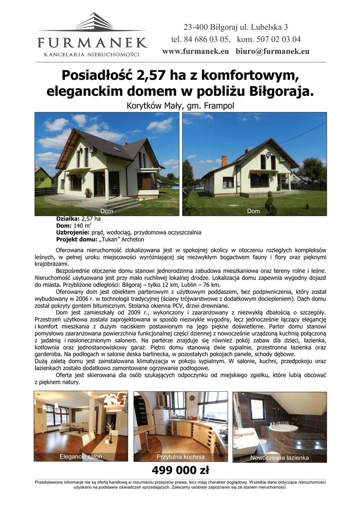 23-400 Biłgoraj ul. Lubelska 3 tel. 84 686 03 05, kom. 507 02 03 04 www.furmanek.eu [email protected] ________________________________________________________________________________________________________________________ Posiadłość 2,57 ha z komfortowym, eleganckim domem w pobliżu Biłgoraja. Korytków Mały, gm. Frampol Dom Dom Działka: 2,57 ha Dom: 140 m2 Uzbrojenie: prąd, wodociąg, przydomowa oczyszczalnia Projekt domu: „Tukan” Archeton Oferowana nieruchomość zlokalizowana jest w spokojnej okolicy w otoczeniu rozległych kompleksów leśnych, w pełnej uroku miejscowości wyróżniającej się niezwykłym bogactwem fauny i flory oraz pięknymi krajobrazami. Bezpośrednie otoczenie domu stanowi jednorodzinna zabudowa mieszkaniowa oraz tereny rolne i leśne. Nieruchomość usytuowana jest przy mało ruchliwej lokalnej drodze. Lokalizacja domu zapewnia wygodny dojazd do miasta. Przybliżone odległości: Biłgoraj – tylko 12 km, Lublin – 76 km. Oferowany dom jest obiektem parterowym z użytkowym poddaszem, bez podpiwniczenia, który został wybudowany w 2006 r. w technologii tradycyjnej (ściany trójwarstwowe z dodatkowym dociepleniem). Dach domu został pokryty gontem bitumicznym. Stolarka okienna PCV, drzwi drewniane. Dom jest zamieszkały od 2009 r., wykończony i zaaranżowany z niezwykłą dbałością o szczegóły. Przestrzeń użytkowa została zaprojektowana w sposób niezwykle wygodny, lecz jednocześnie łączący elegancję i komfort mieszkania z dużym naciskiem postawionym na jego piękne doświetlenie. Parter domu stanowi pomysłowo zaaranżowana powierzchnia funkcjonalnej części dziennej z nowocześnie urządzoną kuchnią połączoną z jadalnią i nasłonecznionym salonem. Na parterze znajduje się również pokój zabaw dla dzieci, łazienka, kotłownia oraz jednostanowiskowy garaż. Piętro domu stanowią dwie sypialnie, przestronna łazienka oraz garderoba. Na podłogach w salonie deska barlinecka, w pozostałych pokojach panele, schody dębowe. Dużą zaletą domu jest zainstalowana klimatyzacja w pokoju sypialnym. W salonie, kuchni, przedpokoju oraz łazienkach zostało dodatkowo zamontowane ogrzewanie podłogowe. Oferta jest skierowana dla osób szukających odpoczynku od miejskiego zgiełku, które lubią obcować z pięknem natury. Elegancki salon Przytulna kuchnia Nowoczesna łazienka 499 000 zł ________________________________________________________________________________________________________________________________________________________________________________________________________________________________________________ Przedstawione informacje nie są ofertą handlową w rozumieniu przepisów prawa, lecz mają charakter poglądowy. Wszelkie dane dotyczące nieruchomości uzyskano na podstawie oświadczeń sprzedających. Zalecamy osobiste zapoznanie się ze stanem nieruchomości.