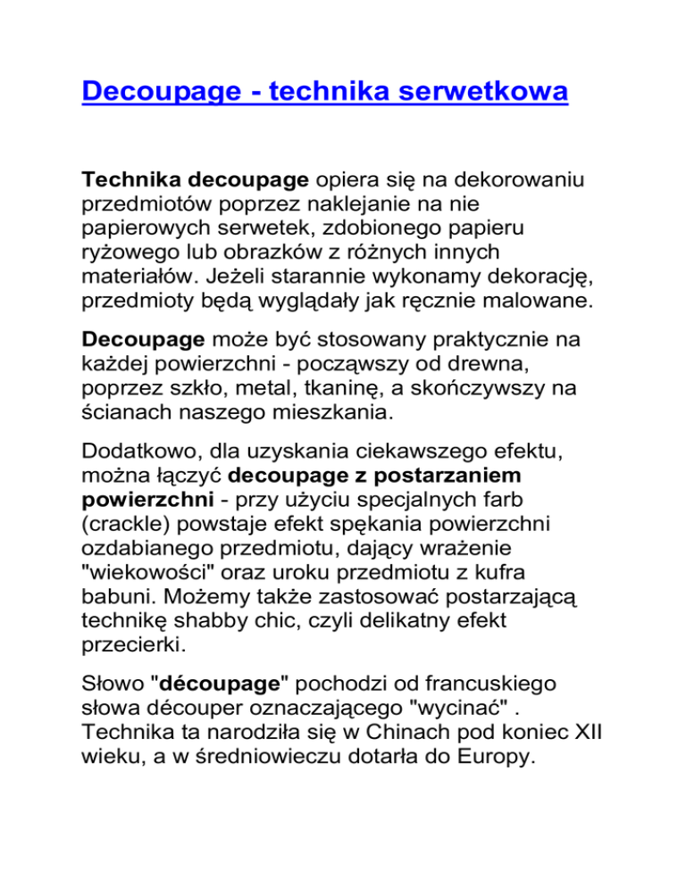 Decoupage - technika serwetkowa Technika decoupage opiera się na dekorowaniu przedmiotów poprzez naklejanie na nie papierowych serwetek, zdobionego papieru ryŜowego lub obrazków z róŜnych innych materiałów. JeŜeli starannie wykonamy dekorację, przedmioty będą wyglądały jak ręcznie malowane. Decoupage moŜe być stosowany praktycznie na kaŜdej powierzchni - począwszy od drewna, poprzez szkło, metal, tkaninę, a skończywszy na ścianach naszego mieszkania. Dodatkowo, dla uzyskania ciekawszego efektu, moŜna łączyć decoupage z postarzaniem powierzchni - przy uŜyciu specjalnych farb (crackle) powstaje efekt spękania powierzchni ozdabianego przedmiotu, dający wraŜenie "wiekowości" oraz uroku przedmiotu z kufra babuni. MoŜemy takŜe zastosować postarzającą technikę shabby chic, czyli delikatny efekt przecierki. Słowo "découpage" pochodzi od francuskiego słowa découper oznaczającego "wycinać" . Technika ta narodziła się w Chinach pod koniec XII wieku, a w średniowieczu dotarła do Europy.
