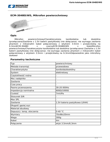 Karta katalogowa ECM-304BD/WS ECM-304BD/WS, Mikrofon powierzchniowy Opis Mikrofon powierzchniowyCharakterystyka kardioidalna lub dookólna (przełączana)Zasilanie z 1.5V baterii pastylkowej (nie dołączana); nie wymaga zasilania phantom z miksera4m kabel połączeniowy z wtykiem 3.5mm i przejściówką na 6.3mmECM-304BD = czarnyECM-304BD/WS = białyMikrofon powierzchniowyCharakterystyka kardioidalna lub dookólna (przełączana) Zasilanie z 1.5V baterii pastylkowej (nie dołączana); nie wymaga zasilania phantom z miksera4m kabel połączeniowy z wtykiem 3.5mm i przejściówką na 6.3mmOdpowiednie jako mikrofony stołowe! Parametry techniczne Typ powierzchniowy Metoda transmisji przewodowa Charakterystyka kardioida/dookólny System elektretowy Częstotliwość nośna - Moc nadajnika - Zasilanie - Czas pracy - Pasmo przenoszenia 30-20 000Hz Impedancja nominalna 600Ω/1000Ω Czułość 7mV/Pa Stosunek S/N - Max SPL - Zasilanie 1.5V bateria pastylkowa (LR44) Długość gęsiej szyi Materiał obudowy - Dopuszcz. temp. otoczenia 0-40 °C Wymiary 70x96x20mm Waga 300g Kabel 4m Połączenie wtyk 3.5mm/6.3mm 1/1 Powered by TCPDF (www.tcpdf.org)