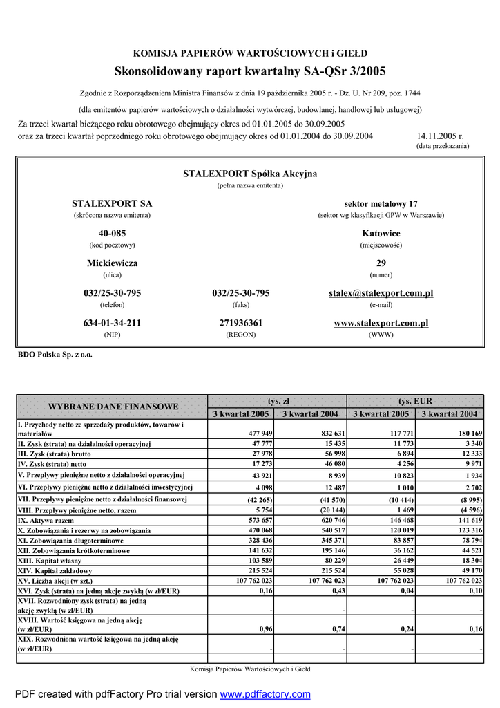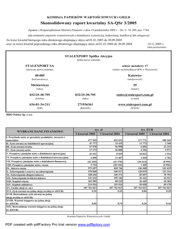 KOMISJA PAPIERÓW WARTOŚCIOWYCH i GIEŁD Skonsolidowany raport kwartalny SA-QSr 3/2005 Zgodnie z Rozporządzeniem Ministra Finansów z dnia 19 pażdziernika 2005 r. - Dz. U. Nr 209, poz. 1744 (dla emitentów papierów wartościowych o działalności wytwórczej, budowlanej, handlowej lub usługowej) Za trzeci kwartał bieżącego roku obrotowego obejmujący okres od 01.01.2005 do 30.09.2005 oraz za trzeci kwartał poprzedniego roku obrotowego obejmujący okres od 01.01.2004 do 30.09.2004 14.11.2005 r. (data przekazania) STALEXPORT Spółka Akcyjna (pełna nazwa emitenta) STALEXPORT SA sektor metalowy 17 (skrócona nazwa emitenta) (sektor wg klasyfikacji GPW w Warszawie) 40-085 Katowice (kod pocztowy) (miejscowość) Mickiewicza 29 (ulica) (numer) 032/25-30-795 032/25-30-795 [email protected] (telefon) (faks) (e-mail) 634-01-34-211 271936361 www.stalexport.com.pl (NIP) (REGON) (WWW) BDO Polska Sp. z o.o. tys. zł 3 kwartał 2005 3 kwartał 2004 WYBRANE DANE FINANSOWE I. Przychody netto ze sprzedaży produktów, towarów i materiałów II. Zysk (strata) na działalności operacyjnej III. Zysk (strata) brutto IV. Zysk (strata) netto 477 949 47 777 27 978 17 273 V. Przepływy pieniężne netto z działalności operacyjnej VI. Przepływy pieniężne netto z działalności inwestycyjnej VII. Przepływy pieniężne netto z działalności finansowej VIII. Przepływy pieniężne netto, razem IX. Aktywa razem X. Zobowiązania i rezerwy na zobowiązania XI. Zobowiązania długoterminowe XII. Zobowiązania krótkoterminowe XIII. Kapitał własny XIV. Kapitał zakładowy XV. Liczba akcji (w szt.) XVI. Zysk (strata) na jedną akcję zwykłą (w zł/EUR) XVII. Rozwodniony zysk (strata) na jedną akcję zwykłą (w zł/EUR) XVIII. Wartość księgowa na jedną akcję (w zł/EUR) XIX. Rozwodniona wartość księgowa na jedną akcję (w zł/EUR) tys. EUR 3 kwartał 2005 3 kwartał 2004 832 631 15 435 56 998 46 080 117 771 11 773 6 894 4 256 180 169 3 340 12 333 9 971 43 921 8 939 10 823 1 934 4 098 12 487 1 010 2 702 (42 265) 5 754 573 657 470 068 328 436 141 632 103 589 215 524 107 762 023 0,16 (41 570) (20 144) 620 746 540 517 345 371 195 146 80 229 215 524 107 762 023 0,43 (10 414) 1 469 146 468 120 019 83 857 36 162 26 449 55 028 107 762 023 0,04 (8 995) (4 596) 141 619 123 316 78 794 44 521 18 304 49 170 107 762 023 0,10 - - - - 0,96 0,74 0,24 0,16 - - - - Komisja Papierów Wartościowych i Giełd PDF created with pdfFactory Pro trial version www.pdffactory.com Skonsolidowany bilans Stan na 30.09.2005 AKTYWA I. Aktywa długoterminowe 1. Rzeczowy majątek trwały 2. Wartości niematerialne i prawne, w tym: - wartość firmy 3. Wartość firmy jednostek podporządkowanych 4. Należności długoterminowe 5. Inwestycje długoterminowe 5.1. Nieruchomości 5.2. Wartości niematerialne i prawne 5.3. Długoterminowe aktywa finansowe a) w jednostkach powiązanych, w tym: - udziały lub akcje w jednostkach podporządkowanych wyceniane metodą praw własności - udziały lub akcje w jednostkach zależnych i współzależnych nieobjętych konsolidacją b) w pozostałych jednostkach 5.4. Inne inwestycje długoterminowe 6. Aktywa dostępne do sprzedaży 7. Aktywa z tytułu odroczonego podatku dochodowego 8. Długoterminowe rozliczenia międzyokresowe II. Aktywa krótkoterminowe 1. Zapasy 2. Należności krótkoterminowe 3. Inwestycje krótkoterminowe 4. Środki pieniężne i ich ekwiwalenty 5. Krótkoterminowe rozliczenia międzyokresowe Aktywa razem Stan na 30.06.2005 Stan na 31.12.2004 Stan na 30.09.2004 383 132 170 143 424 1 120 68 989 62 960 6 029 3 741 403 977 170 189 471 972 89 667 83 604 6 063 3 821 388 467 157 364 495 942 89 891 83 604 6 287 4 461 351 881 146 549 485 10 430 58 565 36 658 21 907 20 141 3 436 3 466 3 642 4 078 305 355 819 16 063 2 288 132 581 2 242 132 641 1 826 130 211 1 766 130 211 9 780 10 037 9 564 5 641 95 190 525 46 402 113 714 276 27 979 2 154 573 657 199 947 54 418 122 271 271 20 584 2 403 603 924 266 291 91 712 150 582 19 22 225 1 753 654 758 268 865 61 278 159 009 11 442 34 538 2 598 620 746 PDF created with pdfFactory Pro trial version www.pdffactory.com Stan na 30.09.2005 PASYWA I. Kapitał własny I.1. Kapitał własny przypadający na akcjonariuszy Spółki 1. Kapitał zakładowy 2. Należne wpłaty na kapitał zakładowy (wielkość ujemna) 3. Akcje (udziały) własne (wielkość ujemna) 4. Kapitał zapasowy 5. Kapitał z aktualizacji wyceny 6. Pozostałe kapitały rezerwowe 7. Różnice kursowe z przeliczenia jednostek podporządkowanych a) dodatnie różnice kursowe b) ujemne różnice kursowe 8. Zysk (strata) z lat ubiegłych 9. Zysk (strata) netto przypadający na akcjonariuszy Spółki 10. Odpisy z zysku netto w ciągu roku obrotowego (wielkość ujemna) I.2. Kapitały mniejszości II. Ujemna wartość firmy jednostek podporządkowanych III. Zobowiązania długoterminowe 1. Kredyty i pożyczki 2. Zobowiązania z tytułu leasingu finansowego 3. Zobowiązania z tytułu dostaw i usług 4. Pozostałe zobowiązania 5. Rezerwa z tytułu odroczonego podatku dochodowego 6. Rezerwy na pozostałe zobowiązania 7. Długoterminowe rozliczenia międzyokresowe IV. Zobowiązania krótkoterminowe 1. Kredyty i pożyczki 2. Zobowiązania z tytułu leasingu finansowego 3. Zobowiązania z tytułu dostaw i usług 4. Pozostałe zobowiązania 5. Rezerwy na zobowiązania 6. Krótkoterminowe rozliczenia międzyokresowe Pasywa razem Wartość księgowa Liczba akcji Wartość księgowa na jedną akcję (w zł) Stan na 30.06.2005 Stan na 31.12.2004 Stan na 30.09.2004 103 589 99 072 82 057 80 229 99 970 96 178 76 795 75 098 215 524 215 524 215 524 215 524 - - - - (73) 101 640 8 699 9 632 (478) 101 640 8 699 6 148 (44) 113 153 43 382 97 446 (44) 113 121 12 411 92 430 - - - - (252 725) (252 725) (404 179) (404 424) 17 273 17 370 11 513 46 080 - - - - 3 619 2 894 5 262 5 131 - - - - 328 436 83 620 6 922 172 688 356 157 99 373 7 295 176 537 399 280 113 746 5 834 196 009 345 371 113 028 7 142 12 408 11 8