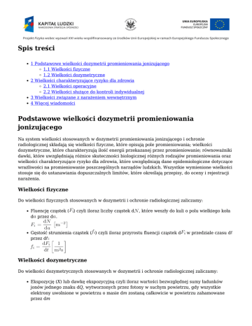 Spis treści 1 Podstawowe wielkości dozymetrii promieniowania jonizującego 1.1 Wielkości fizyczne 1.2 Wielkości dozymetryczne 2 Wielkości charakteryzujące ryzyko dla zdrowia 2.1 Wielkości operacyjne 2.2 Wielkości służące do kontroli indywidualnej 3 Wielkości związane z narażeniem wewnętrznym 4 Więcej wiadomości Podstawowe wielkości dozymetrii promieniowania jonizującego Na system wielkości stosowanych w dozymetrii promieniowania jonizującego i ochronie radiologicznej składają się wielkości fizyczne, które opisują pole promieniowania; wielkości dozymetryczne, które charakteryzują ilość energii przekazanej przez promieniowanie; równoważniki dawki, które uwzględniają różnice skuteczności biologicznej różnych rodzajów promieniowania oraz wielkości charakteryzujące ryzyko dla zdrowia, które uwzględniają dane epidemiologiczne dotyczące wrażliwości na promieniowanie poszczególnych narządów ludzkich. Wszystkie wymienione wielkości stosuje się do ustanawiania dopuszczalnych limitów, które określają przepisy, do oceny i rejestracji narażenia. Wielkości fizyczne Do wielkości fizycznych stosowanych w dozymetrii i ochronie radiologicznej zaliczamy: Fluencję cząstek ( ) czyli iloraz liczby cząstek d d przez d . , które weszły do kuli o polu wielkiego koła Gęstość strumienia cząstek ( ) czyli iloraz przyrostu fluencji cząstek d przez d : w przedziale czasu d Wielkości dozymetryczne Do wielkości dozymetrycznych stosowanych w dozymetrii i ochronie radiologicznej zaliczamy: Ekspozycję (X) lub dawkę ekspozycyjną czyli iloraz wartości bezwzględnej sumy ładunków jonów jednego znaku dQ, wytworzonych przez fotony w suchym powietrzu, gdy wszystkie elektrony uwolnione w powietrzu o masie dm zostaną całkowicie w powietrzu zahamowane przez dm Dawną jednostką dawki ekspozycyjnej był Roentgen. Jednostkę Roentgen, podobnie jak inne dawniej stosowane jednostki, można nadal spotkać w niektórych, starszych, materiałach. Moc ekspozycji dt czyli iloraz przyrostu dawki ekspozycyjnej dX w przedziale czasu dt przez Dawną jednostką mocy ekspozycji był Roentgen na jednostkę czasu. Dawka, zgodnie z normą PN 92/J-01003/05, to termin ogólny, oznaczający dawkę pochłoniętą, mogący również oznaczać np. równoważnik dawki[1]. W dozymetrii i ochronie radiologicznej operuje się następującymi pojęciami dawek: Dawka pochłonięta (D) czyli średnia energia, jaką traci promieniowanie, a pochłania ośrodek, przez który to promieniowanie przechodzi, przypadająca na jednostkę masy tego ośrodka. Jednostką dawki pochłoniętej jest grej Gy. Dawną jednostką dawki pochłoniętej był rad \left[rd\right] (roentgen absorption dose) Na dawkę pochłoniętą w powietrzu wyrażaną w grejach \left[Gy\right] może być również przeliczany Roentgen \left[R\right]: Energia przekazana jest to energia przekazana przez promieniowanie jonizujące materii w danej objętości gdzie: — suma energii, z wyjątkiem energii spoczynkowej cząstek jonizujących, które weszły do danego obszaru; — suma energii, z wyjątkiem energii spoczynkowej cząstek jonizujących, które wyszły z danego obszaru; — różnica energii uwolnionej w przemianach jąder i cząstek elementarnych, jakie dokonały się w danym obszarze i energii zużytej na wywołanie tych przemian. Moc dawki pochłoniętej czyli przyrost dawki pochłoniętej dD w przedziale czasu dt Dawną jednostką mocy dawki pochłoniętej był rad na jednostkę czasu. Wielkości charakteryzujące ryzyko dla zdrowia Na efekt napromieniania żywego organizmu mają wpływ następujące czynniki: dawka pochłonięta; rozkład dawki w czasie; rodzaj promieniowania; wielkość napromienionego obszaru ciała; jaki narząd lub tkanka zostały napromienione; rodzaj napromienienia; wrażliwość osobnicza i gatunkowa. Niektóre z tych czynników zostały uwzględnione w kolejnych pojęciach dawek (rys. Figure 1). Wielkości charakteryzujące ryzyko dla zdrowia. Wielkość oddziaływania promieniowania na organizm człowieka zależy od rodzaju tego promieniowania. Liczbowo określa się ją za pomocą czynnika wagowego promieniowania (wR), którego wartości podano w Rozporządzeniu Rady Ministrów z dn. 18 stycznia 2005r. Dz. U. z dn. 3 lutego 2005r. poz. 168 (Tabela 4.1). Figure 2: Wartości czynnika wagowego promieniowania (wR) wg Rozporządzeniu Rady Ministrów z dn. 18 stycznia 2005r. Dz. U. z dn. 3 lutego 2005r. poz. 168[2] Rodzaj promieniowania i zakres energii, wR Fotony, wszystkie energie 1 Elektrony i miony, wszystkie energie 1 Neutrony, energia: poniżej 10 keV 5 od 10 keV do 100 keV 10 od 100 keV do 2 MeV 20 od 2 MeV do 20 MeV 10 powyżej 20 MeV 5 Protony z wyłączeniem protonów odrzutu, energia powyżej 2 MeV 5 Cząstki alfa, fragmenty rozszczepienia, ciężkie jądra 20 Dawka równoważna ( ) to dawka pochłonięta w tkance lub w narządzie T, ważona dla rodzaju i energii promieniowania R: gdzie: – dawka pochłonięta uśredniona w tkance lub narządzie T, pochodząca od promieniowania R, wR – współczynnik wagowy promieniowania. Jednostką dawki równoważnej jest siwert Sv Figure 3: Wagowy czynnik tkanki (wT), wg Rozporządzenia Rady Ministrów z dn. 18 stycznia 2005r, Dz. U. z dn. 3 lutego 2005r. poz. 168[3] Tkanka (narząd), T Gonady wT 1) 0,2 Czerwony szpik kostny 0,12 Jelito grube 0,12 Płuco 0,12 Żołądek 0,12 Pęcherz moczowy 0,05 Gruczoły piersiowe 0,05 Wątroba 0,05 Przełyk 0,05 Tarczyca 0,05 Skóra 0,01 Powierzchnia kości 0,01 Pozostałe 0,052), 3) 1) Wartości wyznaczone dla reprezentatywnej grupy osób, o jednakowej liczbie przedstawicieli obu płci i o szerokim zakresie przedziału wieku, przy definiowaniu dawki skutecznej, mogą być stosowane niezależnie od płci dla narażonych pracowników oraz ogółu ludności. 2) Do celów obliczeniowych pozycja ”pozostałe” obejmuje następujące tkanki (narządy): nadnercza, mózg, górną część jelita grube