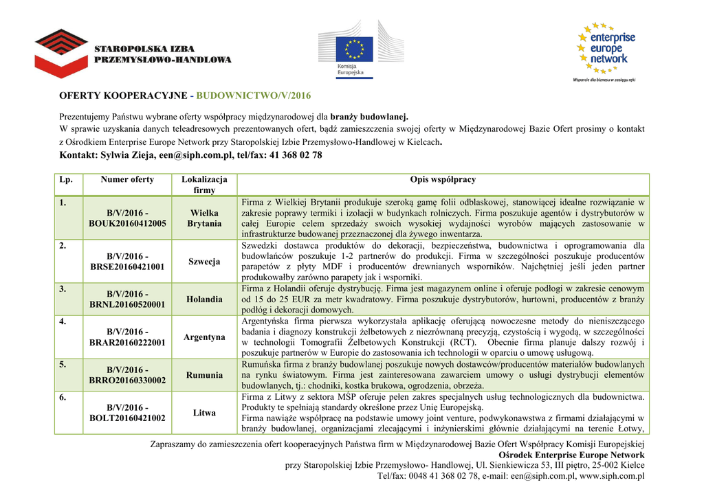 OFERTY KOOPERACYJNE - BUDOWNICTWO/V/2016 Prezentujemy Państwu wybrane oferty współpracy międzynarodowej dla branży budowlanej. W sprawie uzyskania danych teleadresowych prezentowanych ofert, bądź zamieszczenia swojej oferty w Międzynarodowej Bazie Ofert prosimy o kontakt z Ośrodkiem Enterprise Europe Network przy Staropolskiej Izbie Przemysłowo-Handlowej w Kielcach. Kontakt: Sylwia Zieja, [email protected], tel/fax: 41 368 02 78 Lp. Numer oferty Lokalizacja firmy B/V/2016 BOUK20160412005 Wielka Brytania B/V/2016 BRSE20160421001 Szwecja B/V/2016 BRNL20160520001 Holandia B/V/2016 BRAR20160222001 Argentyna B/V/2016 BRRO20160330002 Rumunia B/V/2016 BOLT20160421002 Litwa 1. 2. 3. 4. 5. 6. Opis współpracy Firma z Wielkiej Brytanii produkuje szeroką gamę folii odblaskowej, stanowiącej idealne rozwiązanie w zakresie poprawy termiki i izolacji w budynkach rolniczych. Firma poszukuje agentów i dystrybutorów w całej Europie celem sprzedaży swoich wysokiej wydajności wyrobów mających zastosowanie w infrastrukturze budowanej przeznaczonej dla żywego inwentarza. Szwedzki dostawca produktów do dekoracji, bezpieczeństwa, budownictwa i oprogramowania dla budowlańców poszukuje 1-2 partnerów do produkcji. Firma w szczególności poszukuje producentów parapetów z płyty MDF i producentów drewnianych wsporników. Najchętniej jeśli jeden partner produkowałby zarówno parapety jak i wsporniki. Firma z Holandii oferuje dystrybucję. Firma jest magazynem online i oferuje podłogi w zakresie cenowym od 15 do 25 EUR za metr kwadratowy. Firma poszukuje dystrybutorów, hurtowni, producentów z branży podłóg i dekoracji domowych. Argentyńska firma pierwsza wykorzystała aplikację oferującą nowoczesne metody do nieniszczącego badania i diagnozy konstrukcji żelbetowych z niezrównaną precyzją, czystością i wygodą, w szczególności w technologii Tomografii Żelbetowych Konstrukcji (RCT). Obecnie firma planuje dalszy rozwój i poszukuje partnerów w Europie do zastosowania ich technologii w oparciu o umowę usługową. Rumuńska firma z branży budowlanej poszukuje nowych dostawców/producentów materiałów budowlanych na rynku światowym. Firma jest zainteresowana zawarciem umowy o usługi dystrybucji elementów budowlanych, tj.: chodniki, kostka brukowa, ogrodzenia, obrzeża. Firma z Litwy z sektora MŚP oferuje pełen zakres specjalnych usług technologicznych dla budownictwa. Produkty te spełniają standardy określone przez Unię Europejską. Firma nawiąże współpracę na podstawie umowy joint venture, podwykonawstwa z firmami działającymi w branży budowlanej, organizacjami zlecającymi i inżynierskimi głównie działającymi na terenie Łotwy, Zapraszamy do zamieszczenia ofert kooperacyjnych Państwa firm w Międzynarodowej Bazie Ofert Współpracy Komisji Europejskiej Ośrodek Enterprise Europe Network przy Staropolskiej Izbie Przemysłowo- Handlowej, Ul. Sienkiewicza 53, III piętro, 25-002 Kielce Tel/fax: 0048 41 368 02 78, e-mail: [email protected], www.siph.com.pl Estonii, w krajach Skandynawskich i w całej Europie. 7. B/V/2016 BRLT20160412002 Litwa Litewska firma specjalizuje się w dostarczaniu urządzeń do łazienek prywatnych i publicznych toalet, jak również akcesoriów przeznaczonych do tego typu wnętrz. Firma poszukuje dostawców relaksacyjnych kapsuł SPA. Firma jest zainteresowana zawarciem umowy dystrybucyjnej w celu rozszerzenia swojej linii produktów i dystrybucji tych produktów na Litwie. Zapraszamy do zamieszczenia ofert kooperacyjnych Państwa firm w Międzynarodowej Bazie Ofert Współpracy Komisji Europejskiej Ośrodek Enterprise Europe Network przy Staropolskiej Izbie Przemysłowo- Handlowej, Ul. Sienkiewicza 53, III piętro, 25-002 Kielce Tel/fax: 0048 41 368 02 78, e-mail: [email protected], www.siph.com.pl