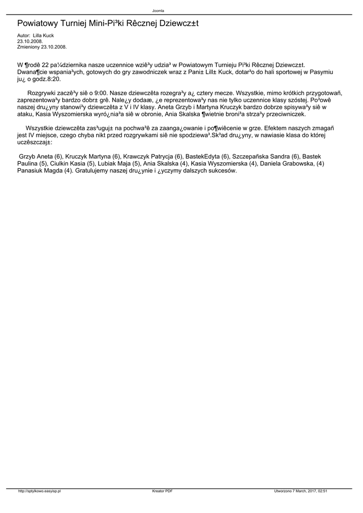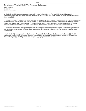 Joomla Powiatowy Turniej Mini-Pi³ki Rêcznej Dziewcz±t Autor: Lilla Kuck 23.10.2008. Zmieniony 23.10.2008. W ¶rodê 22 pa¼dziernika nasze uczennice wziê³y udzia³ w Powiatowym Turnieju Pi³ki Rêcznej Dziewcz±t. Dwana¶cie wspania³ych, gotowych do gry zawodniczek wraz z Pani± Lill± Kuck, dotar³o do hali sportowej w Pasymiu ju¿ o godz.8:20. Rozgrywki zaczê³y siê o 9:00. Nasze dziewczêta rozegra³y a¿ cztery mecze. Wszystkie, mimo krótkich przygotowañ, zaprezentowa³y bardzo dobr± grê. Nale¿y dodaæ, ¿e reprezentowa³y nas nie tylko uczennice klasy szóstej. Po³owê naszej dru¿yny stanowi³y dziewczêta z V i IV klasy. Aneta Grzyb i Martyna Kruczyk bardzo dobrze spisywa³y siê w ataku, Kasia Wyszomierska wyró¿nia³a siê w obronie, Ania Skalska ¶wietnie broni³a strza³y przeciwniczek. Wszystkie dziewczêta zas³uguj± na pochwa³ê za zaanga¿owanie i po¶wiêcenie w grze. Efektem naszych zmagañ jest IV miejsce, czego chyba nikt przed rozgrywkami siê nie spodziewa³.Sk³ad dru¿yny, w nawiasie klasa do której uczêszczaj±: Grzyb Aneta (6), Kruczyk Martyna (6), Krawczyk Patrycja (6), BastekEdyta (6), Szczepañska Sandra (6), Bastek Paulina (5), Ciulkin Kasia (5), Lubiak Maja (5), Ania Skalska (4), Kasia Wyszomierska (4), Daniela Grabowska, (4) Panasiuk Magda (4). Gratulujemy naszej dru¿ynie i ¿yczymy dalszych sukcesów. http://sptylkowo.easyisp.pl Kreator PDF Utworzono 7 March, 2017, 02:51