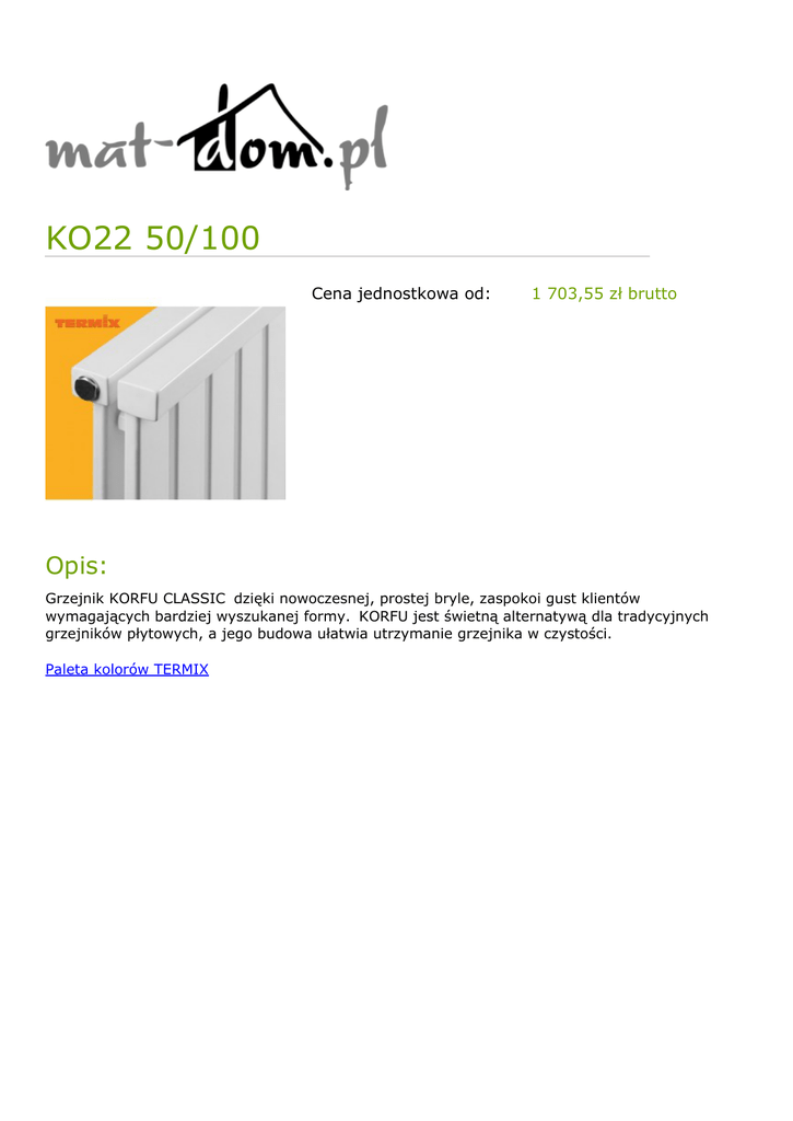 KO22 50/100 Cena jednostkowa od: 1 703,55 zł brutto Opis: Grzejnik KORFU CLASSIC dzięki nowoczesnej, prostej bryle, zaspokoi gust klientów wymagających bardziej wyszukanej formy. KORFU jest świetną alternatywą dla tradycyjnych grzejników płytowych, a jego budowa ułatwia utrzymanie grzejnika w czystości. Paleta kolorów TERMIX Powered by TCPDF (www.tcpdf.org)