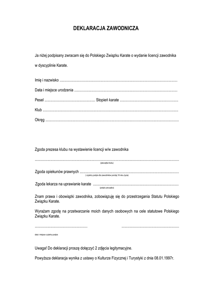 DEKLARACJA ZAWODNICZA Ja niżej podpisany zwracam się do Polskiego Związku Karate o wydanie licencji zawodnika w dyscyplinie Karate. Imię i nazwisko ......................................................................................................................... Data i miejsce urodzenia .......................................................................................................... Pesel .................................................... Stopień karate ............................................................ Klub ........................................................................................................................................... Okręg ......................................................................................................................................... Zgoda prezesa klubu na wystawienie licencji w/w zawodnika .................................................................................................................................................... (pieczątka klubu) Zgoda opiekunów prawnych ...................................................................................................... ( czytelny podpis dla zawodników poniżej 18 roku życia) Zgoda lekarza na uprawianie karate ........................................................................................ (podpis pieczątka) Znam prawa i obowiązki zawodnika, zobowiązuję się do przestrzegania Statutu Polskiego Związku Karate. Wyrażam zgodę na przetwarzanie moich danych osobowych na cele statutowe Polskiego Związku Karate. ...................................................... ........................................................... data i miejsce czytelny podpis Uwaga! Do deklaracji proszę dołączyć 2 zdjęcia legitymacyjne. Powyższa deklaracja wynika z ustawy o Kulturze Fizycznej i Turystyki z dnia 08.01.1997r.