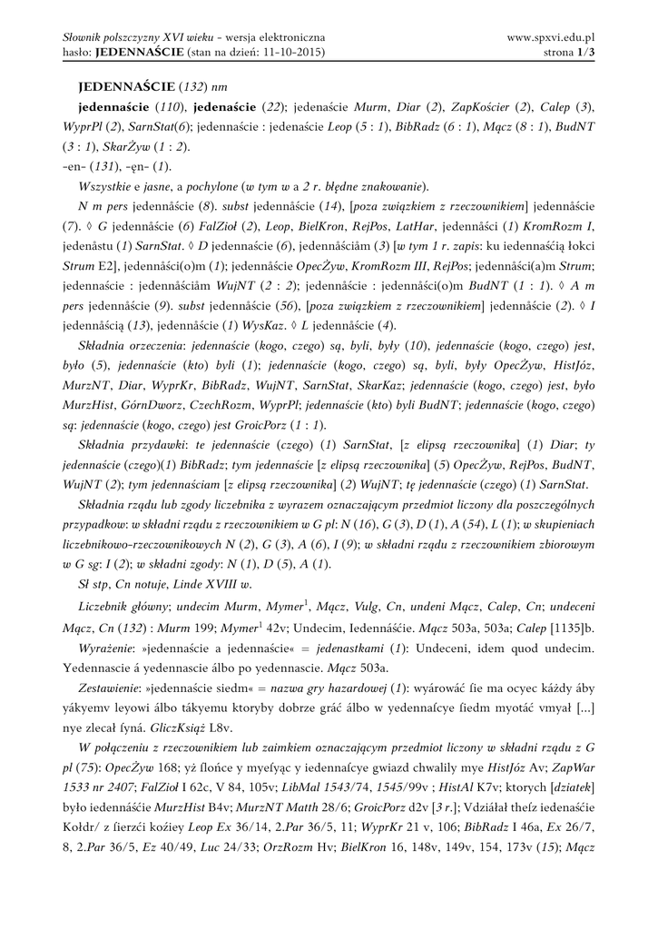 Słownik polszczyzny XVI wieku - wersja elektroniczna hasło: JEDENNAŚCIE (stan na dzień: 11-10-2015) www.spxvi.edu.pl strona 1/3 JEDENNAŚCIE (132) nm jedennaście (110), jedenaście (22); jedenaście Murm, Diar (2), ZapKościer (2), Calep (3), WyprPl (2), SarnStat(6); jedennaście : jedenaście Leop (5 : 1), BibRadz (6 : 1), Mącz (8 : 1), BudNT (3 : 1), SkarŻyw (1 : 2). -en- (131), -ęn- (1). Wszystkie e jasne, a pochylone (w tym w a 2 r. błędne znakowanie). N m pers jedennåście (8). subst jedennåście (14), [poza związkiem z rzeczownikiem] jedennåście (7). ◊ G jedennåście (6) FalZioł (2), Leop, BielKron, RejPos, LatHar, jedennåści (1) KromRozm I, jedenåstu (1) SarnStat. ◊ D jedennaście (6), jedennåściåm (3) [w tym 1 r. zapis: ku iedennaśćią łokci Strum E2], jedennåści(o)m (1); jedennåście OpecŻyw, KromRozm III, RejPos; jedennåści(a)m Strum; jedennaście : jedennåściåm WujNT (2 : 2); jedennåście : jedennåści(o)m BudNT (1 : 1). ◊ A m pers jedennåście (9). subst jedennåście (56), [poza związkiem z rzeczownikiem] jedennåście (2). ◊ I jedennåścią (13), jedennåście (1) WysKaz. ◊ L jedennåście (4). Składnia orzeczenia: jedennaście (kogo, czego) są, byli, były (10), jedennaście (kogo, czego) jest, było (5), jedennaście (kto) byli (1); jedennaście (kogo, czego) są, byli, były OpecŻyw, HistJóz, MurzNT, Diar, WyprKr, BibRadz, WujNT, SarnStat, SkarKaz; jedennaście (kogo, czego) jest, było MurzHist, GórnDworz, CzechRozm, WyprPl; jedennaście (kto) byli BudNT; jedennaście (kogo, czego) są: jedennaście (kogo, czego) jest GroicPorz (1 : 1). Składnia przydawki: te jedennaście (czego) (1) SarnStat, [z elipsą rzeczownika] (1) Diar; ty jedennaście (czego)(1) BibRadz; tym jedennaście [z elipsą rzeczownika] (5) OpecŻyw, RejPos, BudNT, WujNT (2); tym jedennaściam [z elipsą rzeczownika] (2) WujNT; tę jedennaście (czego) (1) SarnStat. Składnia rządu lub zgody liczebnika z wyrazem oznaczającym przedmiot liczony dla poszczególnych przypadkow: w składni rządu z rzeczownikiem w G pl: N (16), G (3), D (1), A (54), L (1); w skupieniach liczebnikowo-rzeczownikowych N (2), G (3), A (6), I (9); w składni rządu z rzeczownikiem zbiorowym w G sg: I (2); w składni zgody: N (1), D (5), A (1). Sł stp, Cn notuje, Linde XVIII w. Liczebnik główny; undecim Murm, Mymer1, Mącz, Vulg, Cn, undeni Mącz, Calep, Cn; undeceni Mącz, Cn (132) : Murm 199; Mymer1 42v; Undecim, Iedennáśćie. Mącz 503a, 503a; Calep [1135]b. Wyrażenie: »jedennaście a jedennaście« = jedenastkami (1): Undeceni, idem quod undecim. Yedennascie á yedennascie álbo po yedennascie. Mącz 503a. Zestawienie: »jedennaście siedm« = nazwa gry hazardowej (1): wyárowáć ſie ma ocyec káżdy áby yákyemv leyowi álbo tákyemu ktoryby dobrze gráć álbo w yedennaſcye ſiedm myotáć vmyał [...] nye zlecał ſyná. GliczKsiąż L8v. W połączeniu z rzeczownikiem lub zaimkiem oznaczającym przedmiot liczony w składni rządu z G pl (75): OpecŻyw 168; yż ſlońce y myeſyąc y iedennaſcye gwiazd chwalily mye HistJóz Av; ZapWar 1533 nr 2407; FalZioł I 62c, V 84, 105v; LibMal 1543/74, 1545/99v ; HistAl K7v; ktorych [dziatek] było iedennáśćie MurzHist B4v; MurzNT Matth 28/6; GroicPorz d2v [3 r.]; Vdziáłał theſz iedenaśćie Kołdr/ z ſierzći koźiey Leop Ex 36/14, 2.Par 36/5, 11; WyprKr 21 v, 106; BibRadz I 46a, Ex 26/7, 8, 2.Par 36/5, Ez 40/49, Luc 24/33; OrzRozm Hv; BielKron 16, 148v, 149v, 154, 173v (15); Mącz Słownik polszczyzny XVI wieku - wersja elektroniczna hasło: JEDENNAŚCIE (stan na dzień: 11-10-2015) www.spxvi.edu.pl strona 2/3 17c, 503a; GórnDworz P3v [2 r.]; tu iáko ſłyſzyſz s pewnych á prawdziwych iedennaſcie ſwiádkow RejPos 120v, 111v; BiałKat 131 [2 r.]; RejPosWstaw [1433]; BudBib Gen 32/22, 2.Par 36/5, 11, Ier 52/1, 3.Esdr 1/45; Kiedyby miał budowáć Groblą ku iedennaśćią łokći/ álbo ku dwunaśći/ y wyżéy. Strum E2, F4; CzechRozm 136; SkarŻyw 107, 583; StryjKron 310, 350; ZapKościer 1585/53v, 61; Calep [1135]b [2 r.]; Phil D; WyprPl A2, B2v; LatHar 504, 509, 510; Lecz iedennáśćie vczniow ſzli do Gálileiey WujNT Matth 28/16, Luc 24/33, Act 1/26. W składni rządu z G sg rzeczownika zbiorowego (2): Brat Henrik Dughe z iedennaſcią Bráciey [zabit]. StryjKron 325, 325. W składni zgody (7): vkázál ſie ſwym iedennáſcie vcżennikom ſiedzącym wonym palátzu OpecŻyw 172v; [Uczniowie z Emaus] naleźli zgromadzoné iedennaście/ i ty ktorzy znimi byli MurzNT Luc 24/33; KromRozm III N3v; A był wneth policżon dwunaſthym zwolennikiem ku onym iedennaſcie pirwſzym. RejPos 287v; iedennaśćie vcżniowie ſzli do Galileie BudNT Matth 28/16, Mar 16/14; WujNT Mar 16/14. Z elipsą wyrazu oznaczającego przedmiot liczony oraz w połączeniu z rzeczownikiem o tej samej końcówce dla N i G pl (19): á to maſz cżynić do iedennaſcie dni FalZioł I 116d, III 2d; Diar 95 [2 r.]; Ale ſtoiąc Piotr z iedennaśćią/ podnioſl głoſu ſwego Leop ZZ3v, Ex 26/7, 1.Cor 15/5; Haeredem facere ex deunce, Yedenaśćie częśći ymienia ſwego komu dáć Mącz 152b, 503a [2 r.]; BudNT Act 2/14, 1.Cor 15/5; SkarŻyw 580; á to Pan po wiecżerzy przy iedennaśćie tylko mowił CzechEp 163; WujNT 184, Luc 24/9, Act 2/14, 1.Cor 15/5; SkarKaz 207a. W charakterystycznych połączeniach: jedennaście apostołow, apostołowie (3), braciej (2), bratow, bram, części, dni (4), dziatek, dzieci, giezłek, groszy, grzywien, gwiazd(2), kołdr(y) (2), kortyn, kościołow, lat (23), łańcuszkow, łokci (łokiet) (3), miesięcy (3), mil, mostow, opow (2), pieniędzy (2), piłuł (2), pojazd, przysiężnikow (2), razow (2), rzędow, snopow, świadkow, talarow, uczniow, uczniowie, uczennicy (4), ziarn, złotych (3), zwolen(n)ikow (4). Zestawienia liczebnikowe (21): Ze spójnikiem „i” (2): setki i dziesiątki (1): Zydowie liczą [...] pod ſędźmi od Iozuego áż do Sámſoná ſto y iedenaśćie lat BibRadz I 418v m