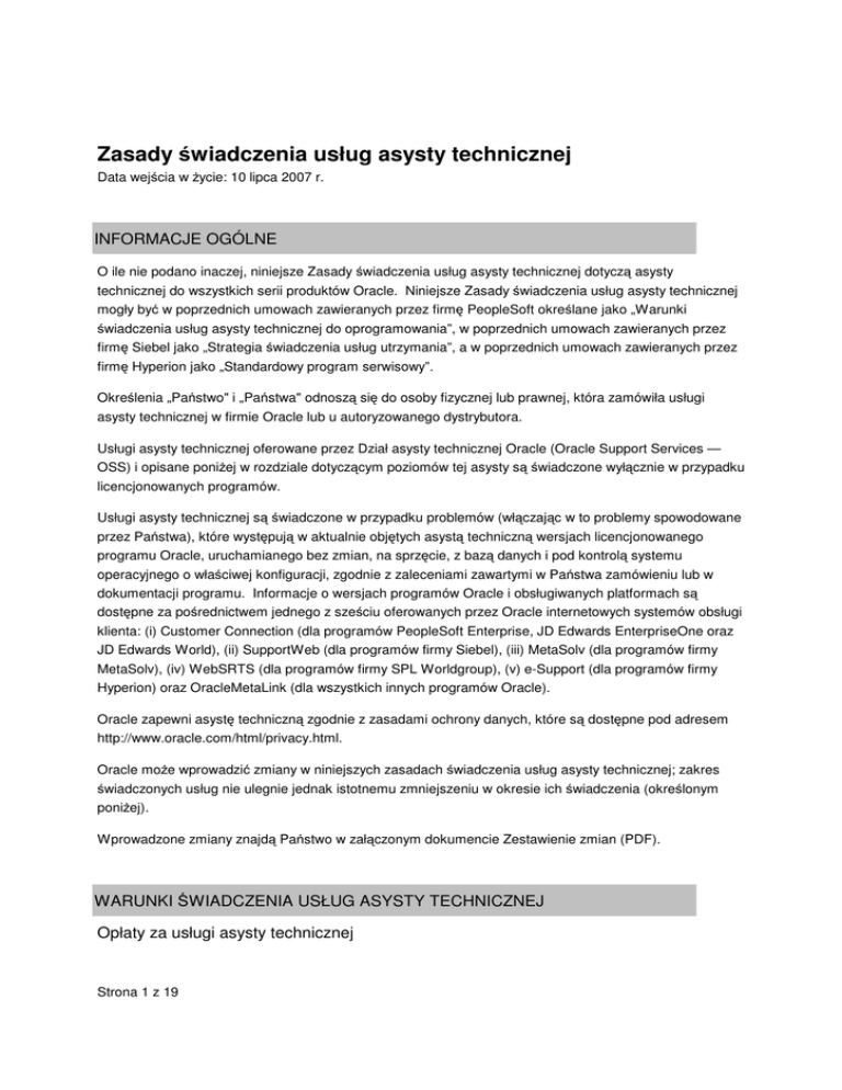 Zasady świadczenia usług asysty technicznej Data wejścia w życie: 10 lipca 2007 r. INFORMACJE OGÓLNE O ile nie podano inaczej, niniejsze Zasady świadczenia usług asysty technicznej dotyczą asysty technicznej do wszystkich serii produktów Oracle. Niniejsze Zasady świadczenia usług asysty technicznej mogły być w poprzednich umowach zawieranych przez firmę PeopleSoft określane jako „Warunki świadczenia usług asysty technicznej do oprogramowania”, w poprzednich umowach zawieranych przez firmę Siebel jako „Strategia świadczenia usług utrzymania”, a w poprzednich umowach zawieranych przez firmę Hyperion jako „Standardowy program serwisowy”. Określenia „Państwo" i „Państwa" odnoszą się do osoby fizycznej lub prawnej, która zamówiła usługi asysty technicznej w firmie Oracle lub u autoryzowanego dystrybutora. Usługi asysty technicznej oferowane przez Dział asysty technicznej Oracle (Oracle Support Services — OSS) i opisane poniżej w rozdziale dotyczącym poziomów tej asysty są świadczone wyłącznie w przypadku licencjonowanych programów. Usługi asysty technicznej są świadczone w przypadku problemów (włączając w to problemy spowodowane przez Państwa), które występują w aktualnie objętych asystą techniczną wersjach licencjonowanego programu Oracle, uruchamianego bez zmian, na sprzęcie, z bazą danych i pod kontrolą systemu operacyjnego o właściwej konfiguracji, zgodnie z zaleceniami zawartymi w Państwa zamówieniu lub w dokumentacji programu. Informacje o wersjach programów Oracle i obsługiwanych platformach są dostępne za pośrednictwem jednego z sześciu oferowanych przez Oracle internetowych systemów obsługi klienta: (i) Customer Connection (dla programów PeopleSoft Enterprise, JD Edwards EnterpriseOne oraz JD Edwards World), (ii) SupportWeb (dla programów firmy Siebel), (iii) MetaSolv (dla programów firmy MetaSolv), (iv) WebSRTS (dla programów firmy SPL Worldgroup), (v) e-Support (dla programów firmy Hyperion) oraz OracleMetaLink (dla wszystkich innych programów Oracle). Oracle zapewni asystę techniczną zgodnie z zasadami ochrony danych, które są dostępne pod adresem http://www.oracle.com/html/privacy.html. Oracle może wprowadzić zmiany w niniejszych zasadach świadczenia usług asysty technicznej; zakres świadczonych usług nie ulegnie jednak istotnemu zmniejszeniu w okresie ich świadczenia (określonym poniżej). Wprowadzone zmiany znajdą Państwo w załączonym dokumencie Zestawienie zmian (PDF). WARUNKI ŚWIADCZENIA USŁUG ASYSTY TECHNICZNEJ Opłaty za usługi asysty technicznej Strona 1 z 19 Opłaty za usługi asysty technicznej wnosi się co roku, przed rozpoczęciem okresu świadczenia usług, chyba że stwierdzono inaczej we właściwym dokumencie zamówienia lub w umowie dotyczącej zasad finansowania lub regulowania płatności zawartej z firmą Oracle lub jednym z jej podmiotów stowarzyszonych. Do uwierzytelnienia zamówienia asysty technicznej w firmie Oracle wymagane jest Państwa zobowiązanie zapłaty (np. zlecenie zakupu, faktyczna wpłata lub inna przyjęta metoda płatności). Faktura zostanie wystawiona dopiero po otrzymaniu od Państwa zobowiązania zapłaty. Zostanie ona wysłana na jeden wskazany przez Państwa adres korespondencyjny. Nieuregulowanie płatności w terminie spowoduje zaprzestanie świadczenia usług. Okres świadczenia usług asysty technicznej Okres świadczenia usług asysty technicznej rozpoczyna się w dniu wejścia w życie Państwa dokumentu zamówienia, chyba że w tym dokumencie stwierdzono inaczej. Jeśli zamówienie złożono za pośrednictwem sklepu Oracle Store, nabiera ono mocy w dniu jego akceptacji przez firmę Oracle. Jeśli w dokumencie zamówienia nie stwierdzono inaczej, warunki świadczenia usług asysty technicznej, łącznie z cenami, odnoszą się do okresu 12 miesięcy (zwanego dalej „okresem świadczenia usług”). Usług asysty technicznej zamówionych na okres świadczenia usług nie można anulować, nie można również uzyskać zwrotu dotyczących ich opłat. Firma Oracle nie jest zobowiązana do udzielania asysty technicznej po zakończeniu okresu świadczenia usług, o ile umowa dotycząca asysty technicznej nie zostanie przedłużona w dniu wygaśnięcia lub wcześniej. Pakiet licencji Pakiet licencji składa się z (i) wszystkich posiadanych przez Państwa licencji na program, (ii) licencji na programy zawierające ten sam kod źródłowy*, (iii) licencji na programy, które obejmują opcję lub program Enterprise Manager określone w cenniku (np. Database Enterprise Edition i Enterprise Edition Options; Database Enterprise Edition i Diagnostics Pack; Purchasing i Purchasing Options) oraz (iv) licencji na programy, które zawierają moduł samoobsługi wymieniony w cenniku, np. Human Resources i Self-Service Human Resources (Kadry i Kadry — samoobsługa). Definicja pakietu licencji nie obejmuje licencji na tworzenie oprogramowania i licencji demonstracyjnych dostępnych w ramach programu dla partnerów Oracle Partner Network lub za pośrednictwem serwisu internetowego Oracle Technology Network. * Programy zawierające ten sam kod źródłowy to: • Database Enterprise Edition, Database Standard Edition, Database Standard Edition One i Personal Edition; oraz • Application Server Enterprise Edition, Application Server Standard Edition i Application Server Java Edition. Zgodność poziomów usług W przypadku zakupu usług asysty technicznej wszystkie licencje w danym pakiecie muszą być objęte tym samym poziomem tych usług (np. Podstawowymi usługami asysty technicznej ‘Software Update License & Support’ lub nie podlegać asyście technicznej). Nie mogą Państwo objąć usługami asysty technicznej Strona 2 z 19 tylko części licencji wchodzących w skład pakietu — pakiet licencji musi zostać zmniejszony przez rezygnację z licencji nieobjętych usługami asysty technicznej. Rezygnację z licencji muszą Pań