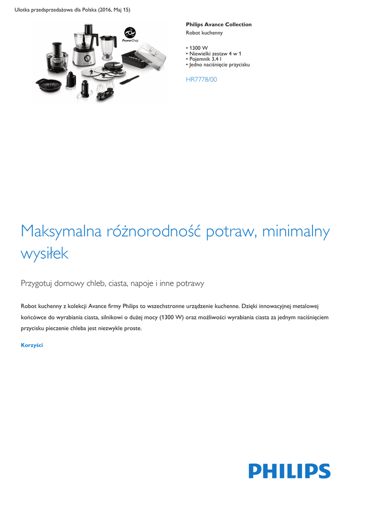 Ulotka przedsprzedażowa dla Polska (2016, Maj 15) Philips Avance Collection Robot kuchenny • 1300 W • Niewielki zestaw 4 w 1 • Pojemnik 3,4 l • Jedno naciśnięcie przycisku HR7778/00 Maksymalna różnorodność potraw, minimalny wysiłek Przygotuj domowy chleb, ciasta, napoje i inne potrawy Robot kuchenny z kolekcji Avance firmy Philips to wszechstronne urządzenie kuchenne. Dzięki innowacyjnej metalowej końcówce do wyrabiania ciasta, silnikowi o dużej mocy (1300 W) oraz możliwości wyrabiania ciasta za jednym naciśnięciem przycisku pieczenie chleba jest niezwykle proste. Korzyści Avance Collection Pieczenie chleba i ciast stało się bardzo proste • Podwójna, metalowa końcówka do ubijania śmietany i białek • Metalowa końcówka do wyrabiania ciasta zapewnia idealne ciasto na chleb • Część tnąca do miksowania i mieszania ciasta Pewna regulacja mocy i prędkości • Technologia PowerChop zapewnia doskonałe siekanie • Ciasto na chleb, ubijanie i lód po jednym naciśnięciu przycisku • Akcesoria można czyścić w zmywarce • Pojemnik 3,4 l i dzbanek blendera 2,2 l pozwalają przygotować rodzinne porcje Starannie dobrane akcesoria zapewniają doskonałe rezultaty • Tarcze ze stali szlachetnej do siekania, szatkowania, rozdrabniania i frytek • Wyciskarka do cytrusów i sokowirówka odśr. z metal. siateczką (6 szkl. soku) Łatwe korzystanie i czyszczenie bez wysiłku • Tarcze XXL o średnicy 18 cm umożliwiają szybsze przetworzenie wszystkich składników Cechy Podwójna, metalowa końcówka do ubijania Jedno naciśnięcie przycisku Podwójna, metalowa końcówka do ubijania włączana jednym naciśnięciem przycisku ubija białka (ich objętość wzrasta do 600%) i śmietanę (jej objętość wzrasta do 200%). Przygotowywanie pysznych deserów nigdy nie było tak proste! Oprócz 12 ustawianych ręcznie prędkości i ustawienia pulsacyjnego robot kuchenny Avance jest wyposażony w 3 automatyczne przyciski. Aby ich użyć, wystarczy ustawić pokrętło w pozycji „ON” i nacisnąć jeden z przycisków. Silnik automatycznie ustawi odpowiednią prędkość i automatyczne funkcje pulsacyjne, aby uzyskać najlepsze rezultaty. Innowacyjna metalowa końcówka do wyrabiania ciasta Tarcze XXL umożliwiające szybsze wykonanie pracy Dzięki tarczom XXL o średnicy 18 cm robot kuchenny firmy Philips umożliwia szybsze wykonanie pracy, zapewniając tym samym oszczędność czasu i wysiłku podczas gotowania. Akcesoria można czyścić w zmywarce Dzięki silnikowi o dużej mocy ta metalowa końcówka szybko formuje kulę ciasta z poszczególnych składników. Po uformowaniu ciasta innowacyjna końcówka wyrabia je z odpowiednią siłą, aby otrzymać smaczny chleb. Część tnąca Technologia PowerChop Wszystkie akcesoria robota kuchennego Philips znajdujące się w zestawie można myć w zmywarce. Pojemnik 3,4 l i blender 2,2 l Technologia PowerChop to połączenie kształtu ostrza, kąta cięcia i wewnętrznego pojemnika, które daje idealny efekt siekania zarówno miękkich, jak i twardych składników, a także sprawdza się doskonale podczas przygotowywania przecierów oraz mieszania ciasta! Duży pojemnik umożliwia przetwarzanie maksymalnych ilości składników jednocześnie, np. do 7 porcji zupy, 7 białek lub 1,7 kg ciasta. Ponadto w blenderze o pojemności 2,2 l można za jednym razem przygotować do 5 porcji koktajlu. Dane wkrótce ulegną zmianie 2016, Maj 15 Avance Collection 4 tarcze ze stali szlachetnej Sokowirówka odśrodkowa na 6 szklanek napoju Ten robot kuchenny jest wyposażony w 4 dodatkowe tarcze ze stali szlachetnej: 1 dwustronną tarczę do rozdrabniania (na drobno i na grubo) do wszelkich rodzajów warzyw, 1 tarczę rozdrabniającą do sera i ziemniaków, 1 tarczę do krojenia warzyw w cienkie słupki i 1 tarczę do krojenia ziemniaków na frytki. Ten robot kuchenny jest wyposażony w profesjonalne akcesoria do wyciskania soku. Duży otwór na produkty i opatentowany, duży, metalowy filtr siatkowy zapewniają nawet o 200% szybsze wyciskanie soku w porównaniu z innymi robotami kuchennymi z sokowirówką. Opatentowany filtr z mikrosiateczką ze stali szlachetnej pozwala wycisnąć sok do ostatniej kropli. Ergonomiczna konstrukcja zapewnia szybkie czyszczenie i wygodne przechowywanie urządzenia. Specyfikacje Prosimy pamiętać, że jest to ulotka przedsprzedażowa. Treść ulotki jest zgodna z naszą najlepszą wiedzą w momencie publikacji i w odniesieniu do danego kraju (podane powyżej). Treść ulotki może ulec zmianie bez powiadomienia. Firma Philips nie ponosi odpowiedzialności za treść ulotki. Akcesoria Dołączone Część tnąca z ostrzem „S” Wyciskarka do cytrusów Narzędzie do czyszczenia Narzędzie do szatkowania na grubo Narzędzie do siekania na grubo Podwójna trzepaczka Narzędzie do szatkowania na drobno Narzędzie do siekania na drobno Narzędzie robota kuchennego Dzbanek Narzędzie do wyrabiania ciasta Dwustronna tarcza Łopatka Informacje ogólne Regulowane tarcze do krojenia Funkcje Liczba ustawień prędkości Charakterystyka produktu 1–7 mm 32+ 12 + pulsacyjna Możliwość mycia w zmywarce Wbudowany schowek na przewód Stopy antypoślizgowe Wyłącznik Impulsowe Schowek Dane techniczne Moc Napięcie Częstotliwość Długość przewodu Pojemność pojemnika Pojemność dzbanka Obr./min — blender (maks.) Obr./min — pojemnik (maks.) Wykończenie Materiał akcesoriów Materiał dzbanka Materiał korpusu Stal szlachetna/plastik Tworzywo SAN Stal szlachetna Waga i wymiary Wymiary produktu (D x S x W) 289 x 254 x 436 mm Wymiary opakowania Wysokość Szerokość Głębokość Waga netto Waga brutto EAN Liczba produktów w zestawie Kraj pochodzenia Kod towaru według Systemu Zharmonizowanego (HS) 49,50 cm 59,00 cm 39,00 cm 8,72 kg 11,17 kg 08710103587224 1 CN 850940 Karton zewnętrzny Długość Szerokość Wysokość Waga brutto EAN Liczba opakowań konsumenckich 1300 W 220–240 V 50/60 Hz 1,2 m