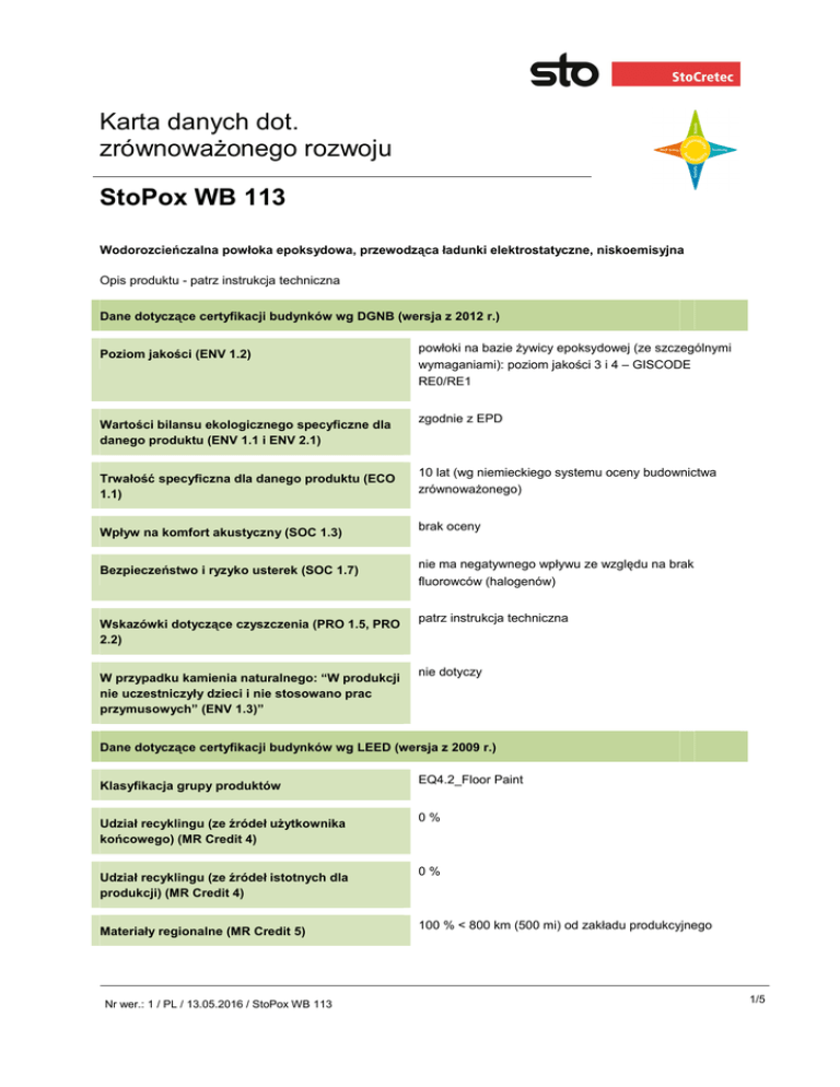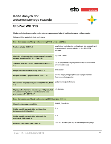 Karta danych dot. zrównoważonego rozwoju StoPox WB 113