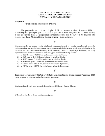 U C H W A Ł A NR 419/XLI/14 RADY MIEJSKIEJ GMINY ŚLESIN Z DNIA 31 MARCA 2014 ROKU w sprawie ustanowienia służebności przesyłu Na podstawie art. 18 ust. 2 pkt. 9 lit. a ustawy z dnia 8 marca 1990 r. o samorządzie gminnym (Dz. U. z 2013 r. poz. 594 z późn. zm.) oraz art. 13 ust.1 ustawy z dnia 21 sierpnia 1997 r. o gospodarce nieruchomościami (Dz. U. z 2010 r. Nr 102 poz. 651 z późn. zm.) Rada Miejska Gminy Ślesin u c h w a l a, co następuje: §1 Wyraża zgodę na ustanowienie odpłatnej, nieograniczonej w czasie służebności przesyłu polegającej na prawie do korzystania z nieruchomości obciążanych w zakresie niezbędnym do budowy na nich telekomunikacyjnej linii kablowej wraz z kanalizacją kablową, na niżej wymienionych nieruchomościach stanowiących własność Gminy Ślesin: 1) nr 533/2 o pow. 0,2972 ha, położona w mieście Ślesin, 2) nr 663 o pow. 2,4388 ha, położona w mieście Ślesin, 3) nr 1187 o pow. 0,5137 ha, położona w mieście Ślesin, 4) nr 1188/1 o pow. 1,5000 ha, położona w mieście Ślesin, 5) nr 79/1 o pow. 0,0010 ha, położona w obrębie Ignacewo, 6) nr 80/1 o pow. 0,0098 ha, położona w obrębie Ignacewo. §2 Traci moc uchwała nr 330/XXXIV/13 Rady Miejskiej Gminy Ślesin z dnia 27 czerwca 2013 roku w sprawie ustanowienia służebności przesyłu. §3 Wykonanie uchwały powierza się Burmistrzowi Miasta i Gminy Ślesin. §4 Uchwała wchodzi w życie z dniem podjęcia. UZASADNIENIE do uchwały nr 419/XLI/14 Rady Miejskiej Gminy Ślesin z dnia 31 marca 2014 roku w sprawie ustanowienia służebności przesyłu Wielkopolska Sieć Szerokopasmowa S.A. jako Inwestor zwróciła się z wnioskiem o wyrażenie zgody na umieszczenie w działkach stanowiących własność Gminy Ślesin kabla optotelekomunikacyjnego oraz urządzeń dla linii światłowodowej, w związku z budową kablowej linii światłowodowej relacji Ślesin – Sompolno, Sławoszewek – Ślesin, Ślesin – Wiśniewa. Wobec powyższego konieczne jest ustanowienie odpłatnej służebności przesyłu na nieruchomościach położonych w obrębie miasta Ślesin oznaczonych nr 533/2, 663, 1187 i 1188/1 oraz położonych w obrębie Ignacewo oznaczonych nr 79/1 i 80/1. W związku ze zmianą Inwestora z INEA S.A. na rzecz Wielkopolska Sieć Szerokopasmowa S.A. traci moc uchwała nr 330/XXXIV/13 Rady Miejskiej Gminy Ślesin z dnia 27 czerwca 2013 roku w sprawie ustanowienia służebności przesyłu. W związku z powyższym podjęcie niniejszej uchwały jest uzasadnione.